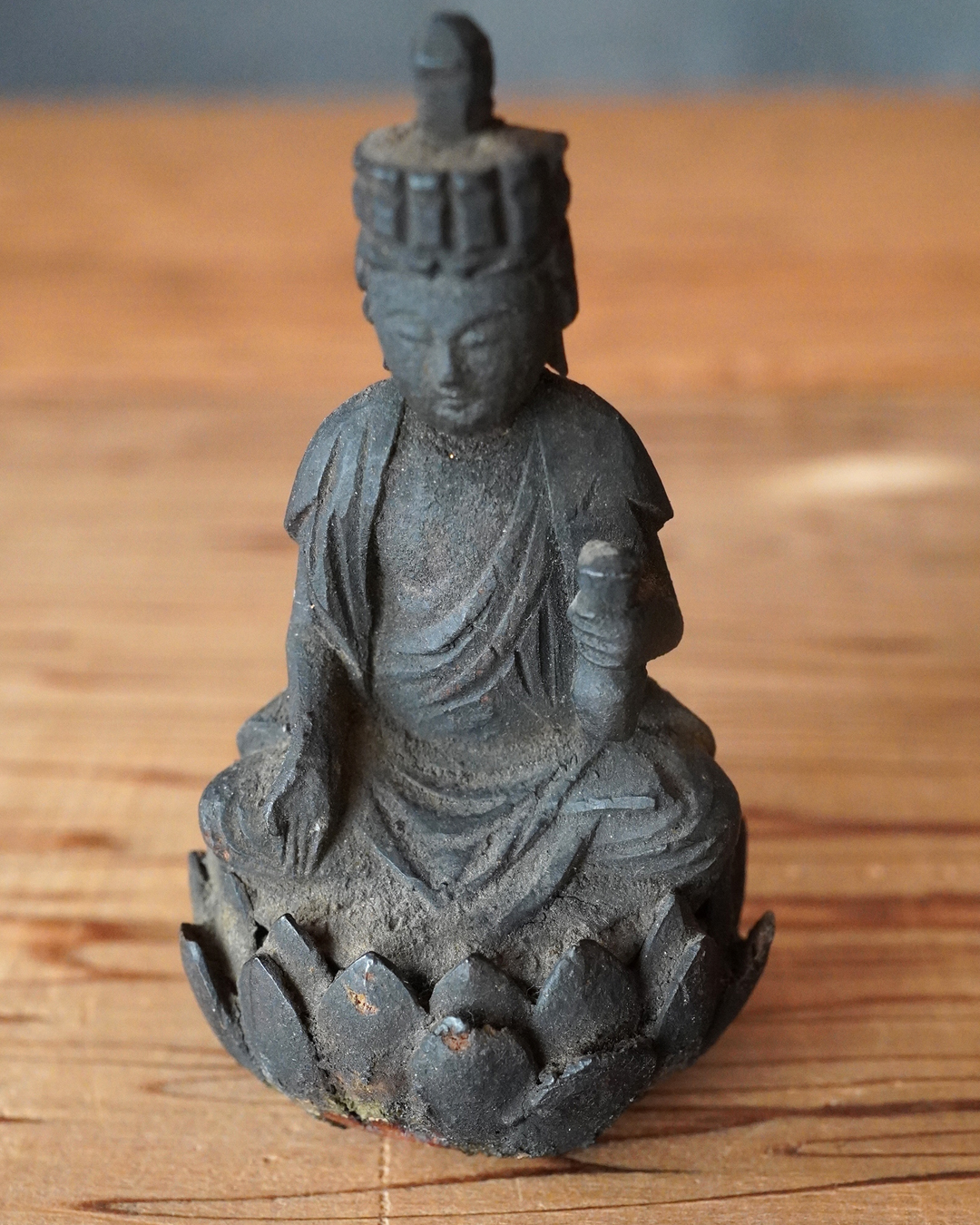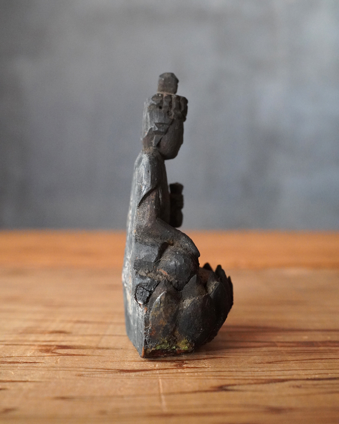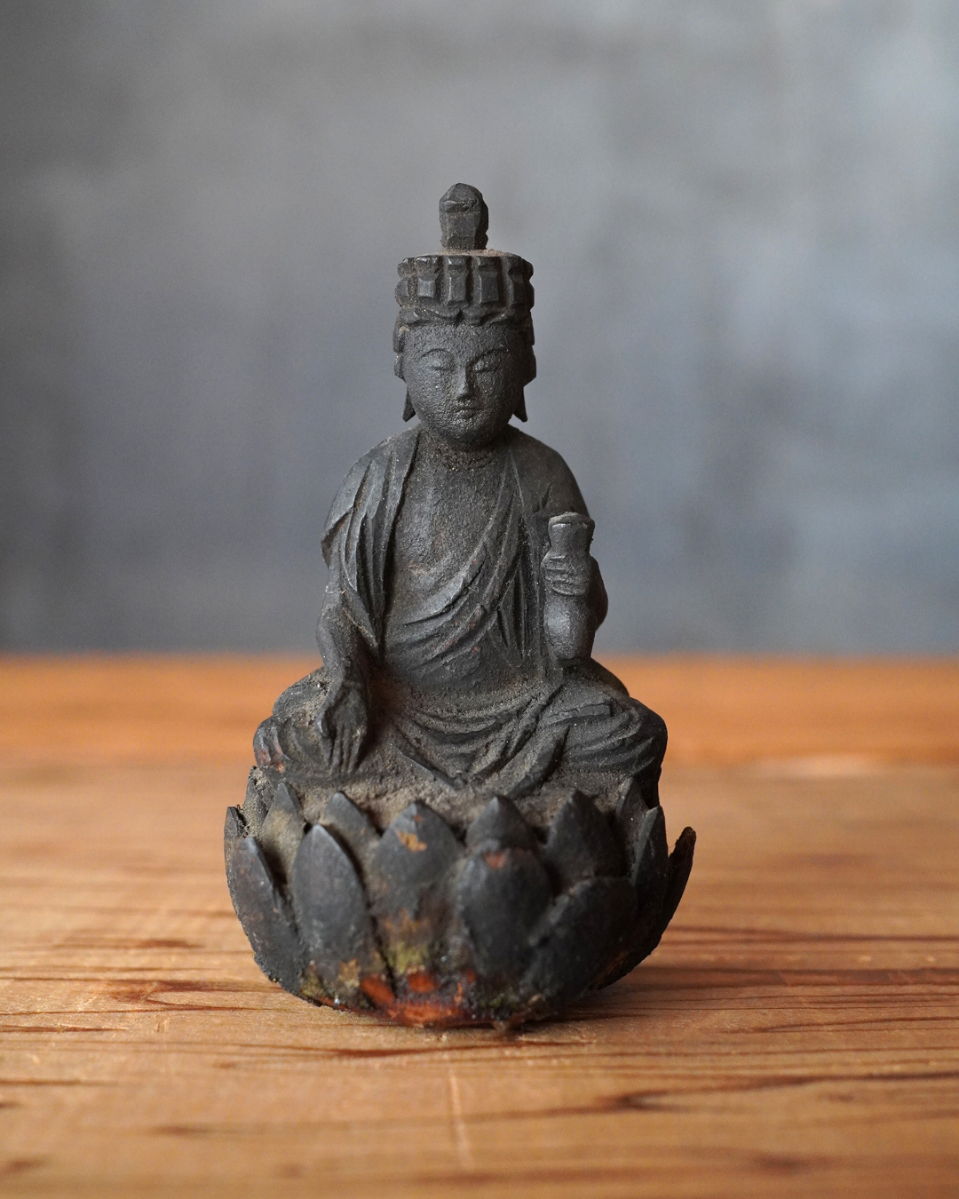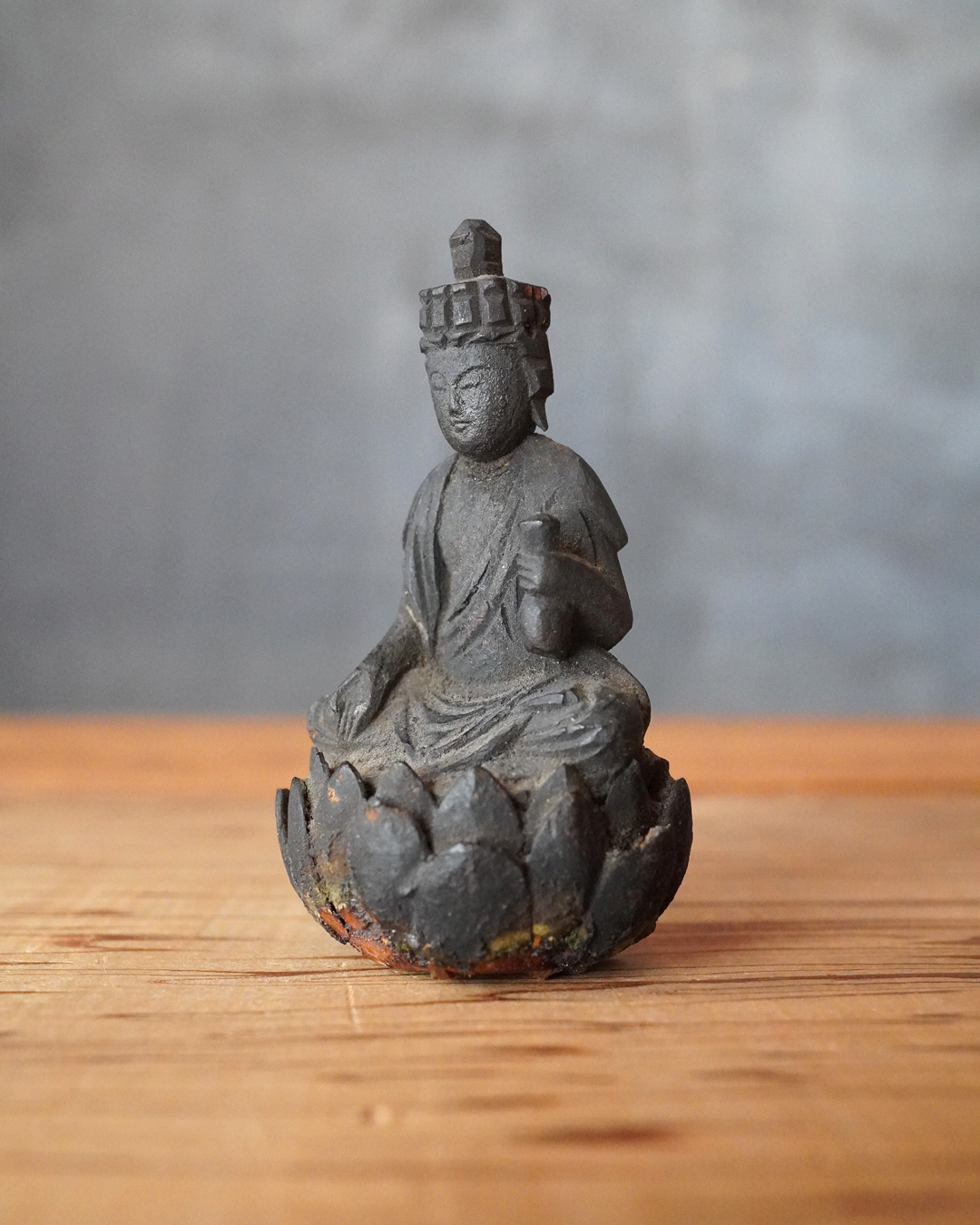 蓮座には蓮弁の欠損など時代相応の傷みが見受けられますが、像容を損なうものではなく、穏和で静謐な表情は今なお健在です。座辺に置き、日々の観賞や念持にふさわしい仏像でしょう。時代相応の経年変化はございますので画像をご確認上ご注文下さい。