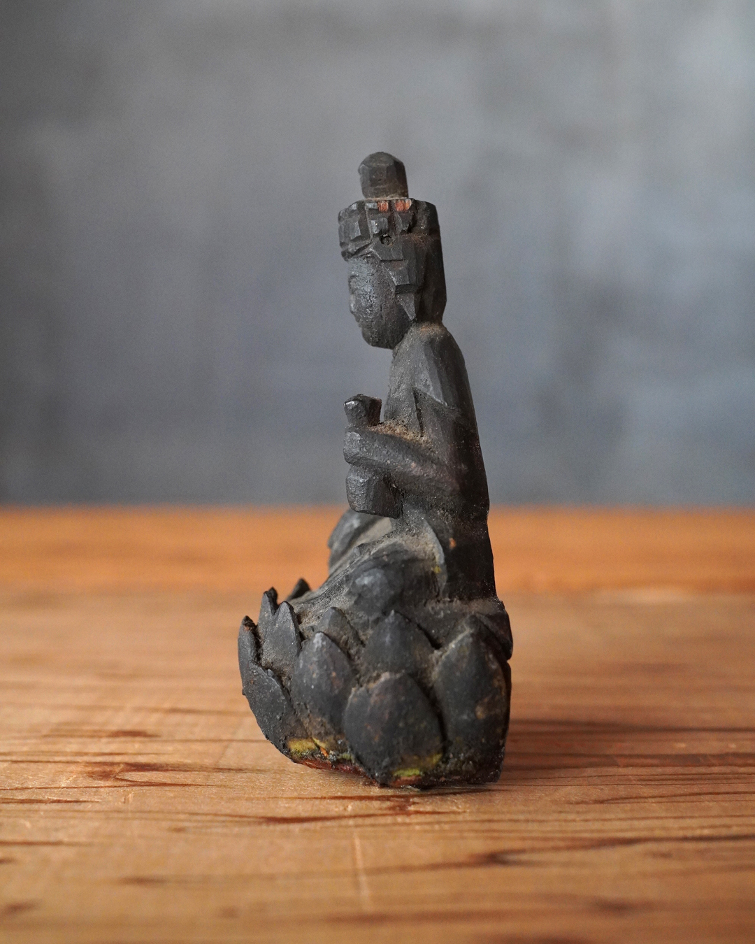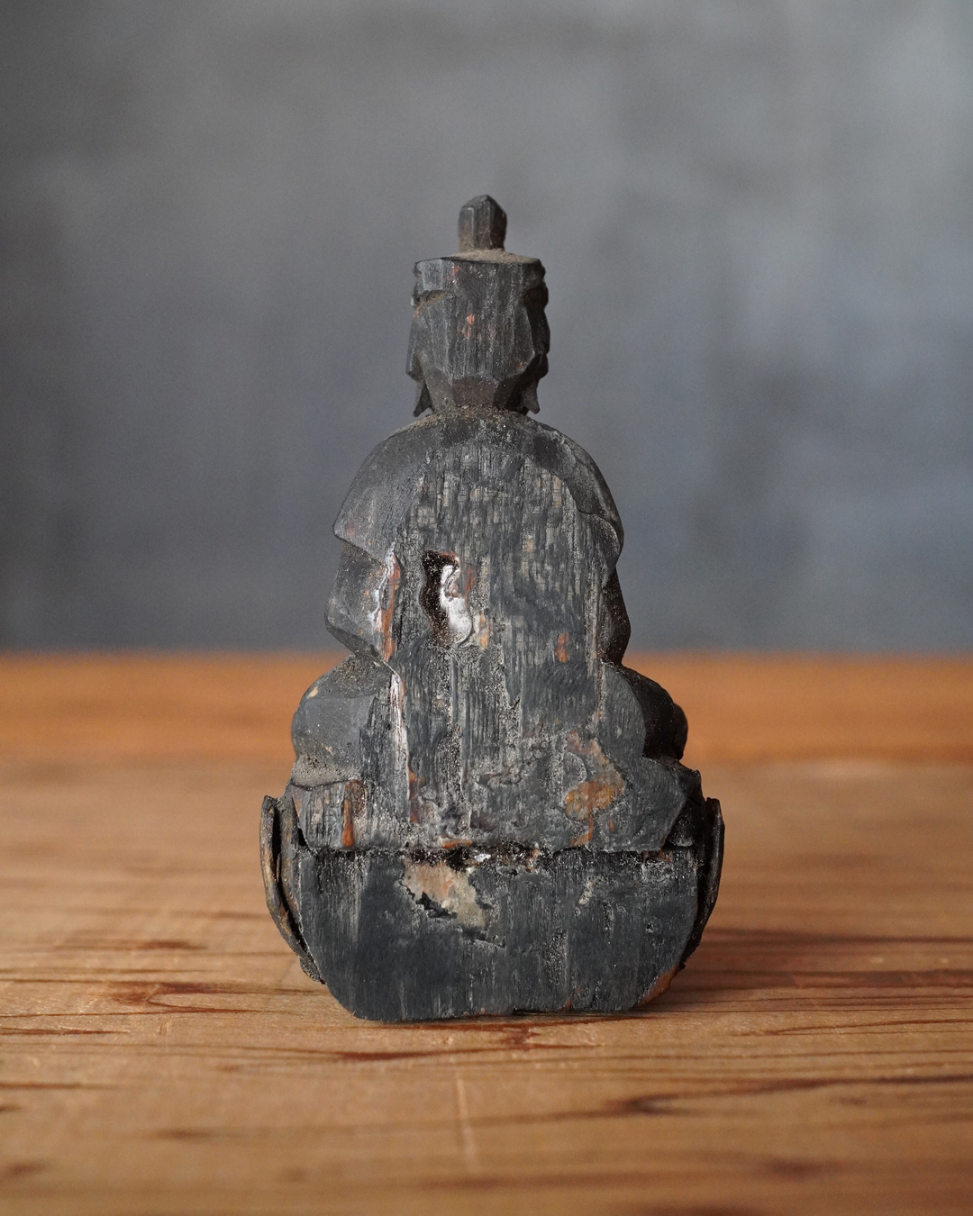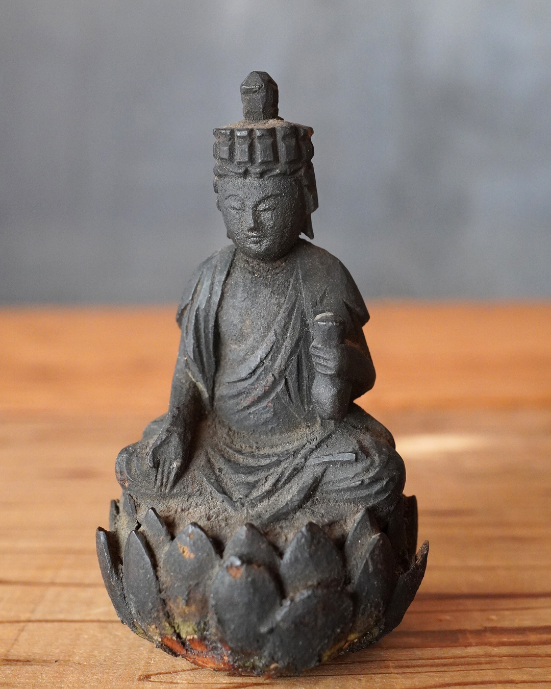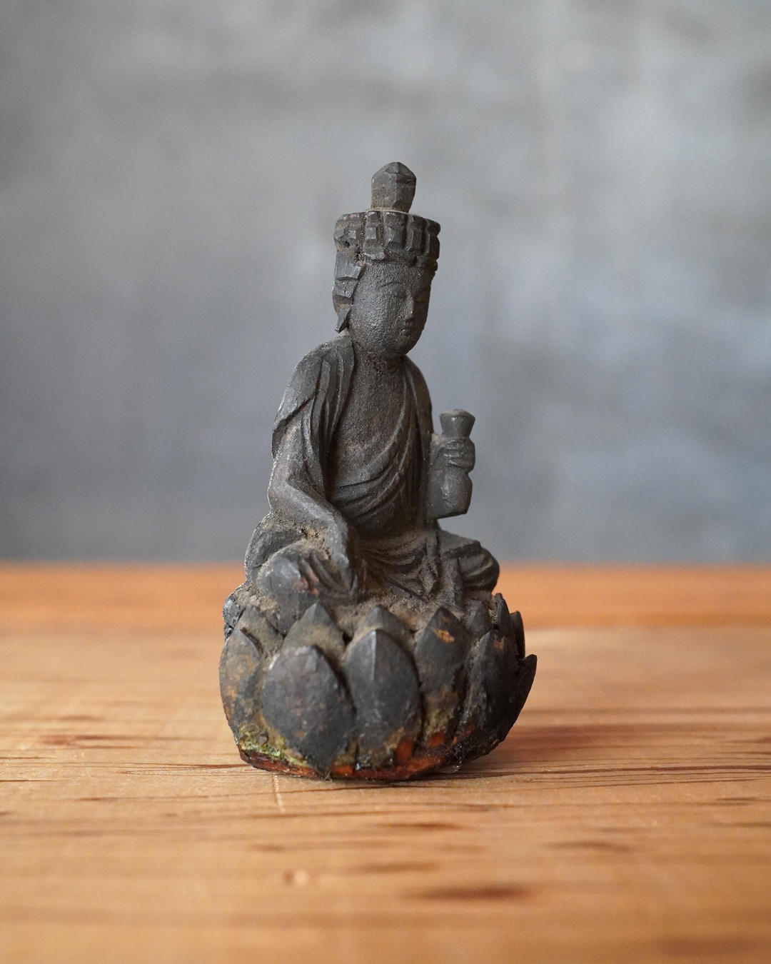 蓮座には蓮弁の欠損など時代相応の傷みが見受けられますが、像容を損なうものではなく、穏和で静謐な表情は今なお健在です。座辺に置き、日々の観賞や念持にふさわしい仏像でしょう。時代相応の経年変化はございますので画像をご確認上ご注文下さい。