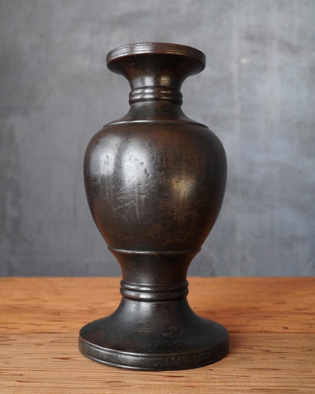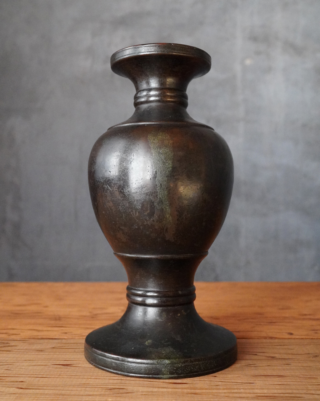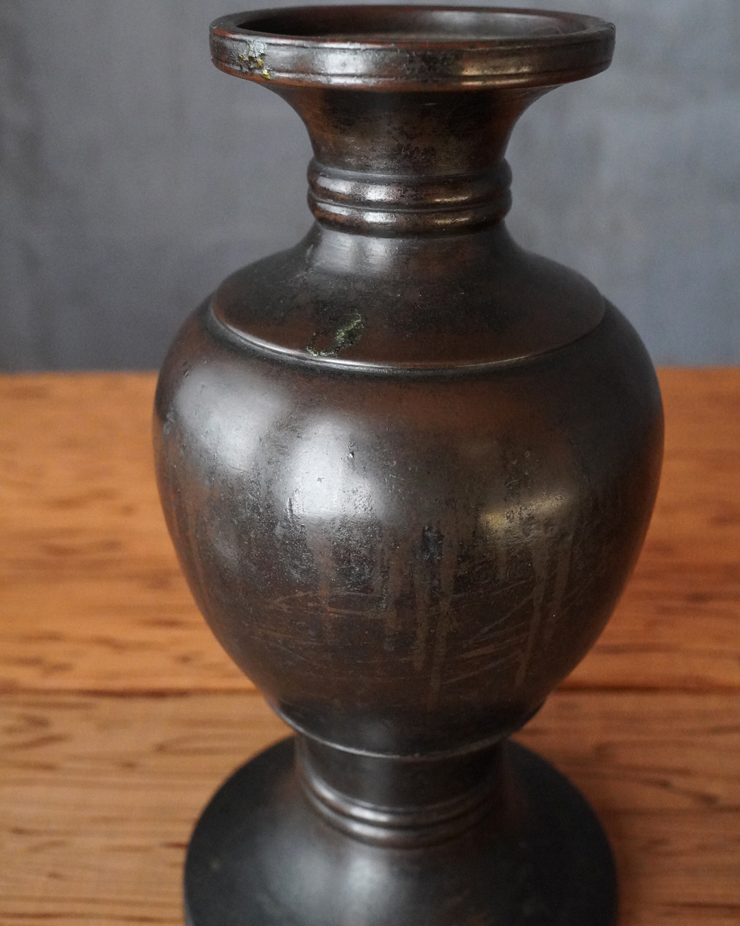 すらりとした姿形は、一般的な作例に比べてすっきりとした印象があり、現代の空間にもよく馴染みます。花を選ばず受け入れる懐の深さも備えています。時代相応の経年変化がございますので充分ご確認の上ご注文下さい。