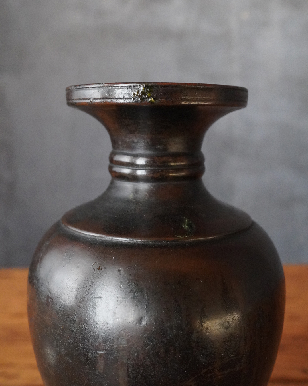細長く丸みを帯びた姿ながら、口縁や胴部の帯には引き締まった造りが見られ、時代を経た銅味も佳く、全体に静かな古格を漂わせています。作風からみて南北朝期頃の作と考えて差し支えないでしょう。
