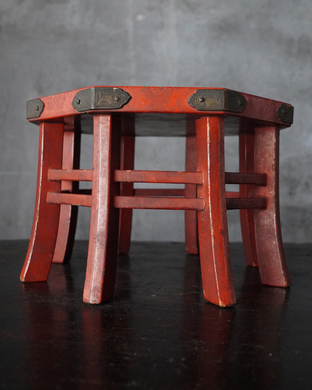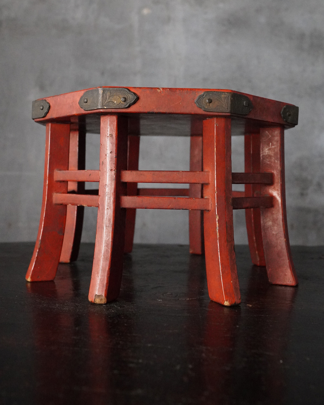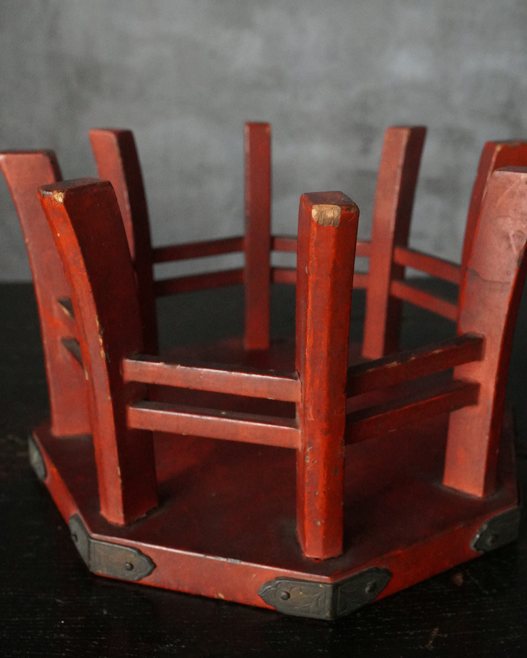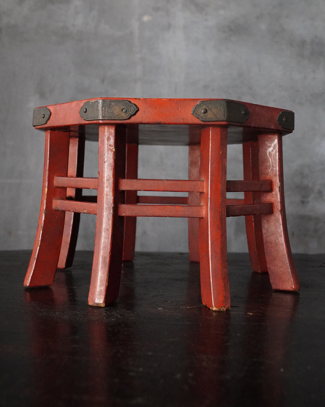 小振りながらも端正な佇まいを見せる八角形の台。天板中央には円形の窪みが設けられており、かつては鳴物を据えて用いられたものと推察されます。全体の意匠は春日卓を想起させ、繊細に伸びる八本の脚や、各角に据えられた厚みのある金具が、品格ある造りを際立たせています。小さな金工品などを引き立てる飾り台としても最適でしょう。