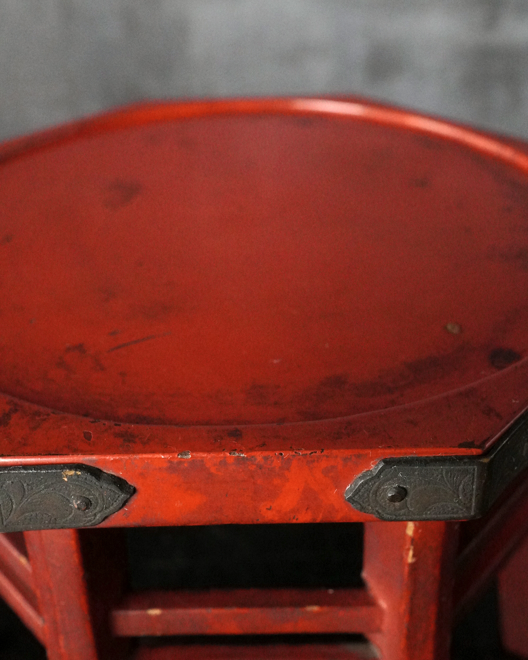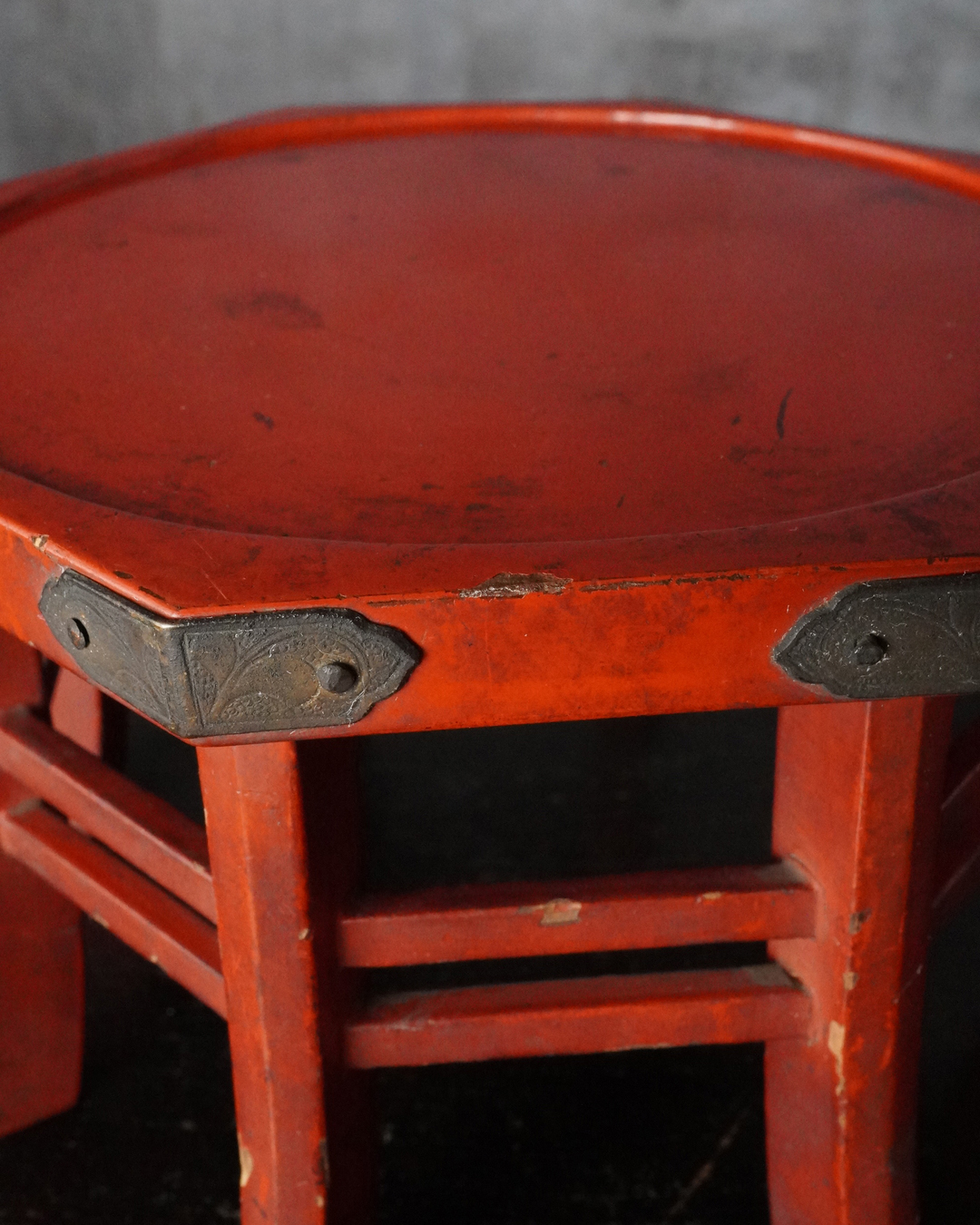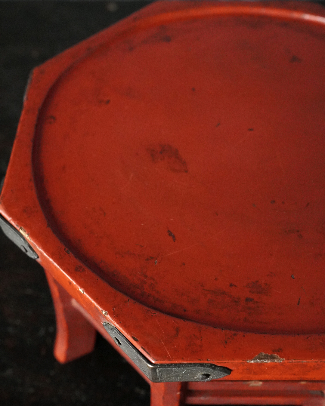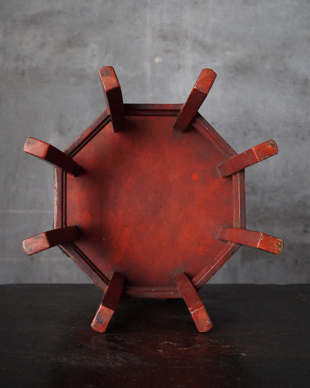 小振りながらも端正な佇まいを見せる八角形の台。天板中央には円形の窪みが設けられており、かつては鳴物を据えて用いられたものと推察されます。全体の意匠は春日卓を想起させ、繊細に伸びる八本の脚や、各角に据えられた厚みのある金具が、品格ある造りを際立たせています。小さな金工品などを引き立てる飾り台としても最適でしょう。