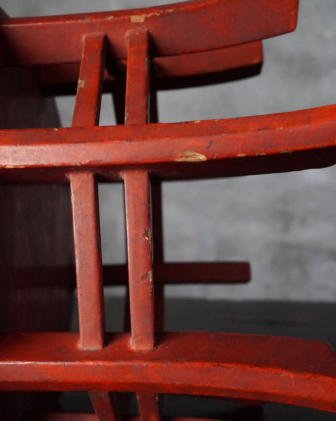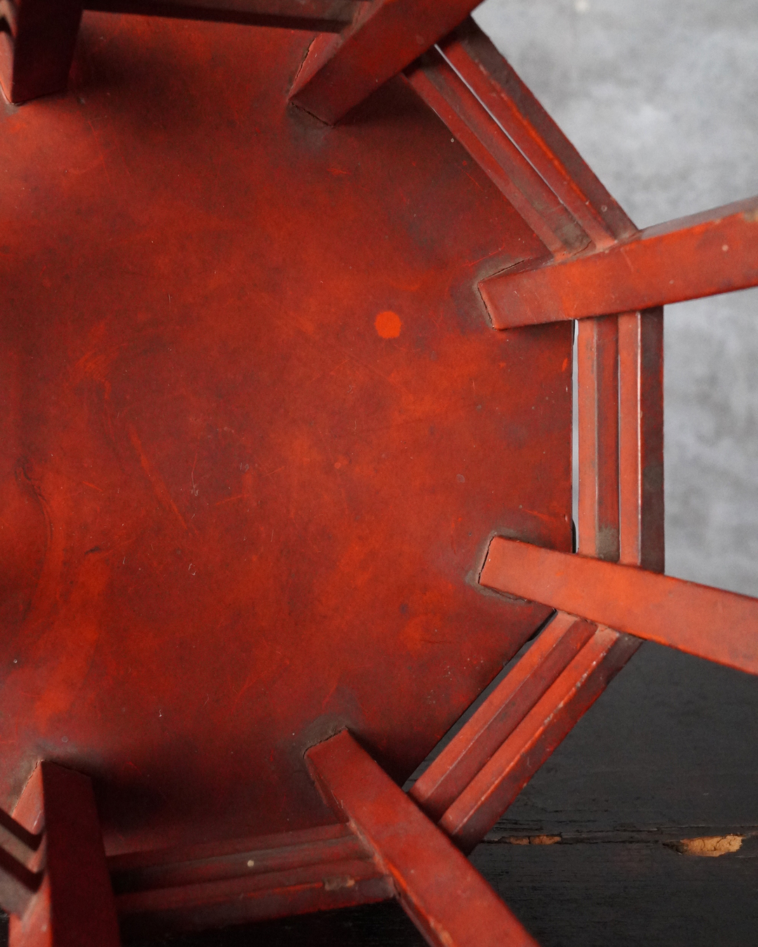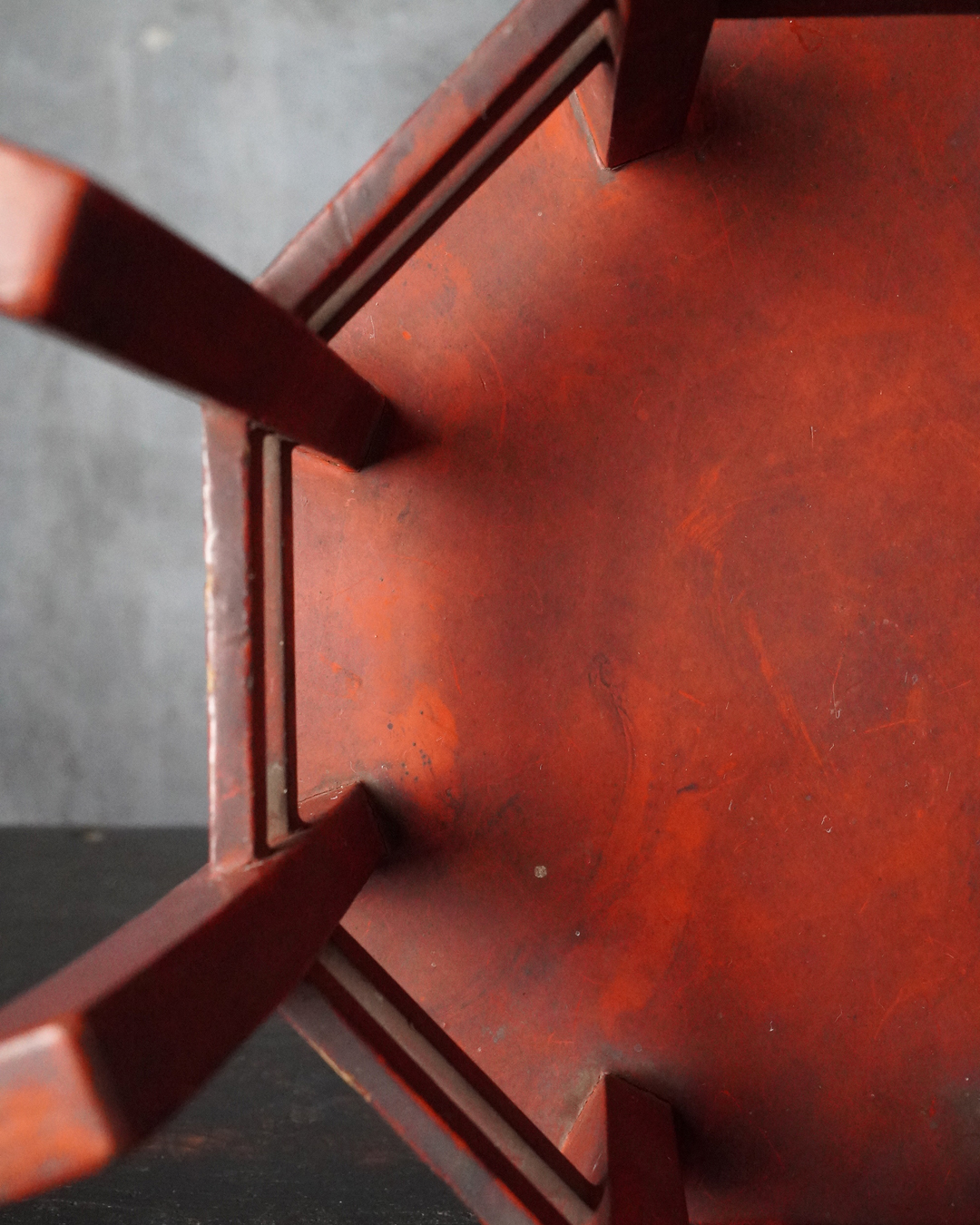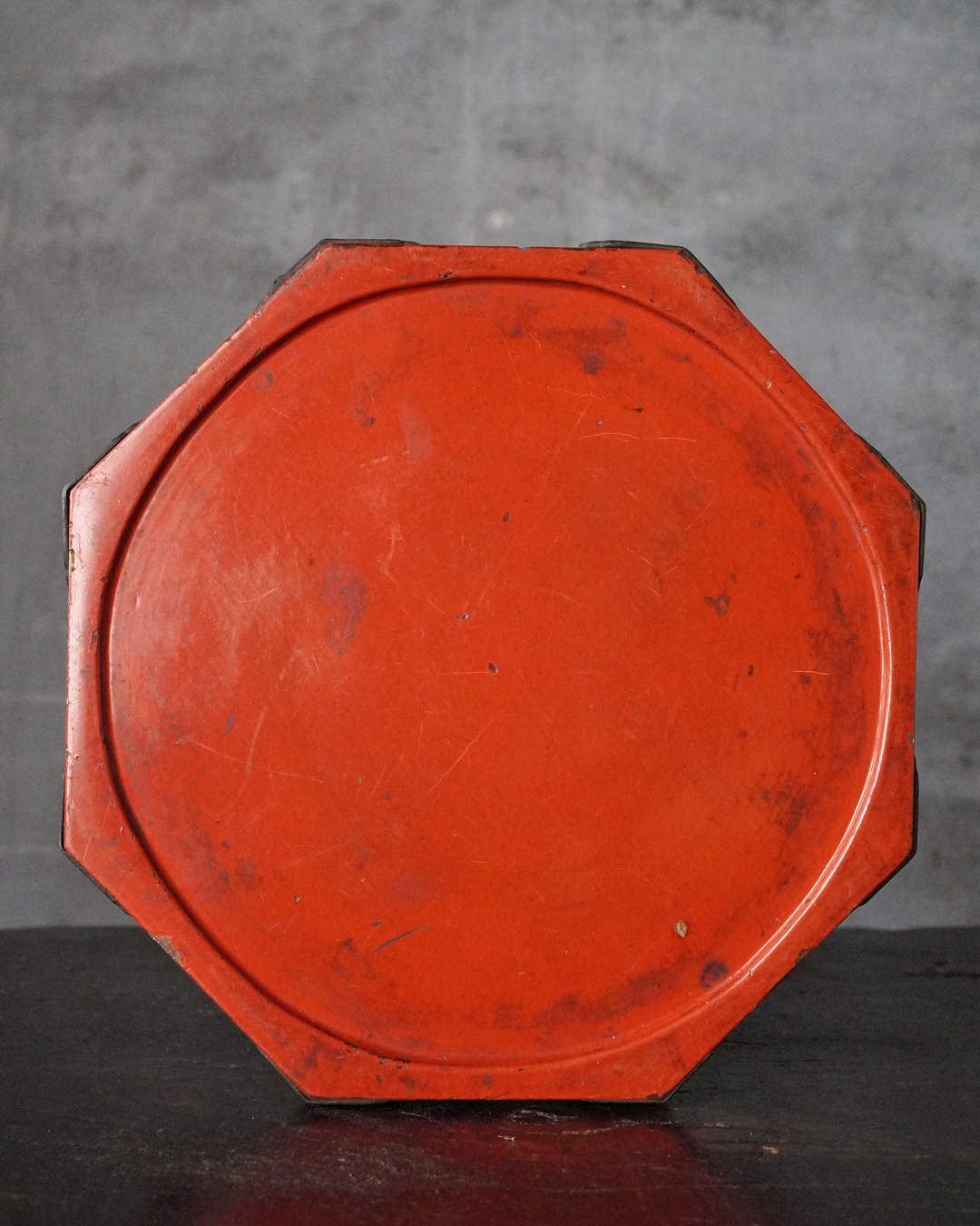 小振りながらも端正な佇まいを見せる八角形の台。天板中央には円形の窪みが設けられており、かつては鳴物を据えて用いられたものと推察されます。全体の意匠は春日卓を想起させ、繊細に伸びる八本の脚や、各角に据えられた厚みのある金具が、品格ある造りを際立たせています。小さな金工品などを引き立てる飾り台としても最適でしょう。