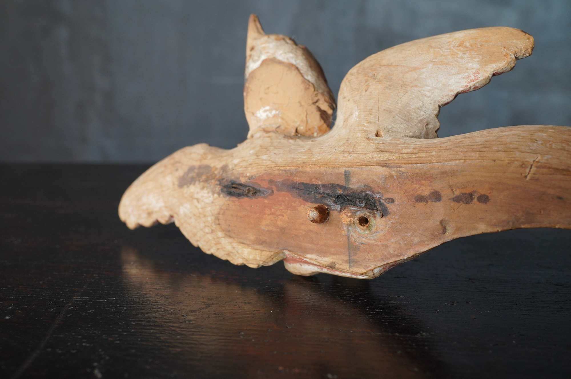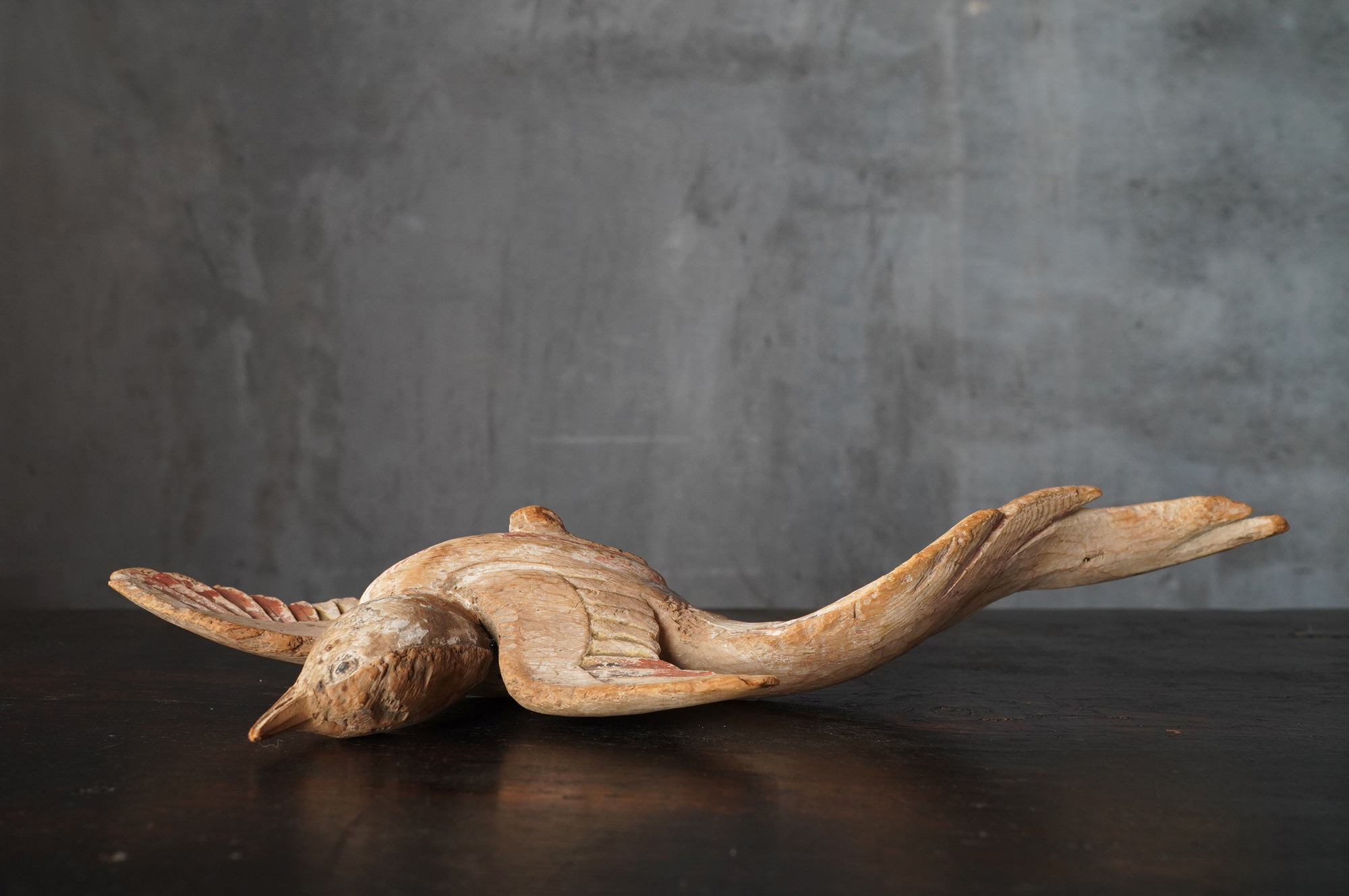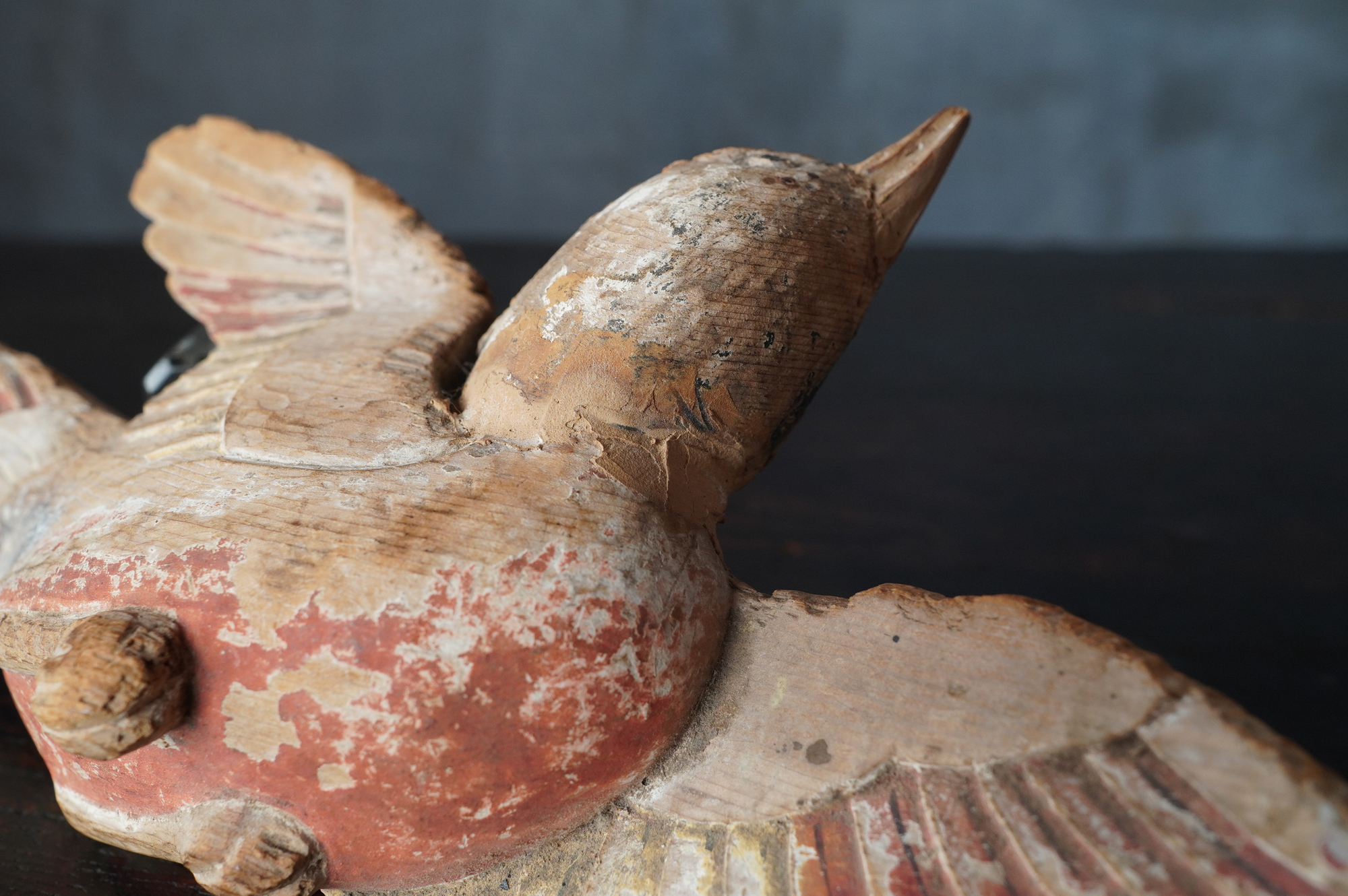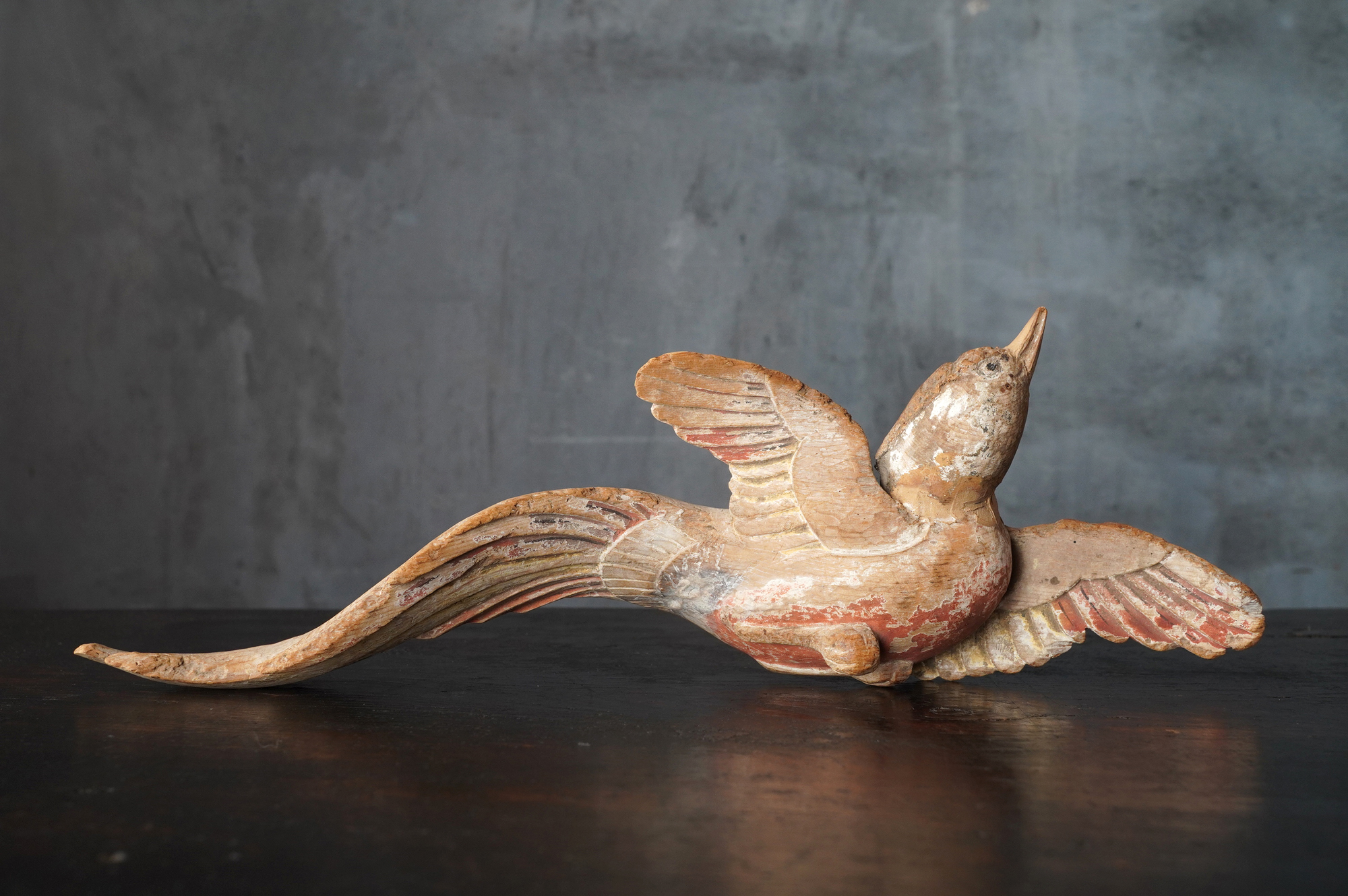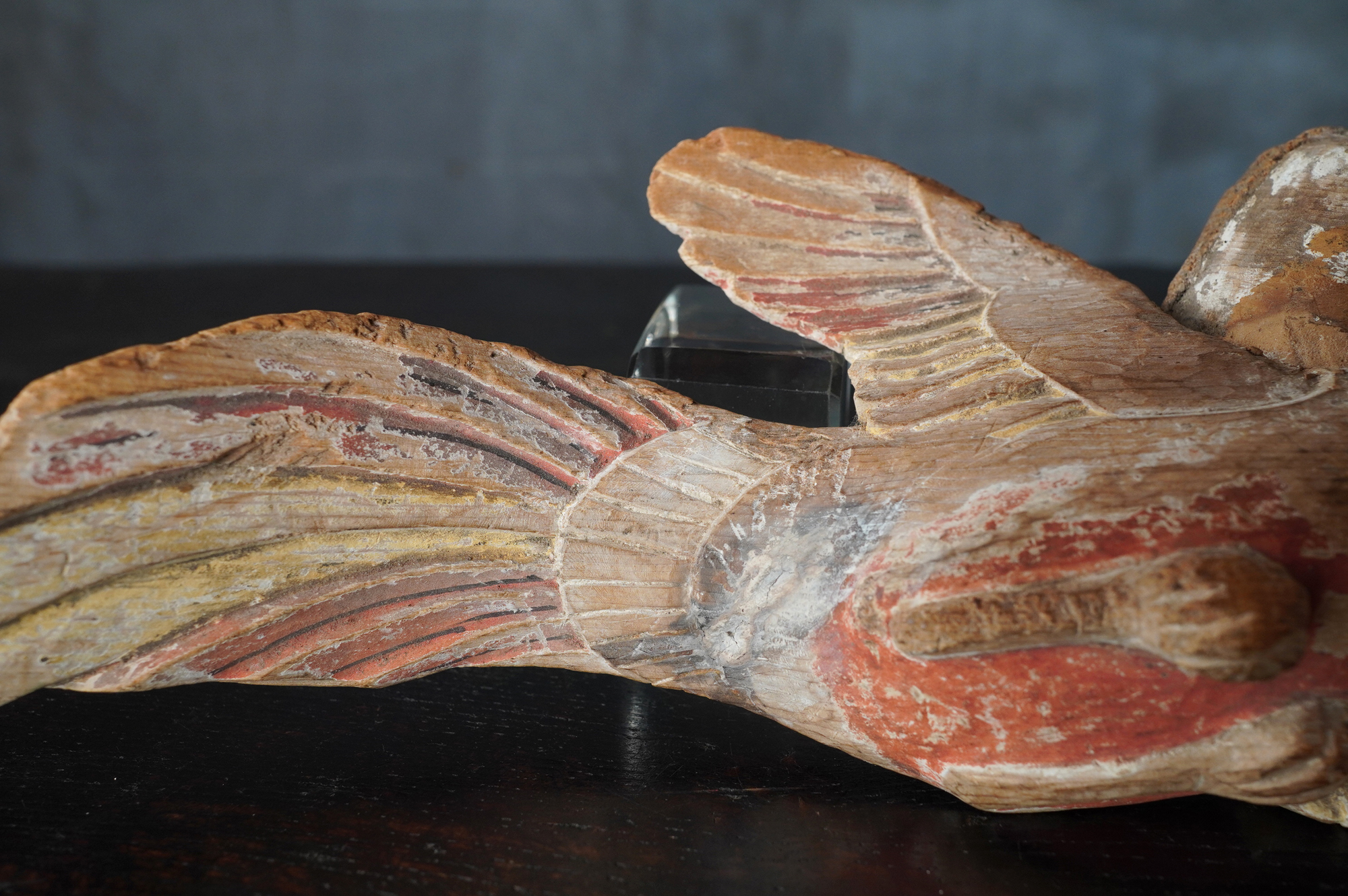 木彫彩色鳳凰。あたかも空中を翔るかのような動勢を備え、寺院装飾として造られたものであったことがうかがわれます。