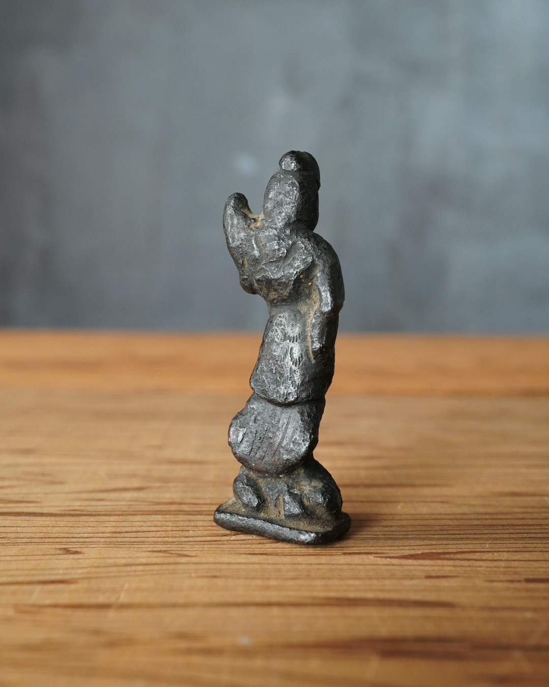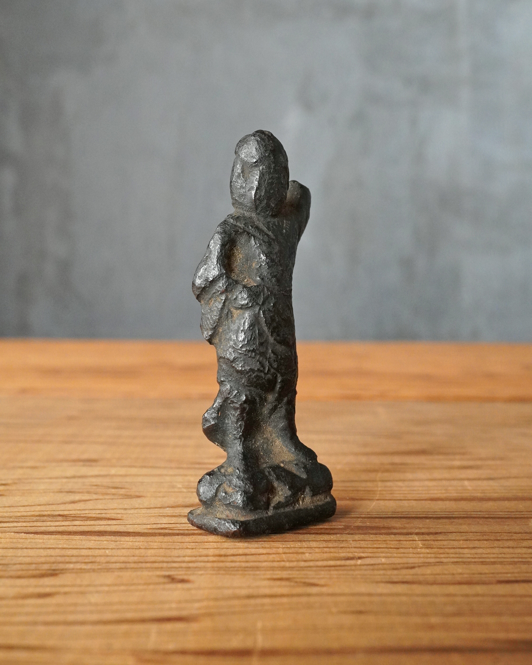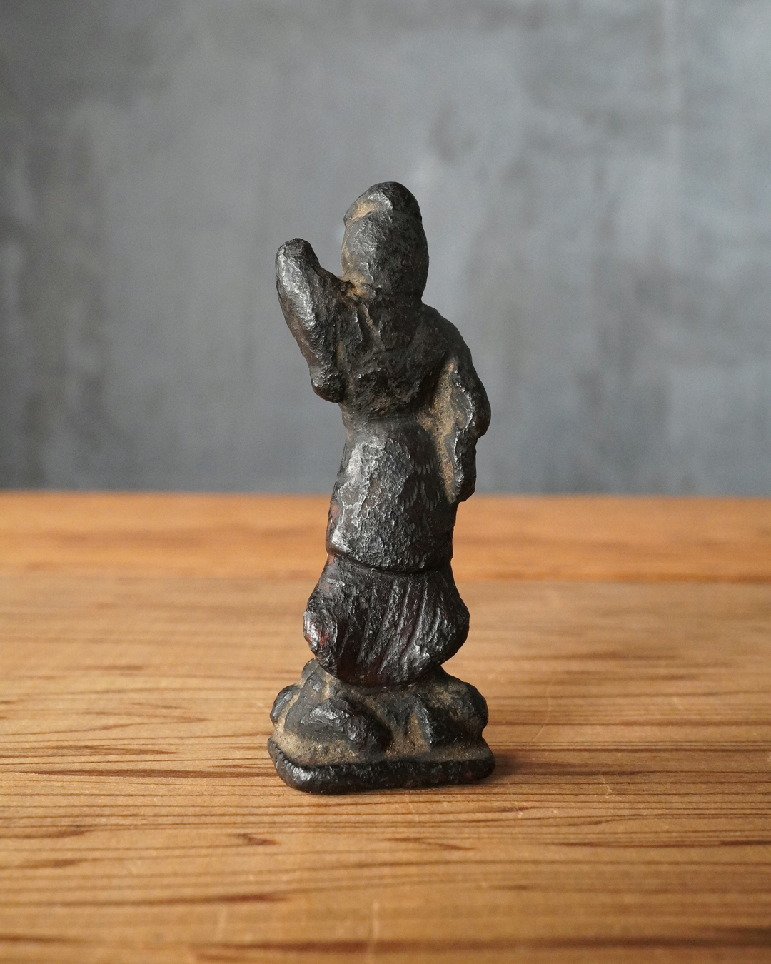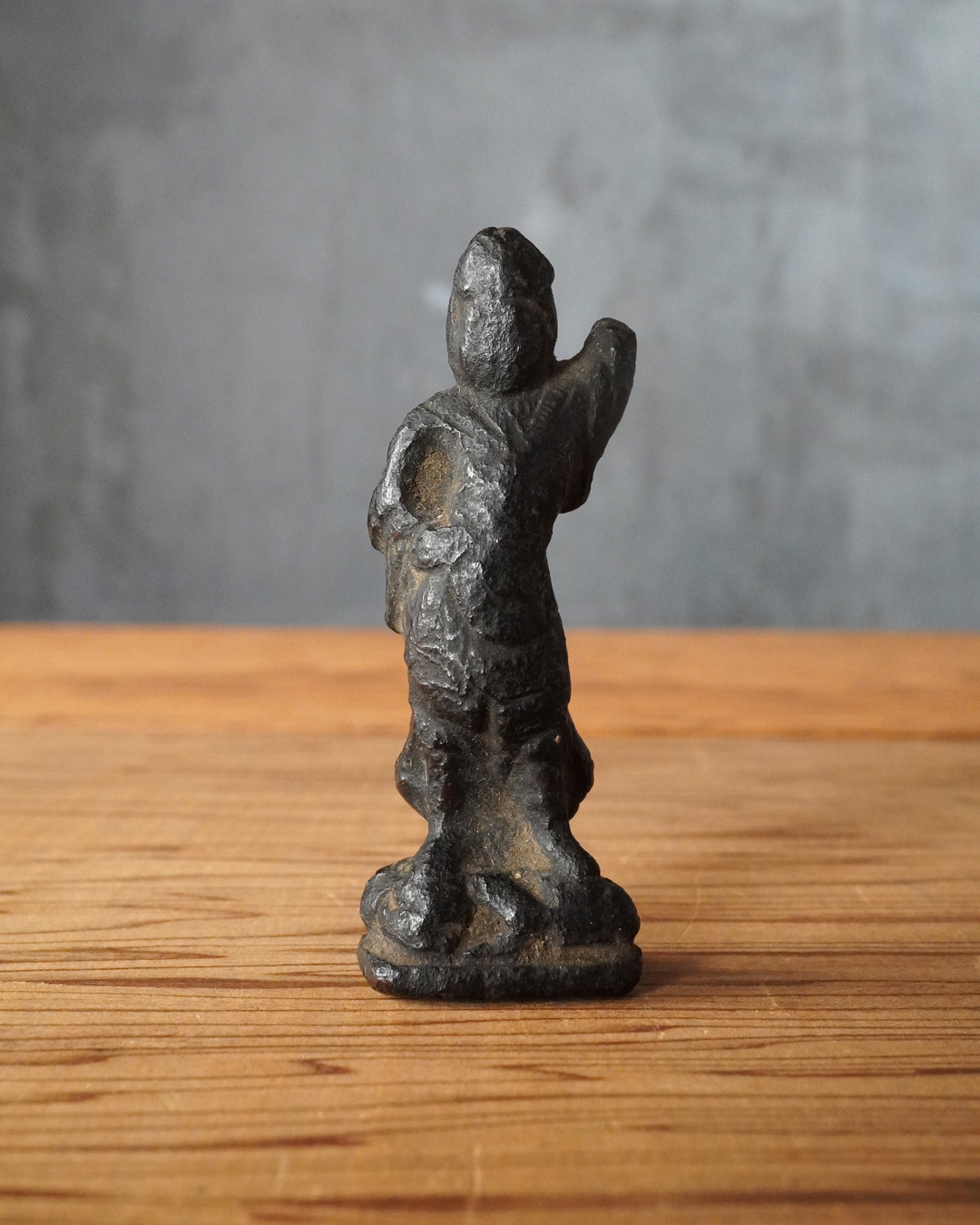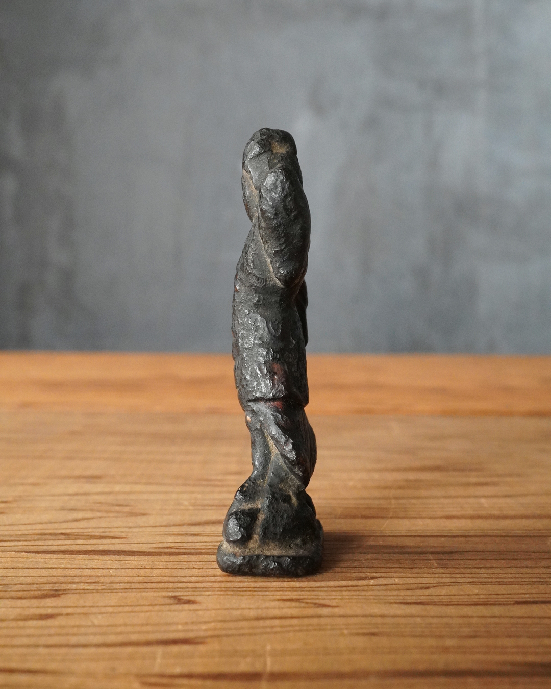 顔立ちや甲冑の細部は焼成により丸みを帯び、黒くなっていますが、腰をひねった立ち姿には古像ならではの格調が漂います。時代は室町時代頃まで遡るものと判断しております。