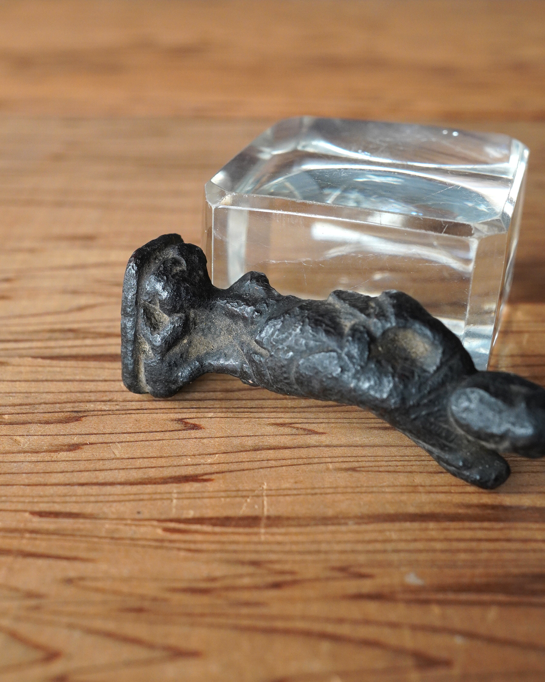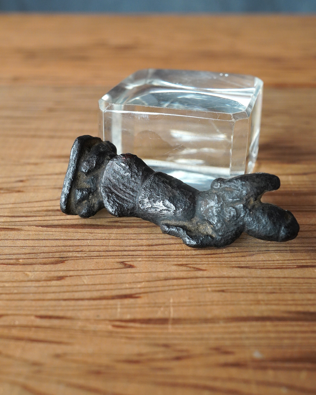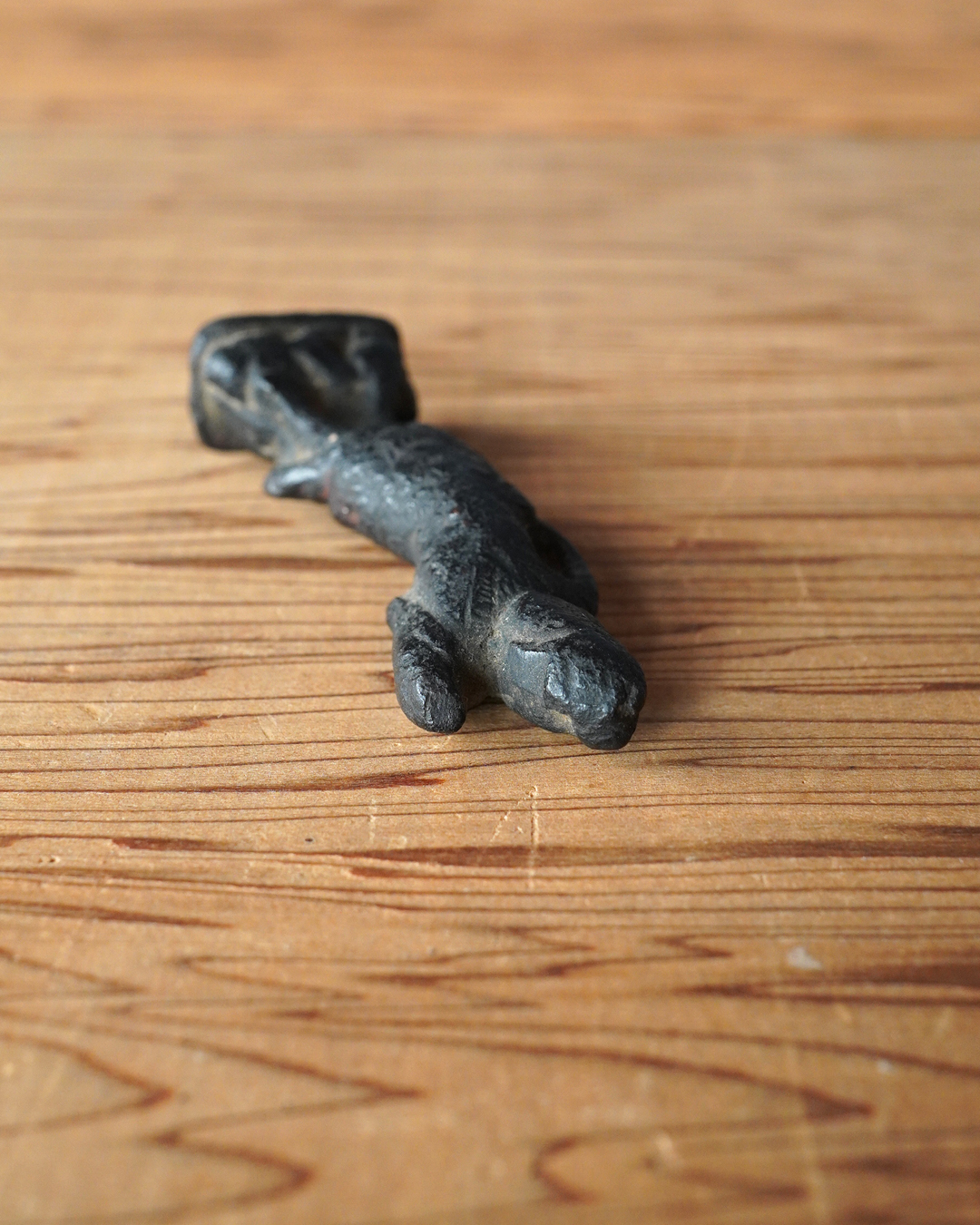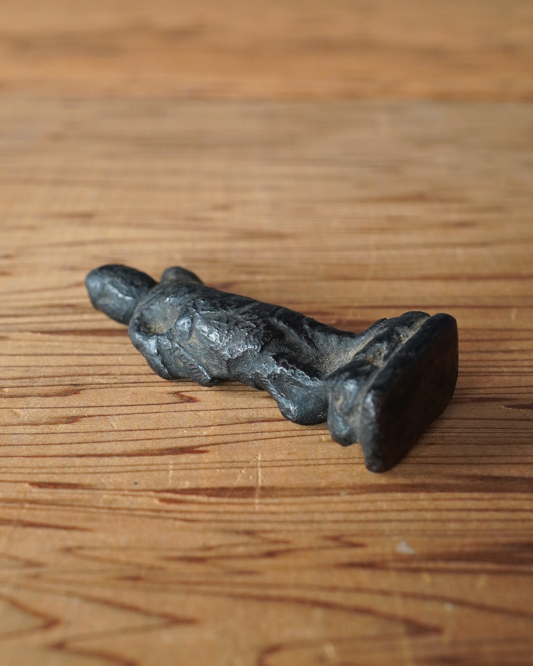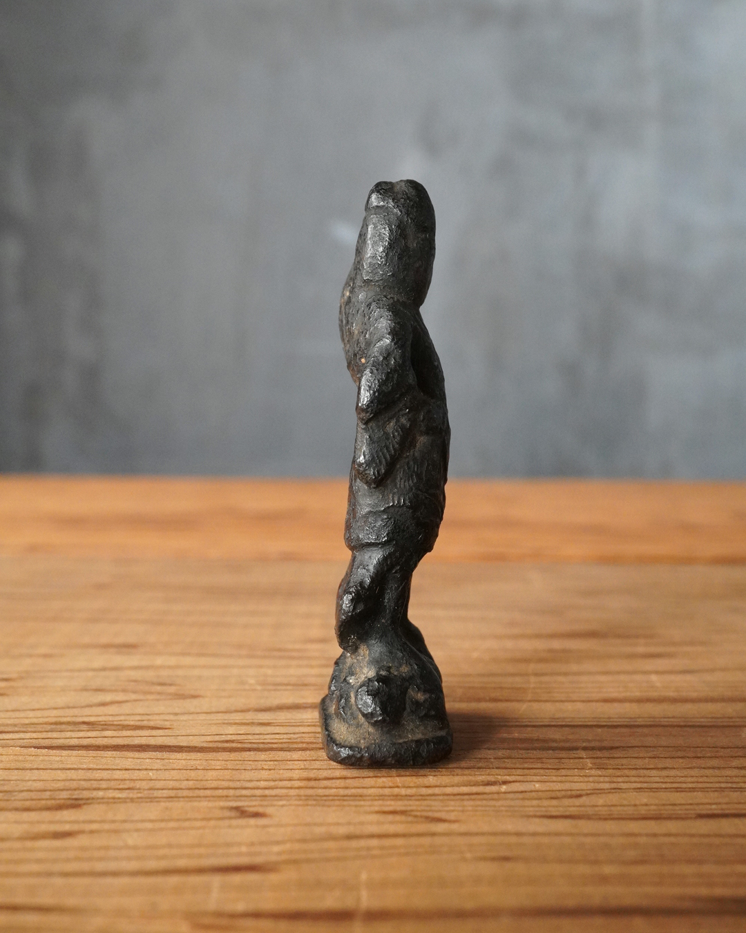 顔立ちや甲冑の細部は焼成により丸みを帯び、黒くなっていますが、腰をひねった立ち姿には古像ならではの格調が漂います。時代は室町時代頃まで遡るものと判断しております。