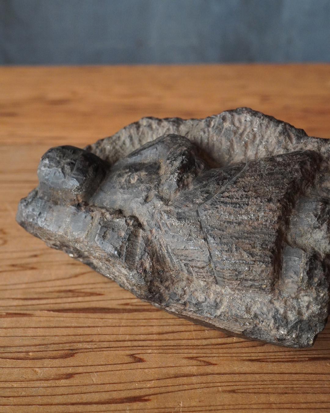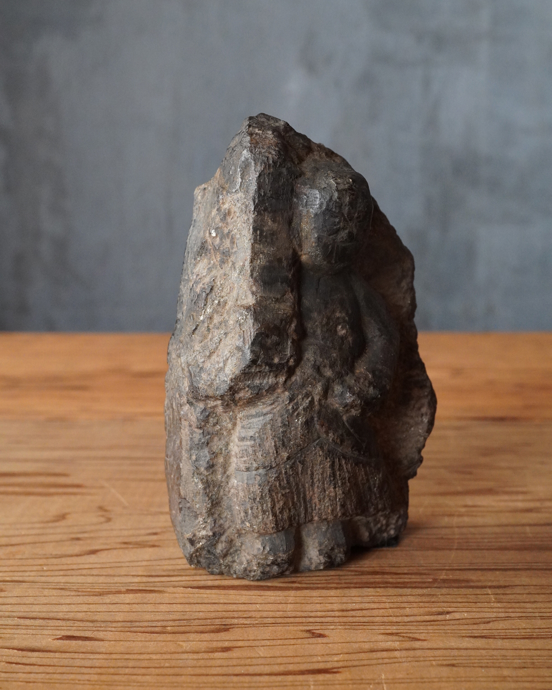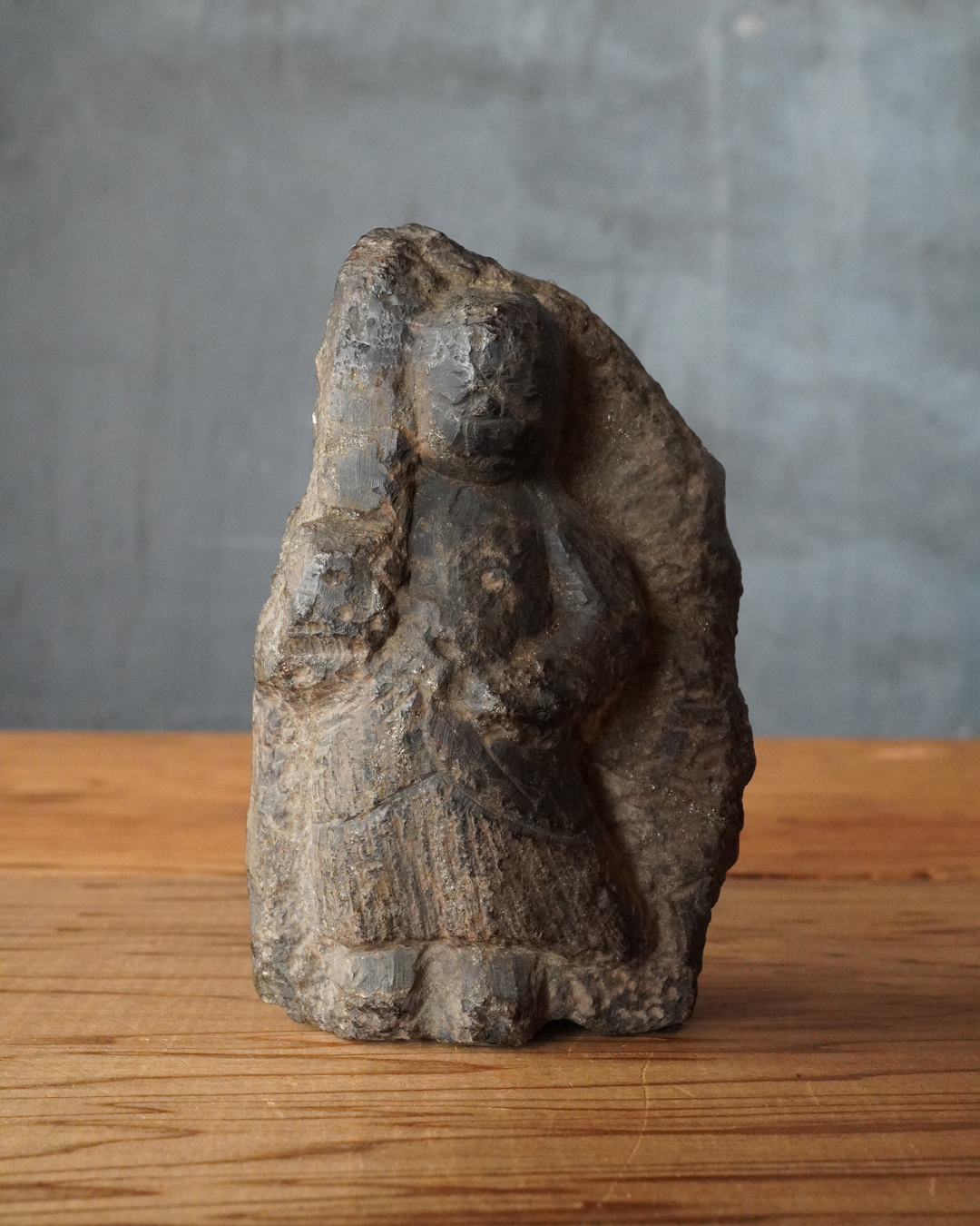 硬さのある石に彫られた、掌中サイズの不動明王像。宝剣を執ることでかろうじて尊名が判別できるほどの素朴で稚拙な造形ながら、そこにこそ民間信仰仏ならではの純粋な祈りが表現されています。