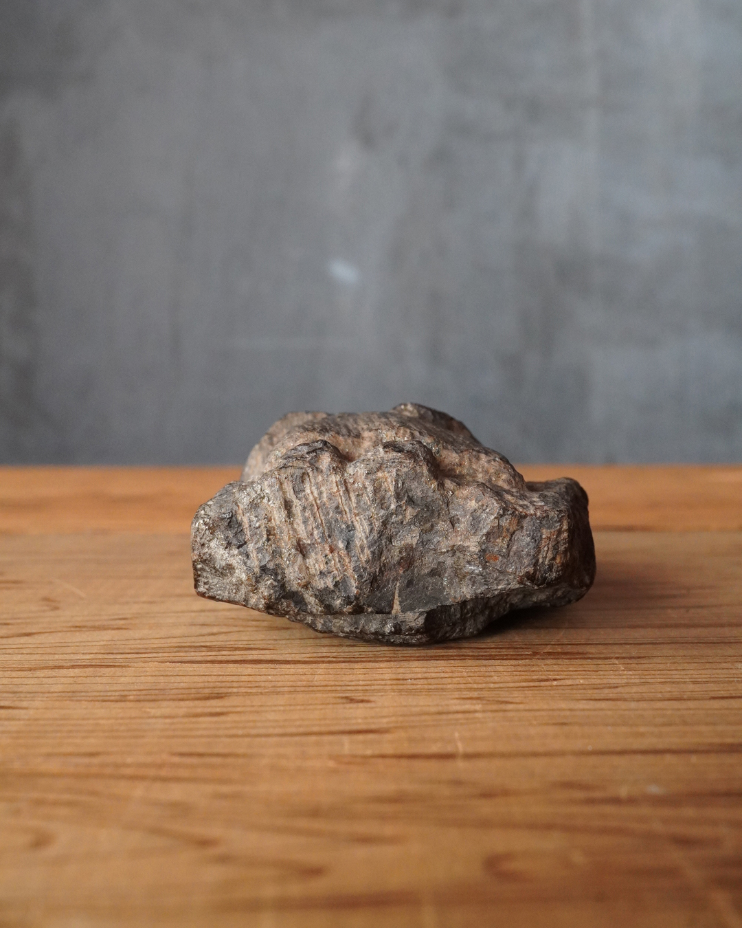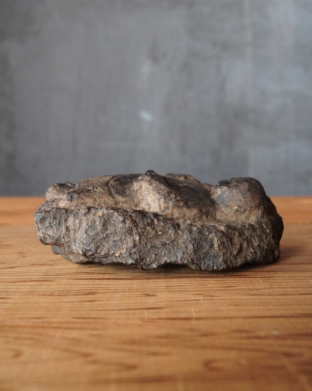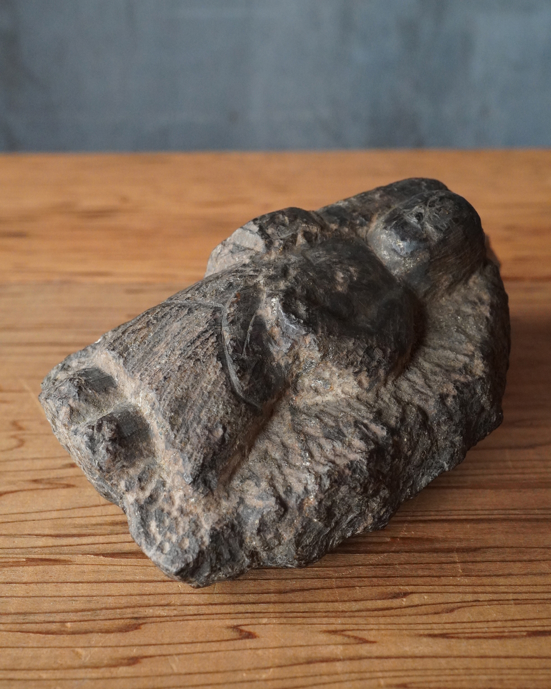 硬さのある石に彫られた、掌中サイズの不動明王像。宝剣を執ることでかろうじて尊名が判別できるほどの素朴で稚拙な造形ながら、そこにこそ民間信仰仏ならではの純粋な祈りが表現されています。