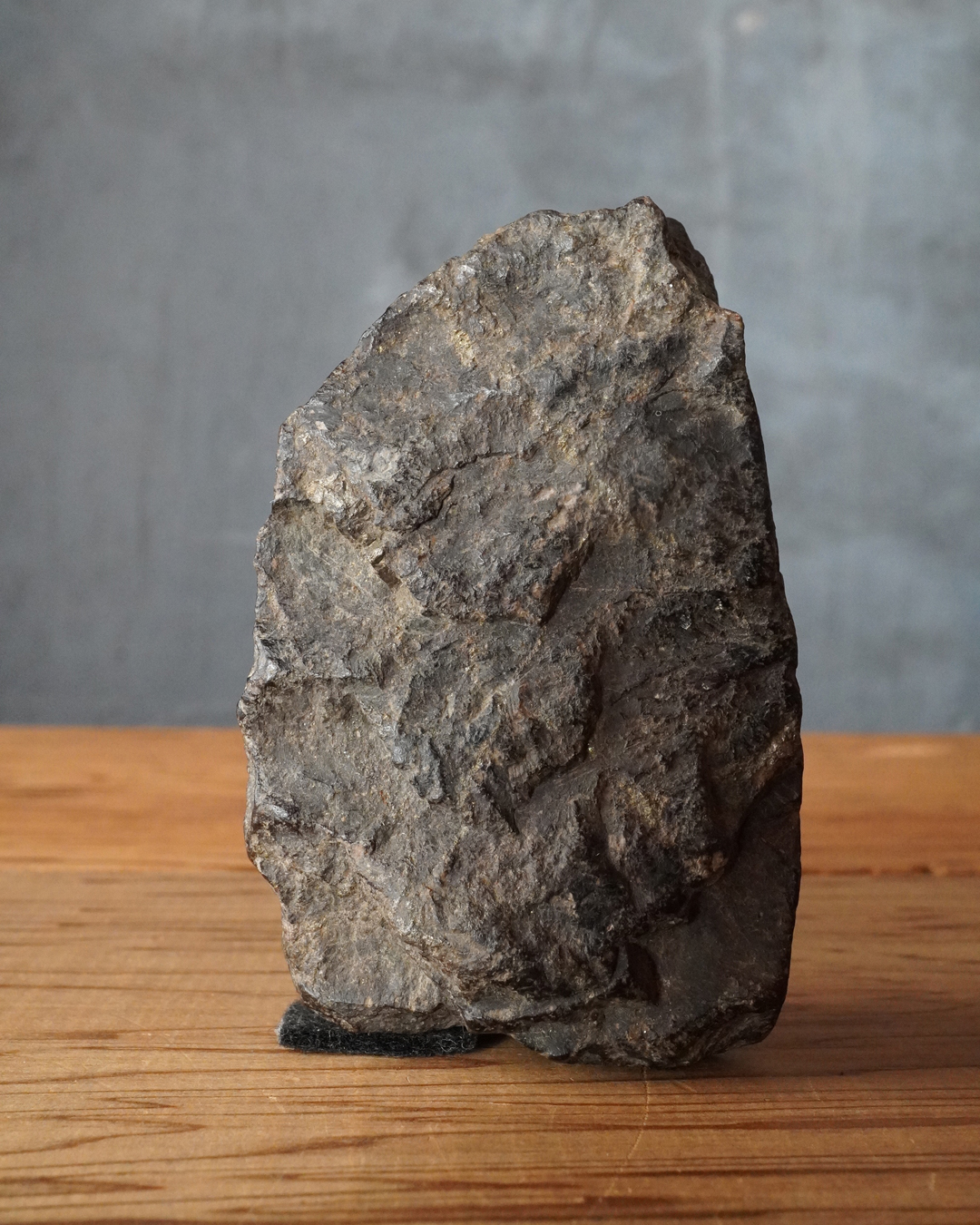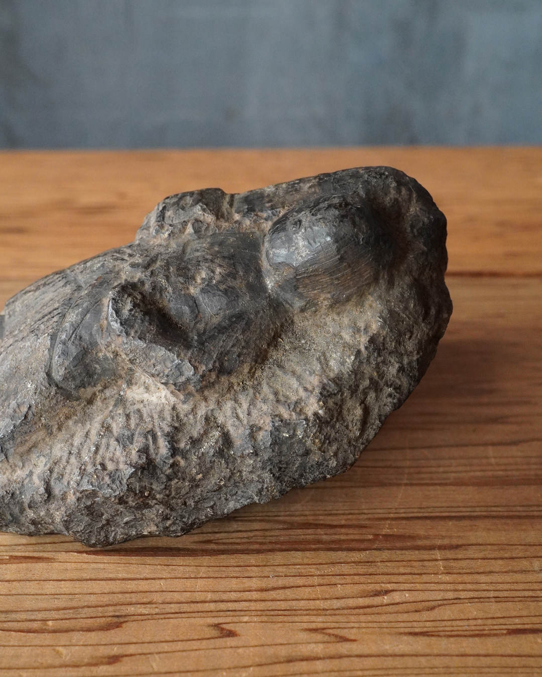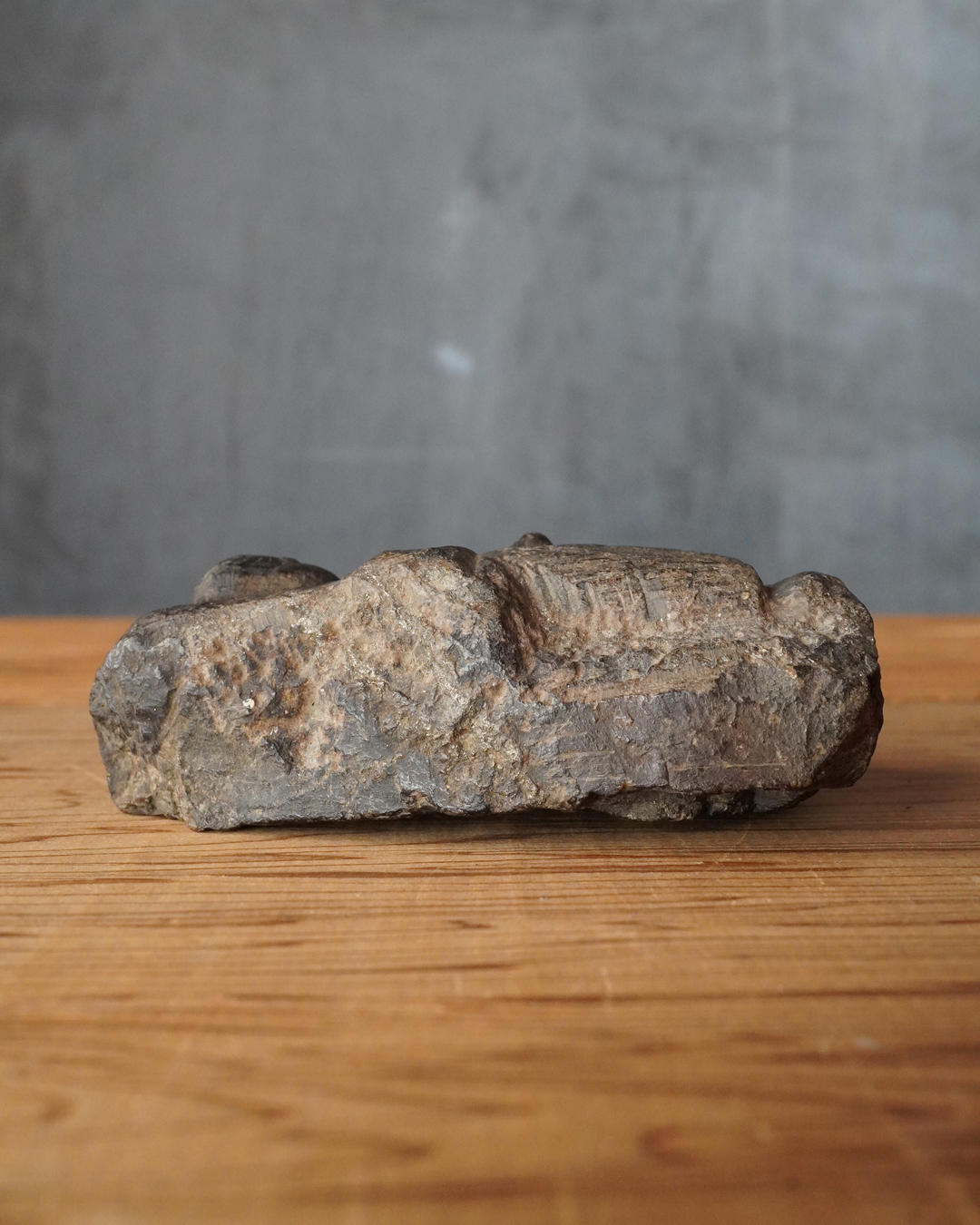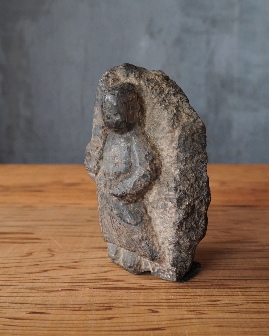 いわゆる民間仏に分類されますが、硬めの石材でありながら極めて小ぶりな念持仏とし、形を大胆に省略したプリミティブな姿は、作為を超えた魅力を放っています。自立はしませんので予めご了承下さい。撮影時は安定のため布を挟んでおります。
