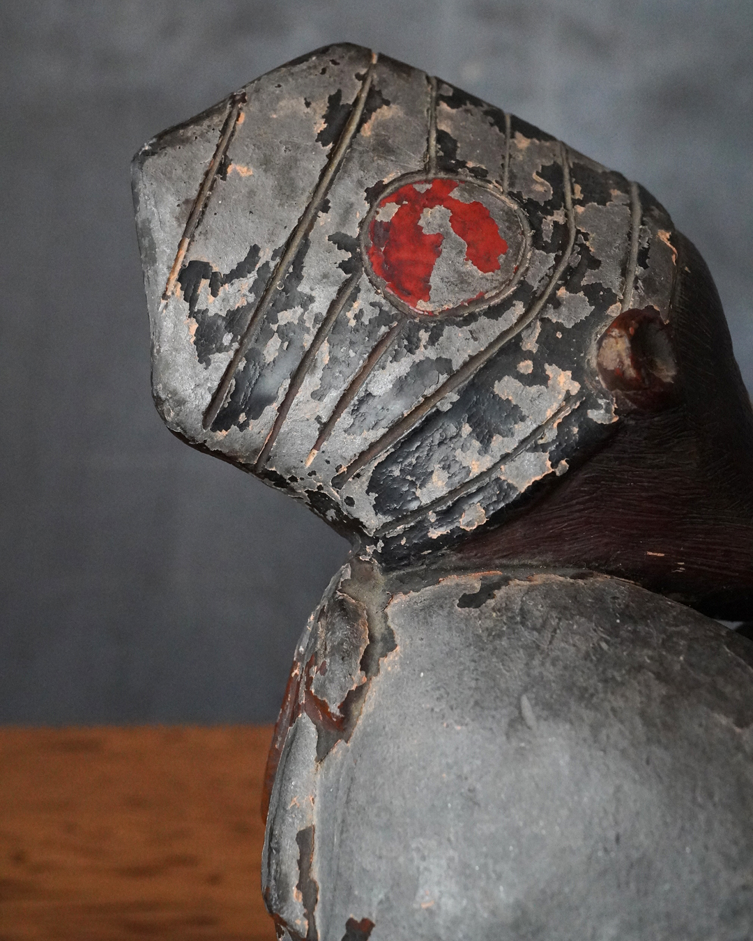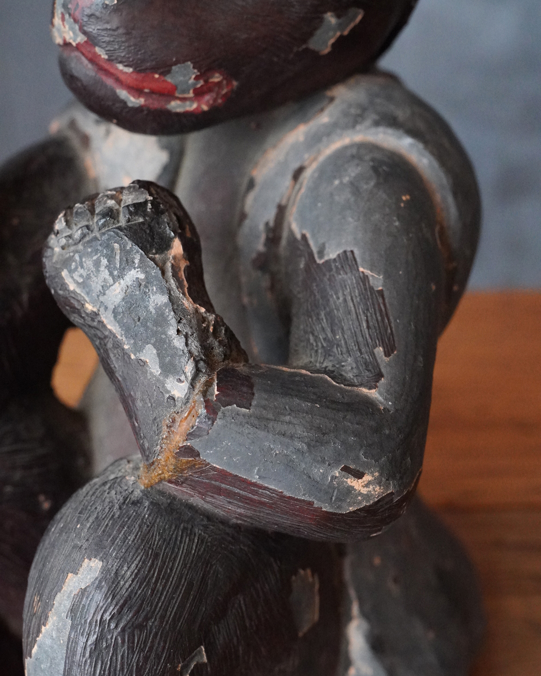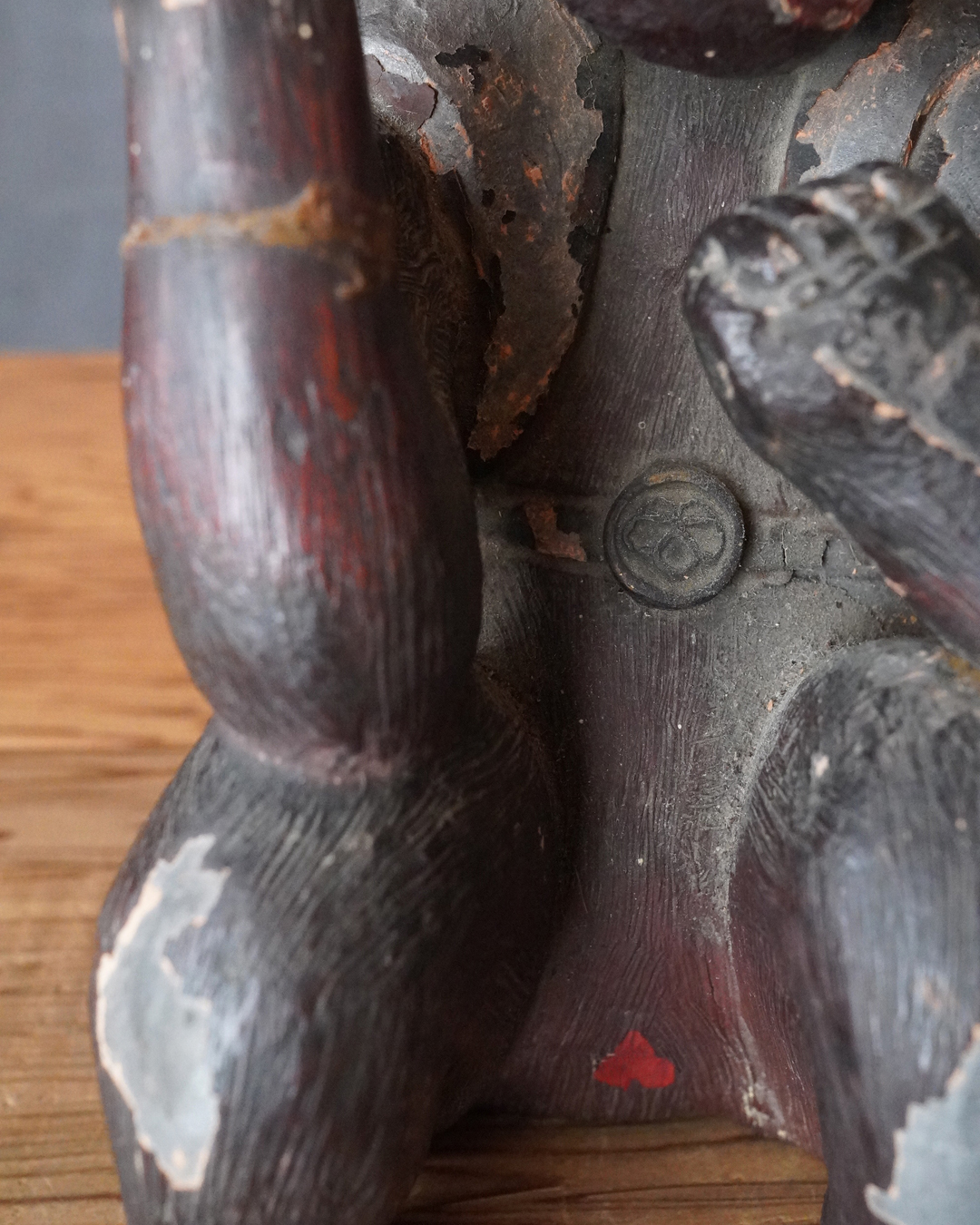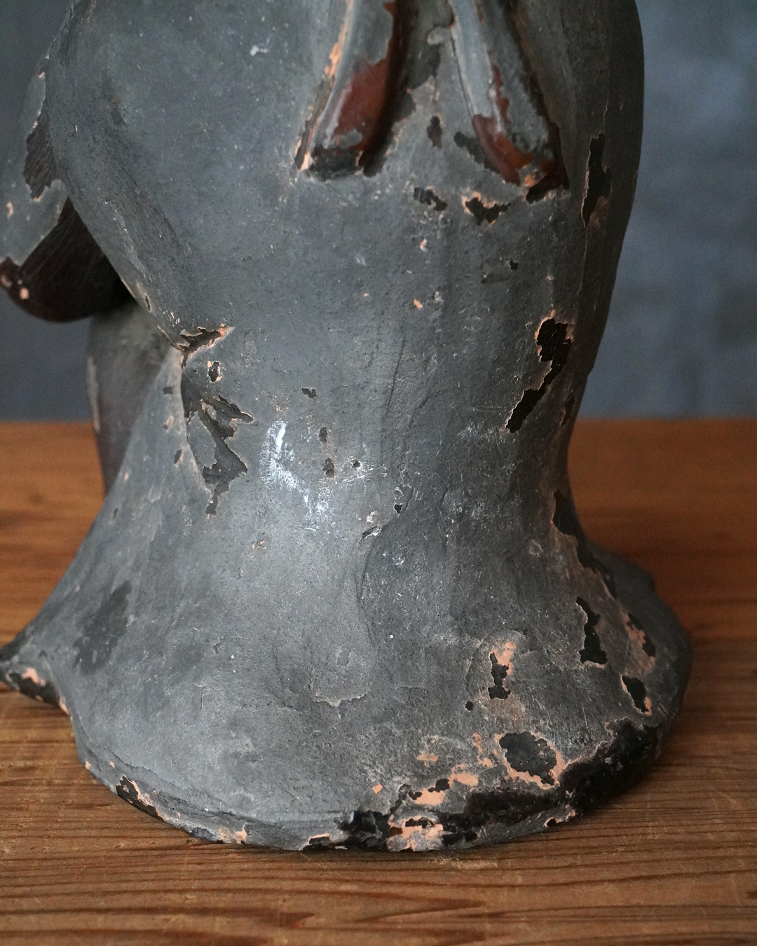 漆彩には剥落が見られ、持物は失われ、腕部に折損および接着による補修が認められますが、全体として細部まで丁寧に作られております。一般で祀られてたというより、小祠などに安置されていた可能性が高いと拝されます。状態は必ずしも良好とは申せませんが、古作ならではの趣と十分な魅力を備えています。江戸時代。