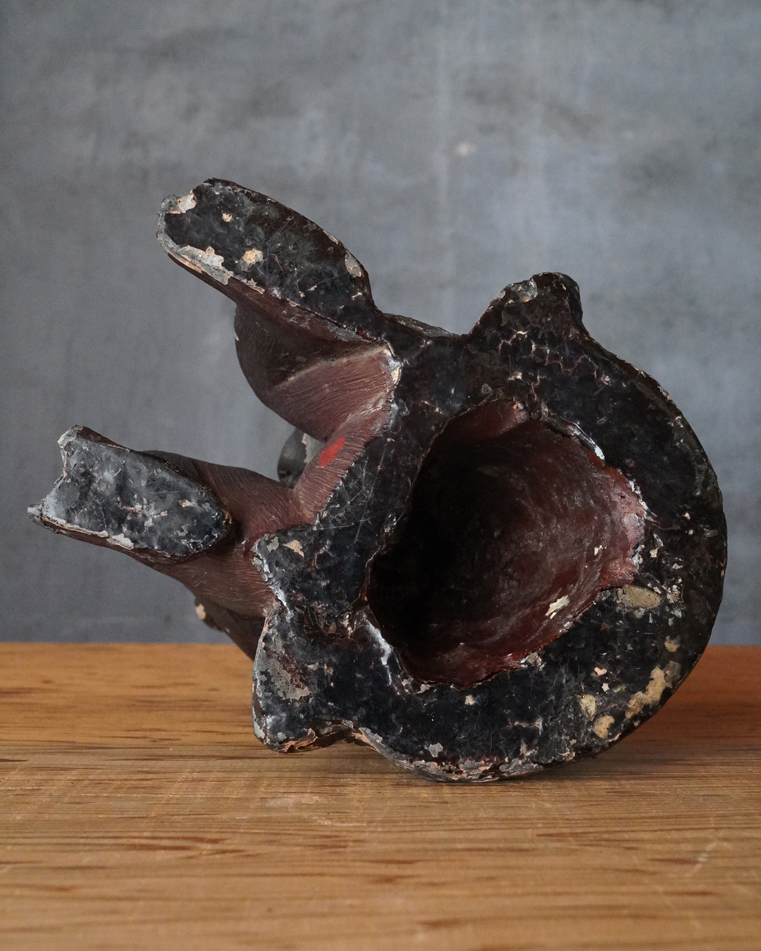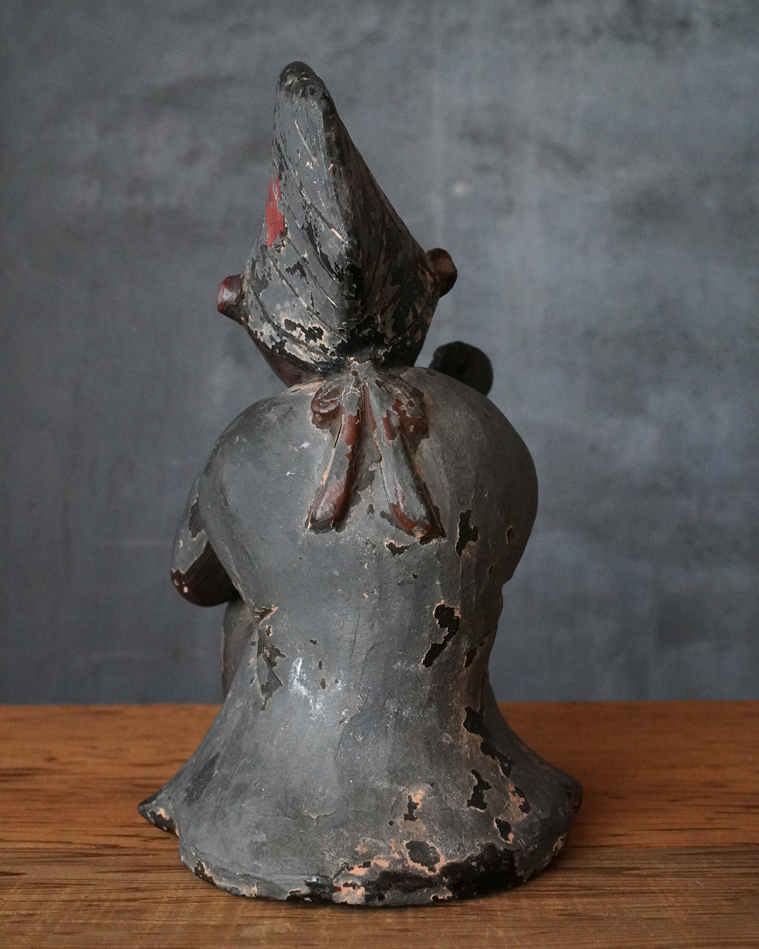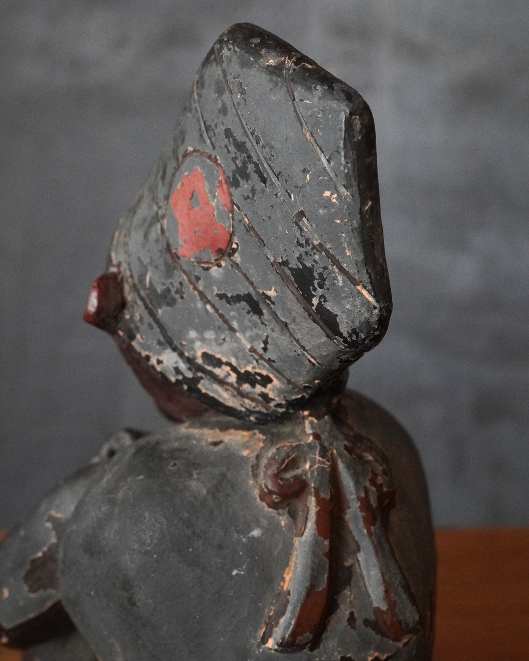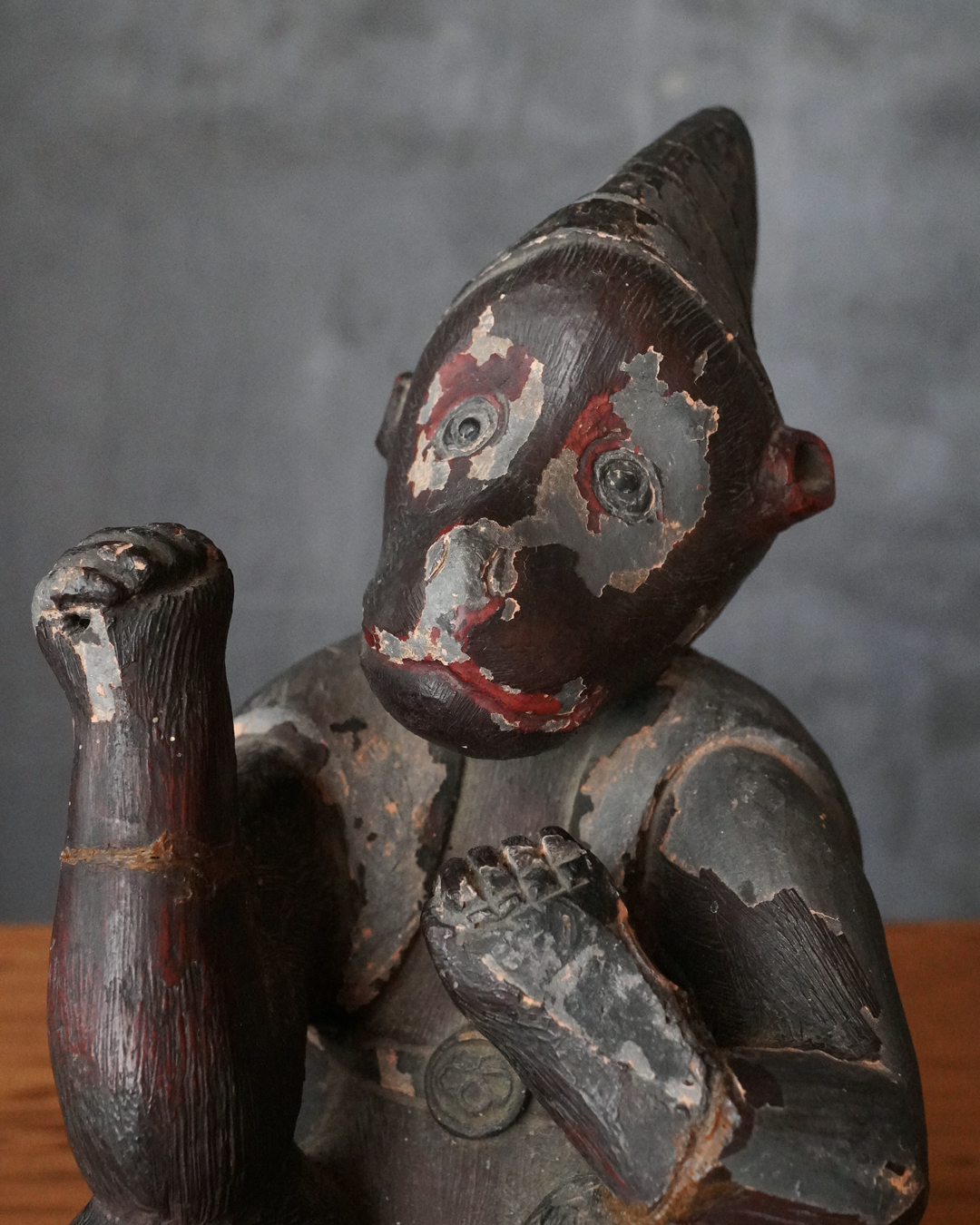 漆彩には剥落が見られ、持物は失われ、腕部に折損および接着による補修が認められますが、全体として細部まで丁寧に作られております。一般で祀られてたというより、小祠などに安置されていた可能性が高いと拝されます。状態は必ずしも良好とは申せませんが、古作ならではの趣と十分な魅力を備えています。江戸時代。
