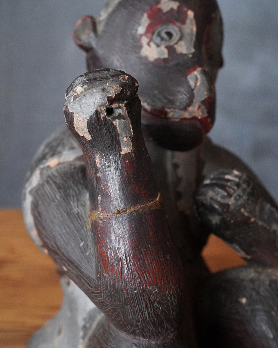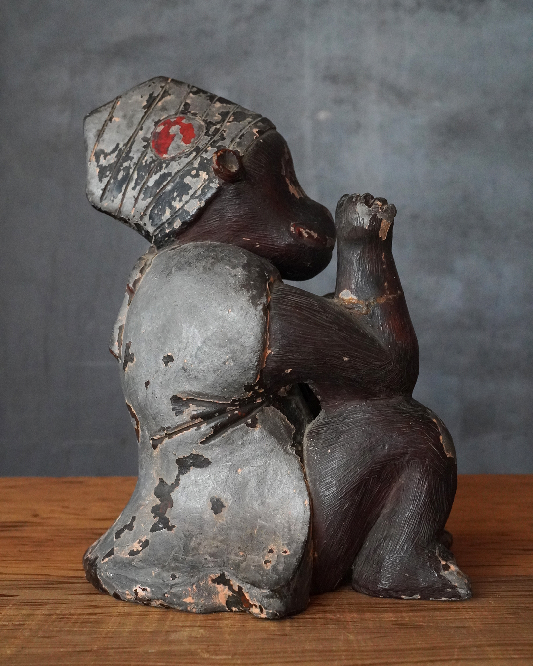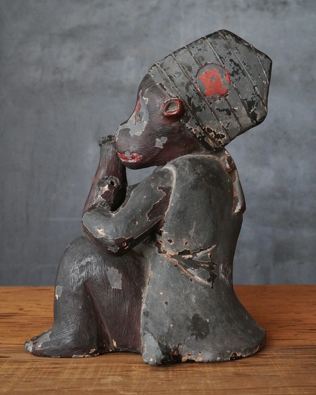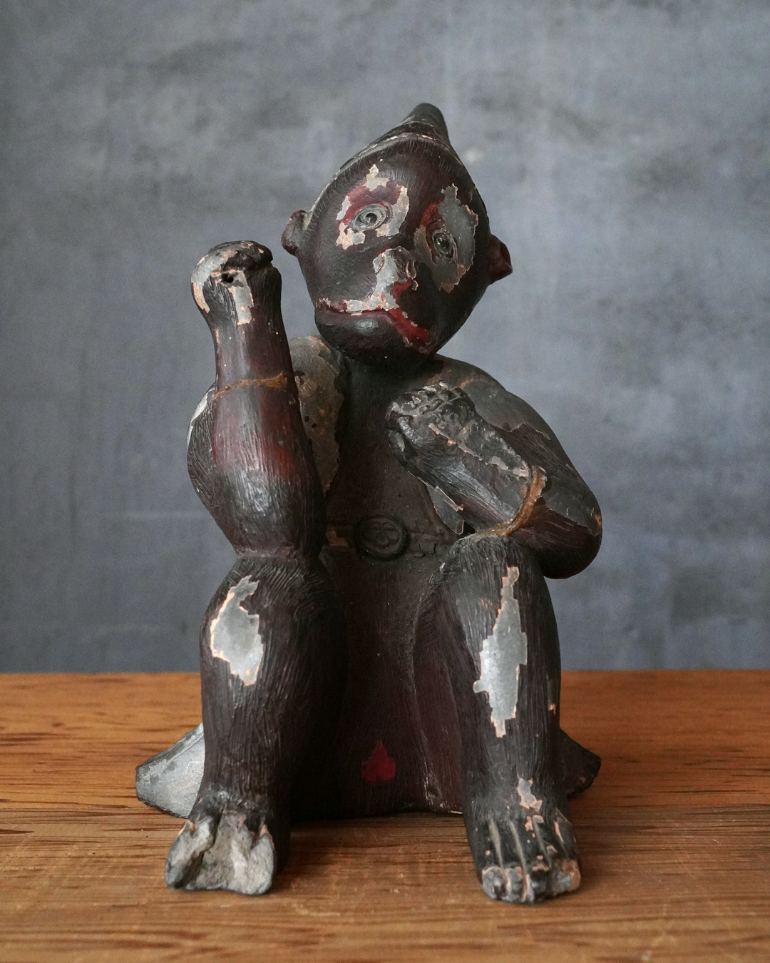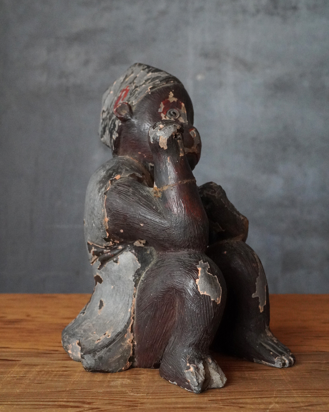 瓦質の焼成陶に漆彩を施した神猿像。日吉・日枝大社を中心とする山王信仰に関わる作例と考えられます。神猿は古来より神の使いとされ、魔除けの霊験を有する存在として信仰されてきました。