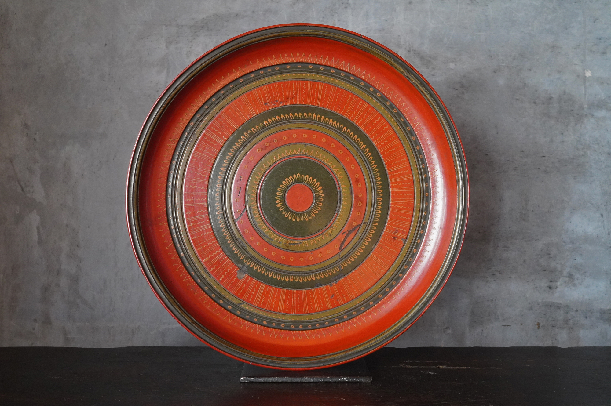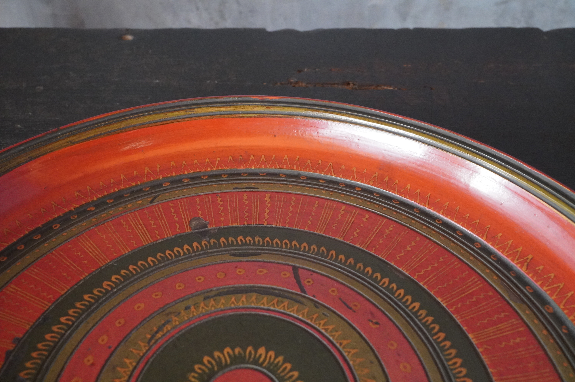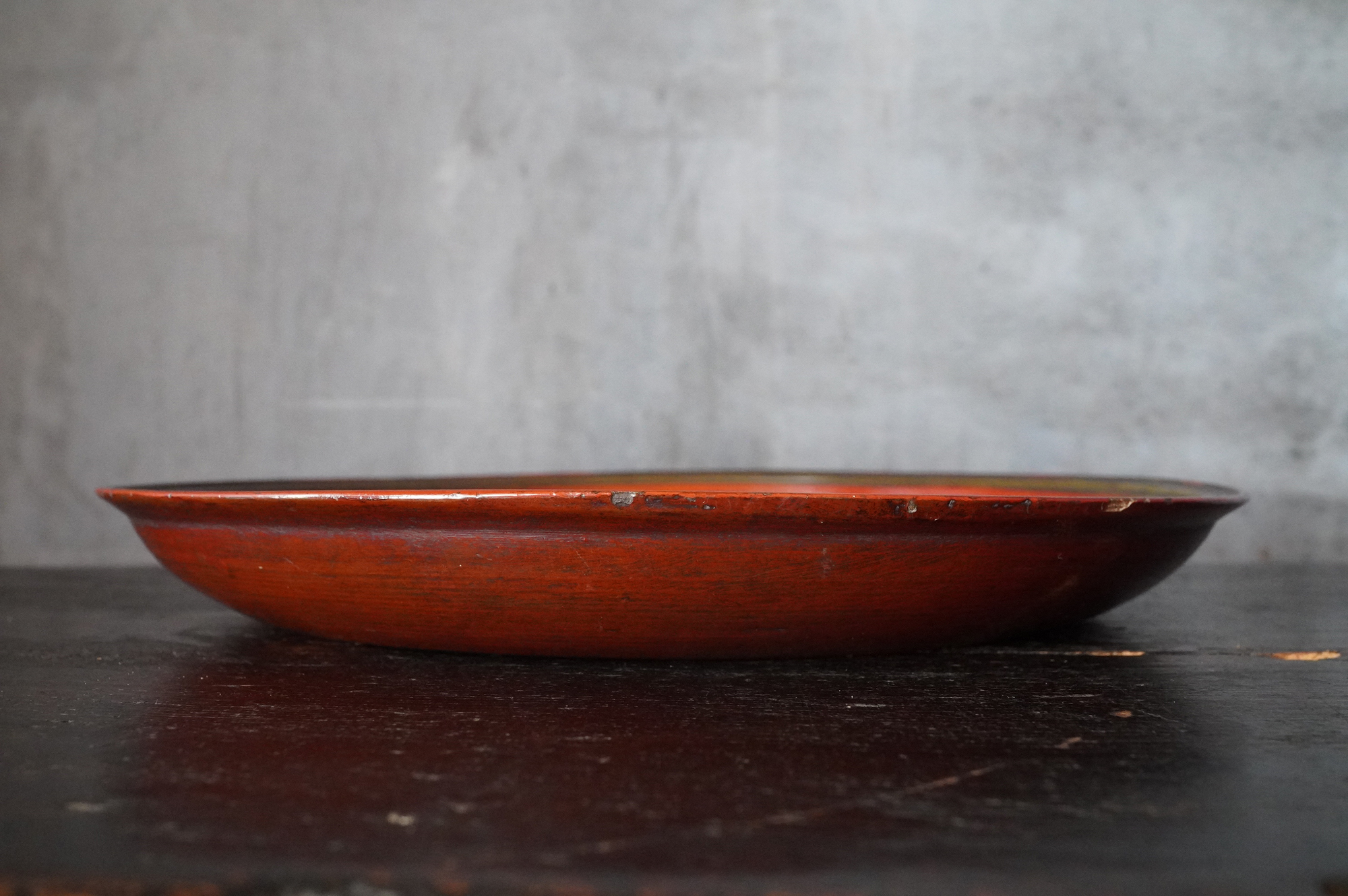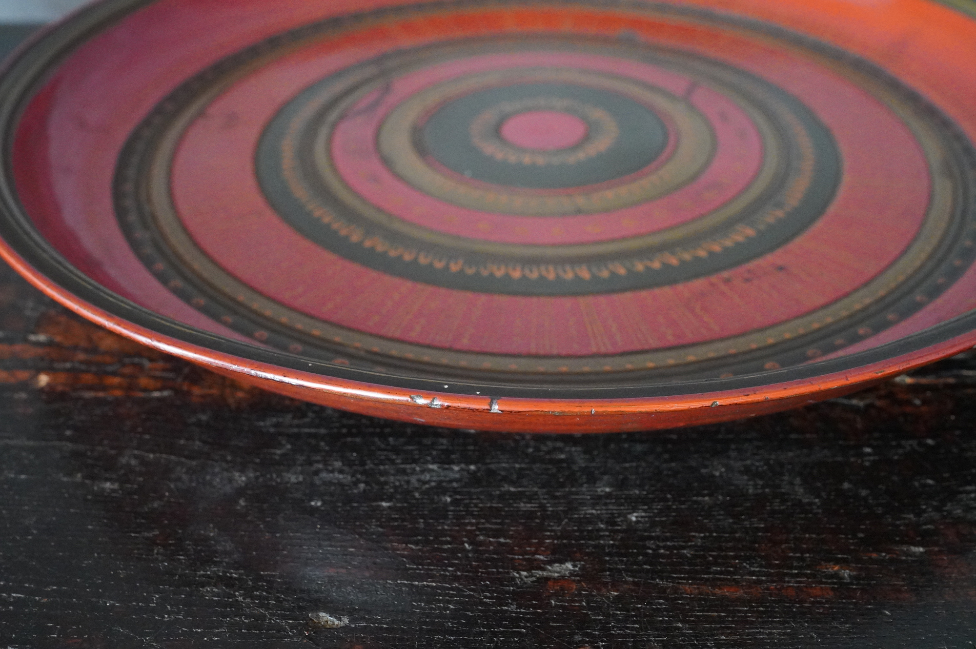薄く挽かれた木地に、異国の風を感じさせる鮮やかな彩色が施された独楽盆。日本の漆器とは趣を異にする、どこか大らかで伸びやかな南方特有と思われる色彩が大きな魅力となっています。江戸時代に舶載された作例で、これらを範として日本でも写しが制作されました。本作はその源流にあたる存在といえるでしょう。時代相応の経年変化また裏側の塗りが少し浮いている部分があります。養生箱付。