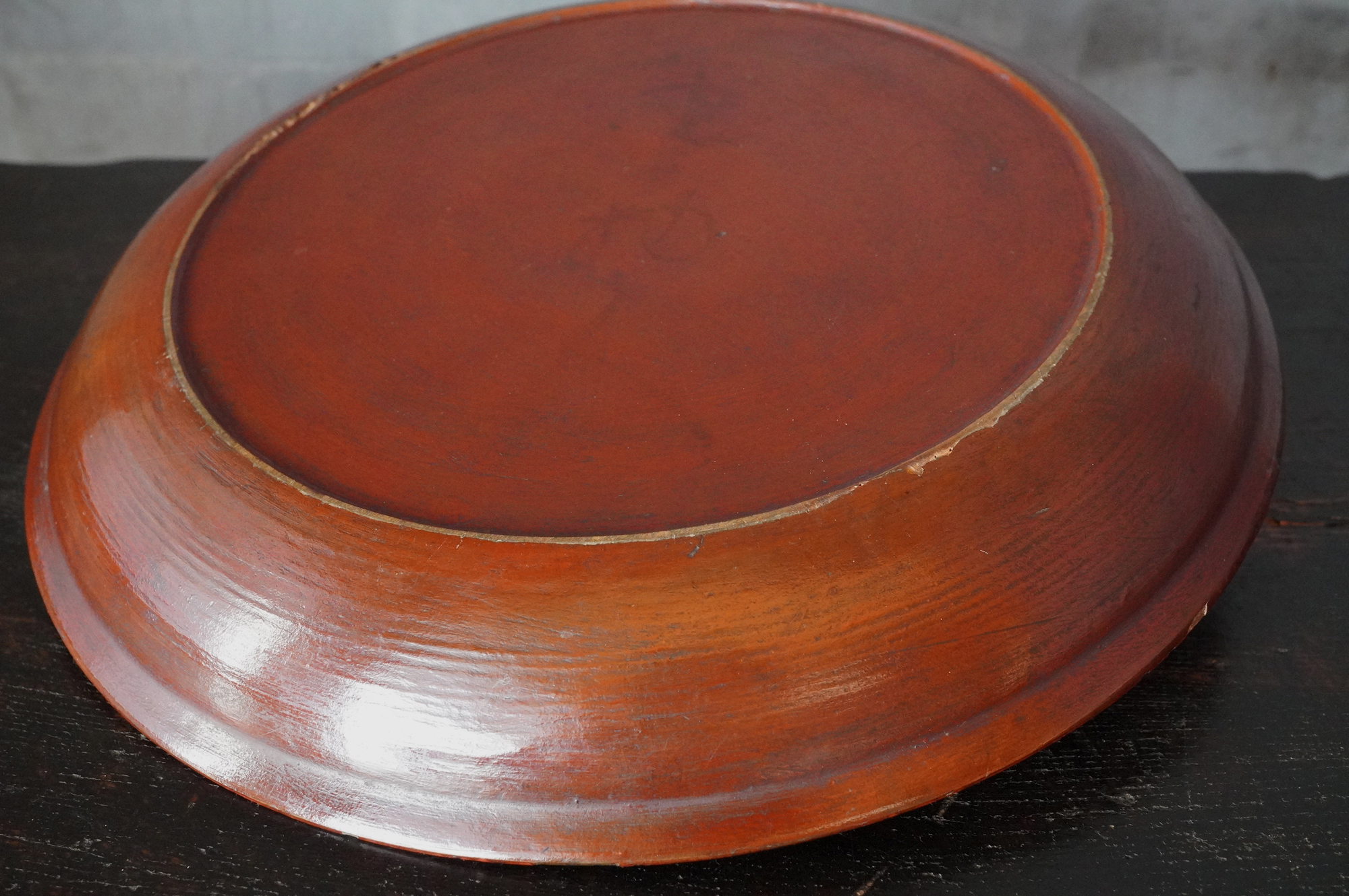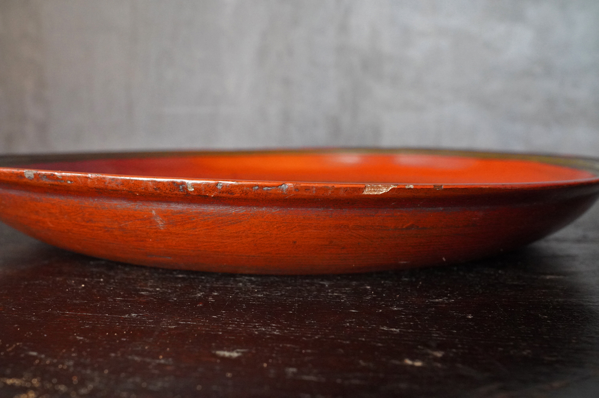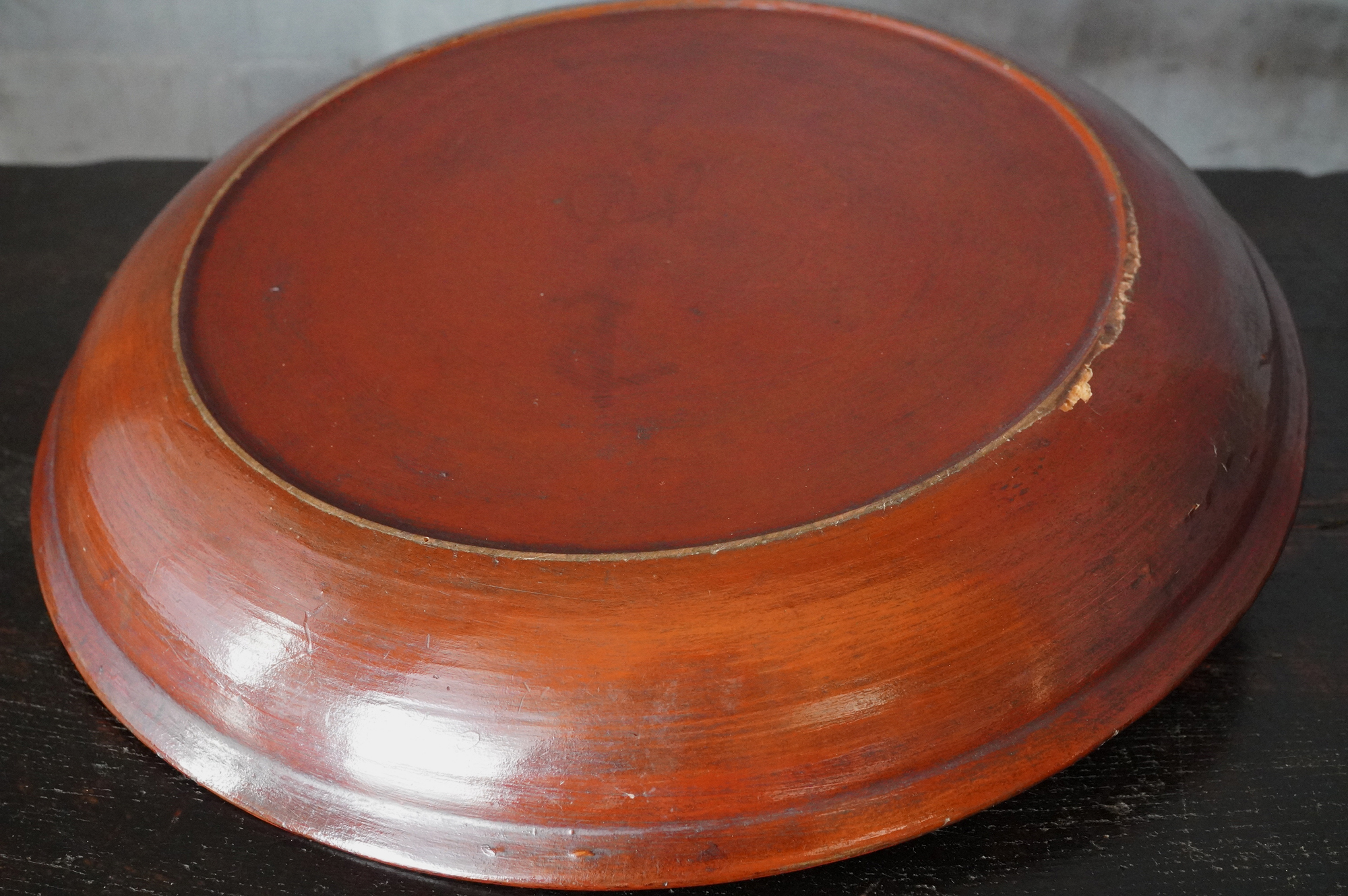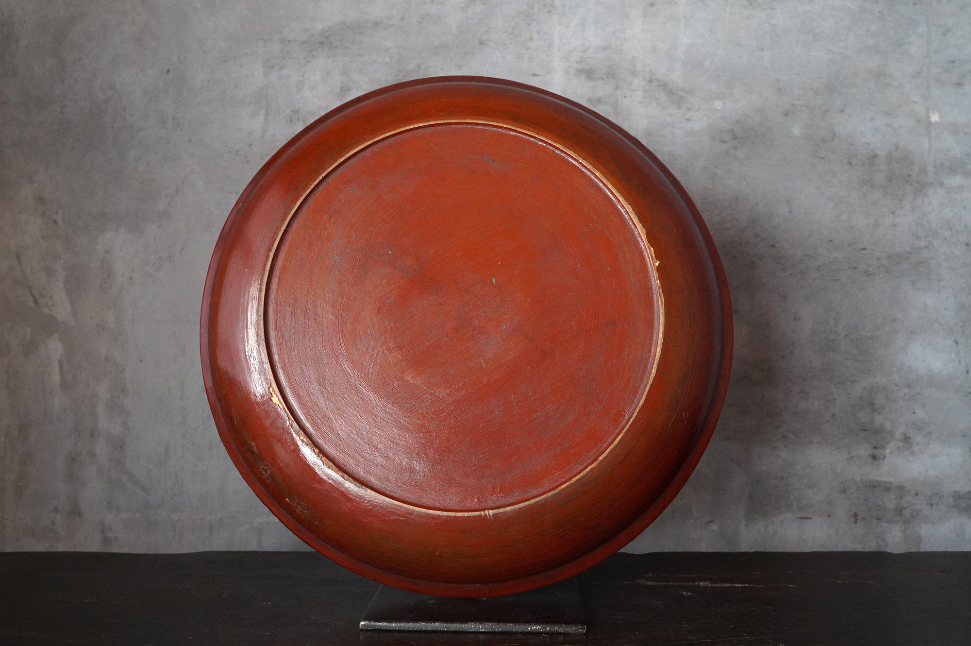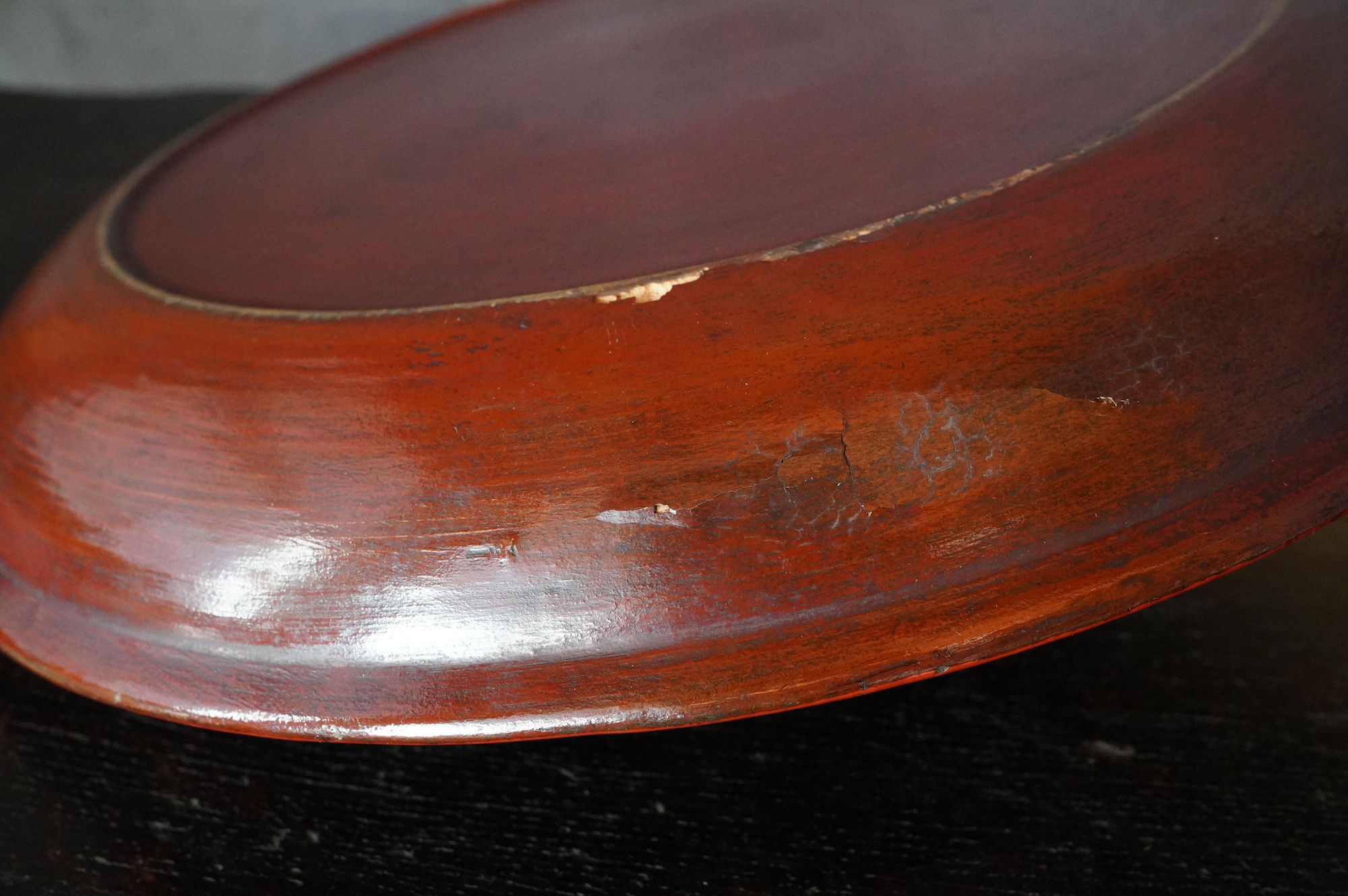 薄く挽かれた木地に、異国の風を感じさせる鮮やかな彩色が施された独楽盆。日本の漆器とは趣を異にする、どこか大らかで伸びやかな南方特有と思われる色彩が大きな魅力となっています。江戸時代に舶載された作例で、これらを範として日本でも写しが制作されました。本作はその源流にあたる存在といえるでしょう。時代相応の経年変化また裏側の塗りが少し浮いている部分があります。養生箱付。