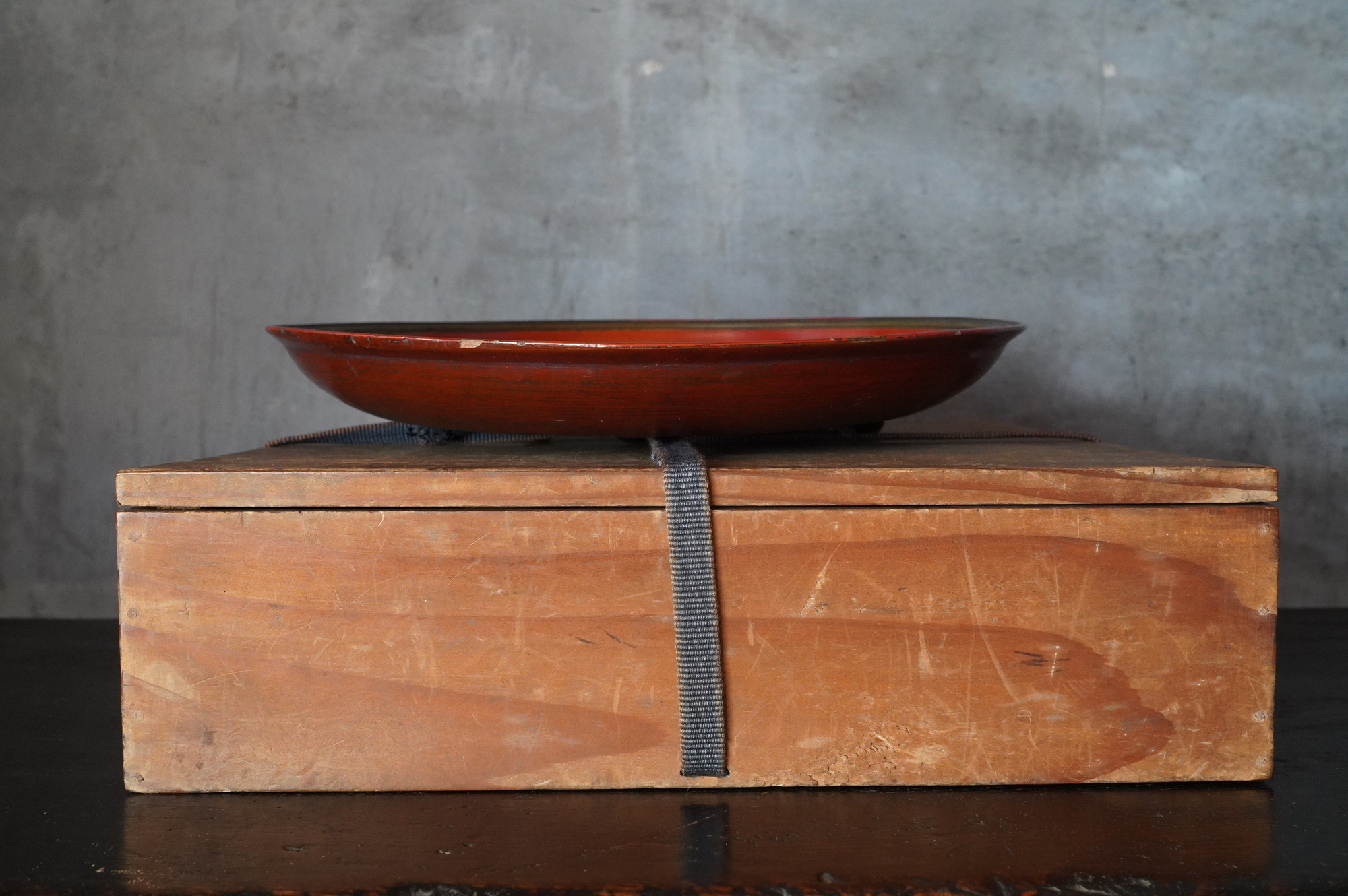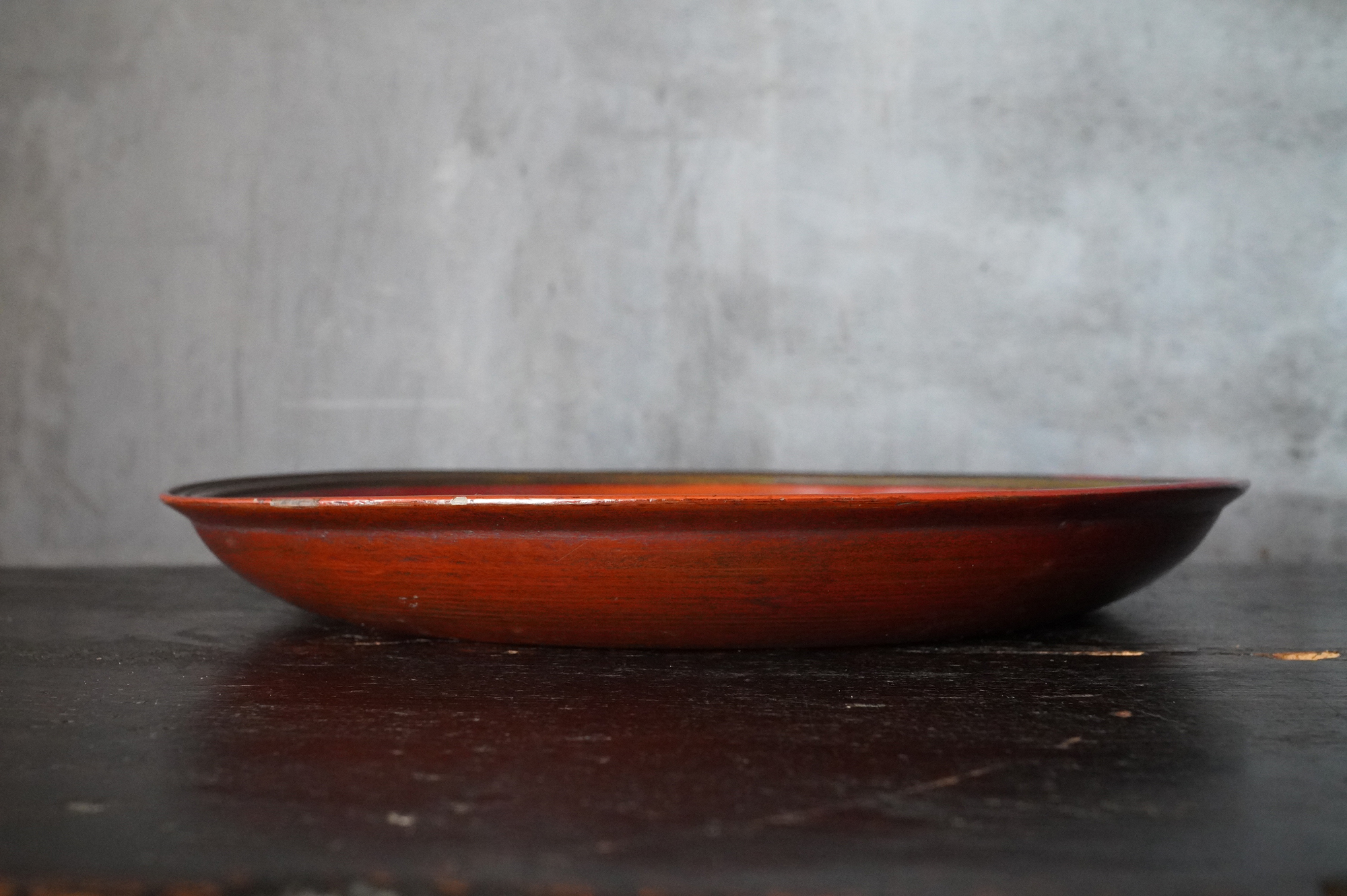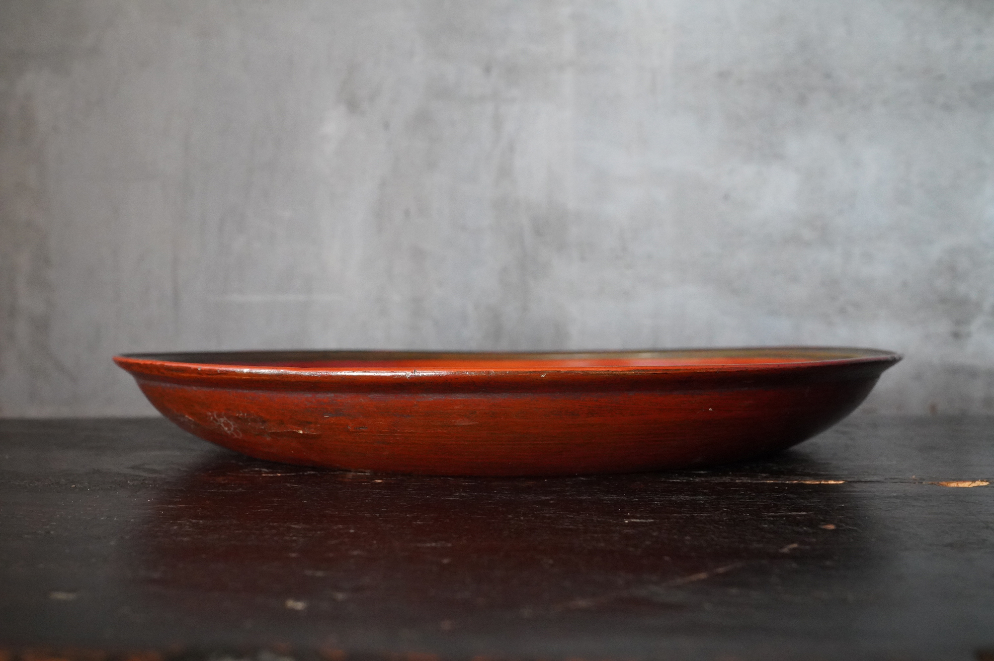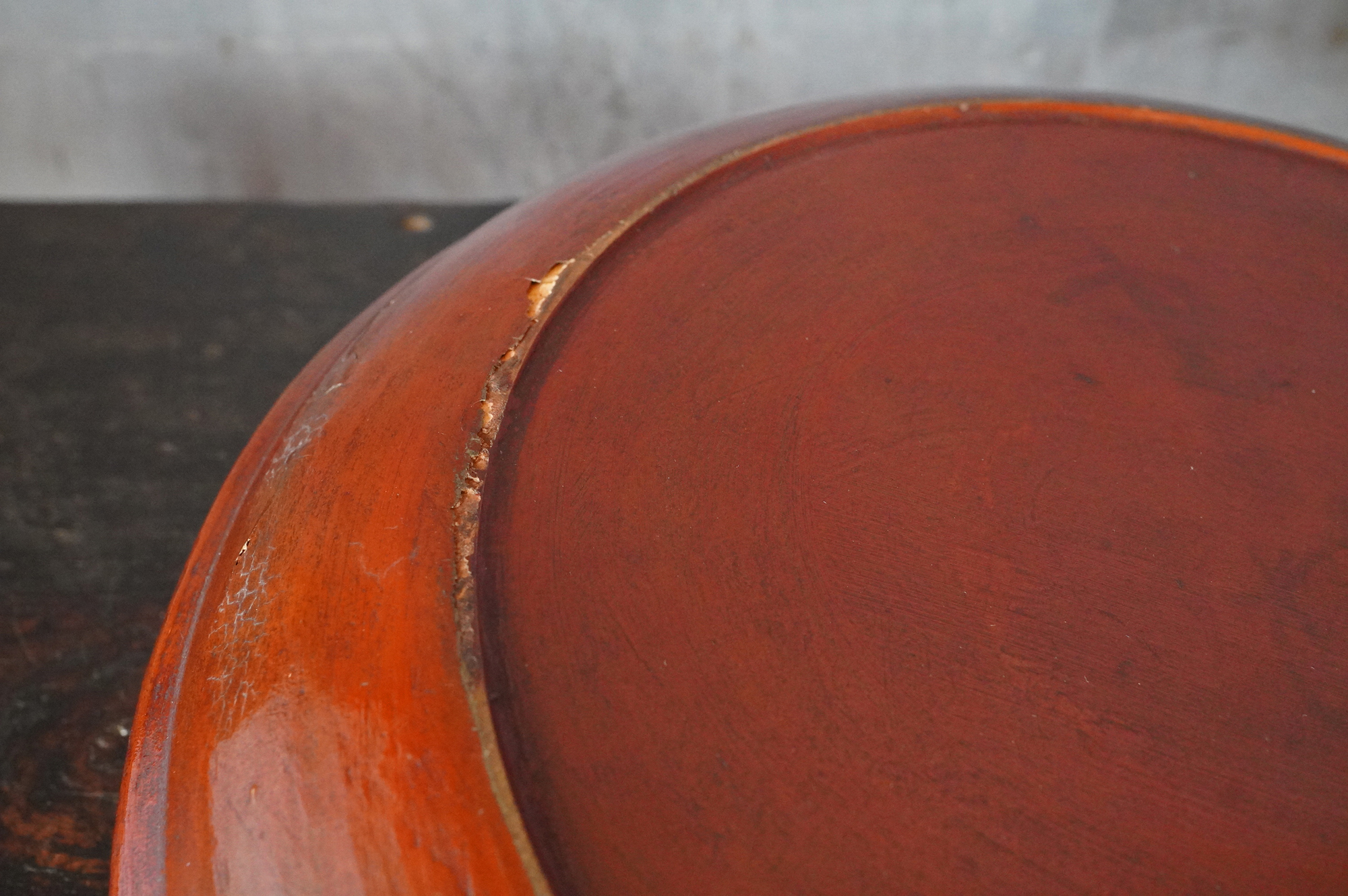 薄く挽かれた木地に、異国の風を感じさせる鮮やかな彩色が施された独楽盆。日本の漆器とは趣を異にする、どこか大らかで伸びやかな南方特有と思われる色彩が大きな魅力となっています。江戸時代に舶載された作例で、これらを範として日本でも写しが制作されました。本作はその源流にあたる存在といえるでしょう。時代相応の経年変化また裏側の塗りが少し浮いている部分があります。養生箱付。