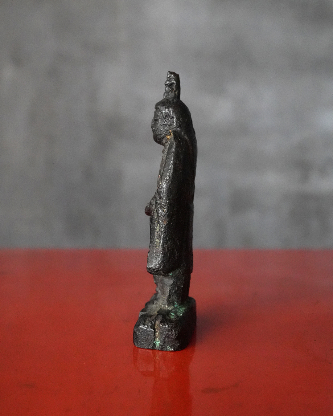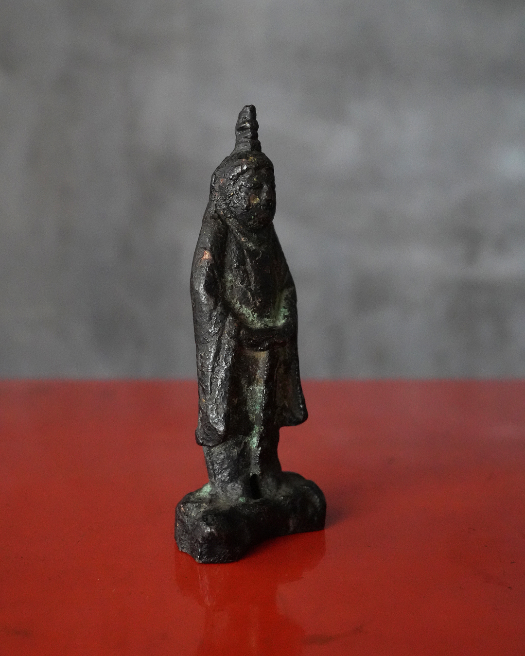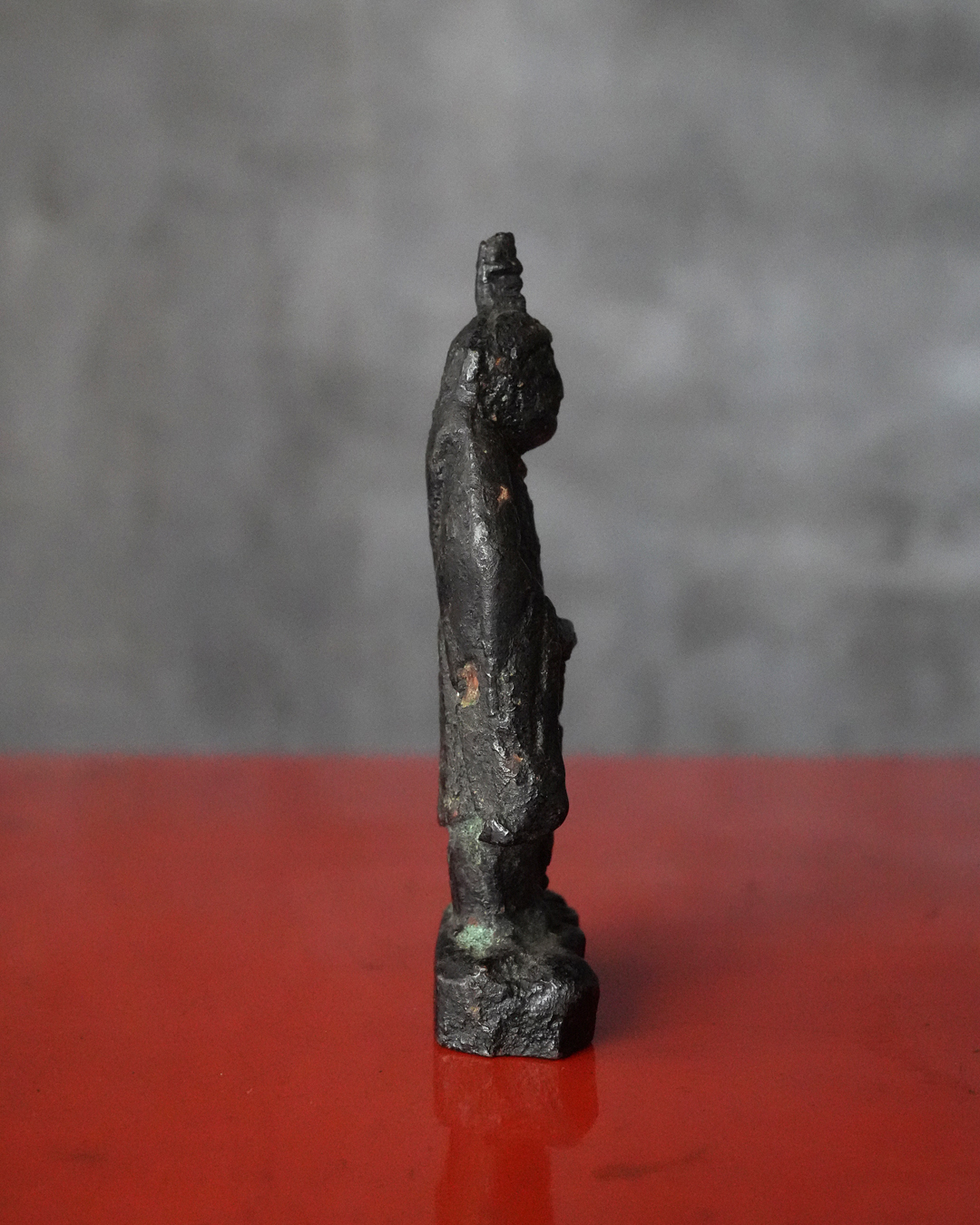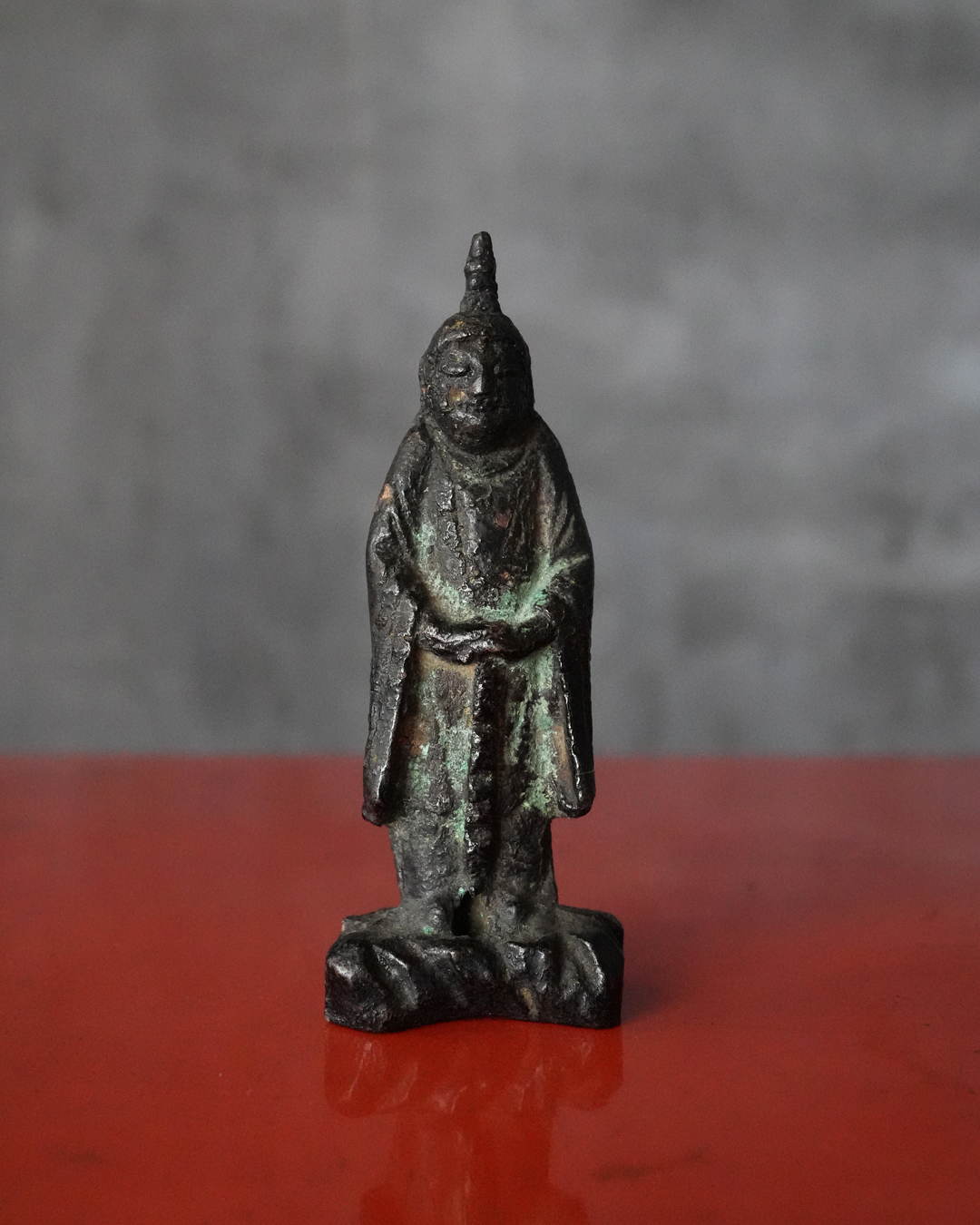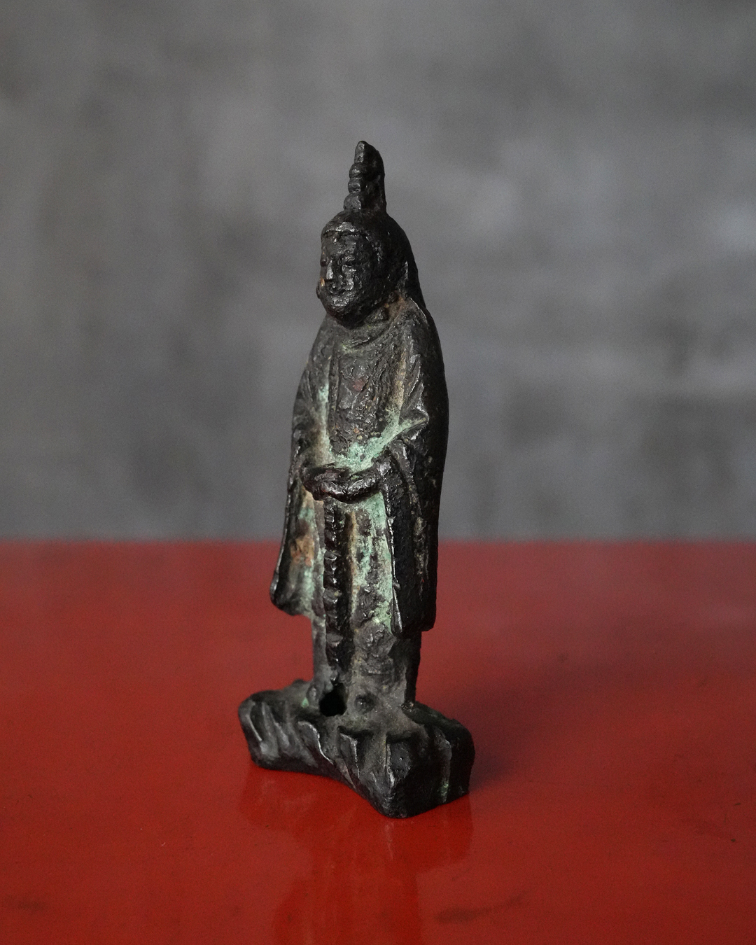 全体に落ち着いた良い金味を呈し、所々に自然な緑青があらわれています。土中や火中を経た可能性を思わせる経年の変化は見られるものの、摩耗は比較的少なく、像容はよく保たれています。状態は概ね良好。
