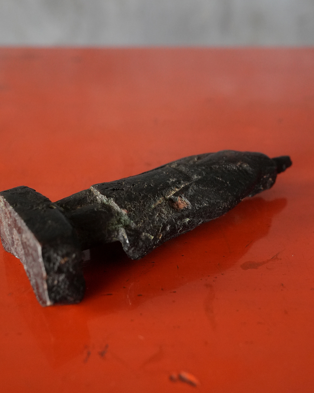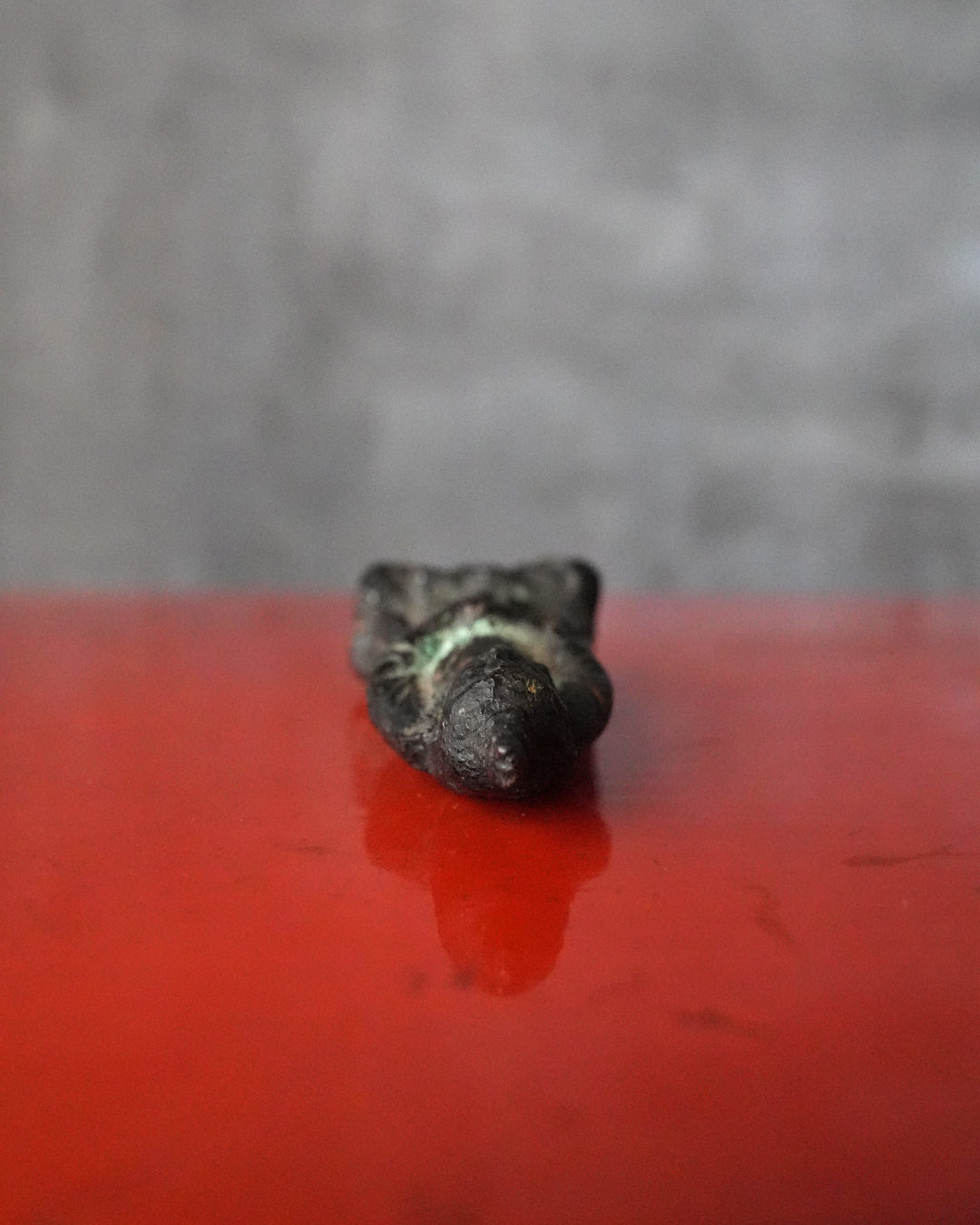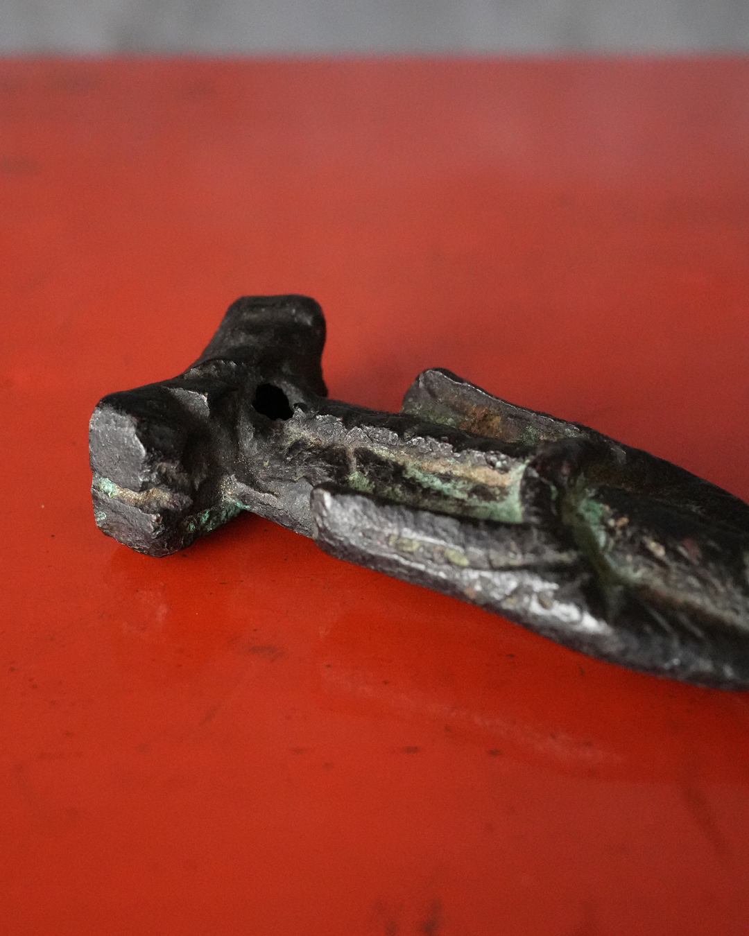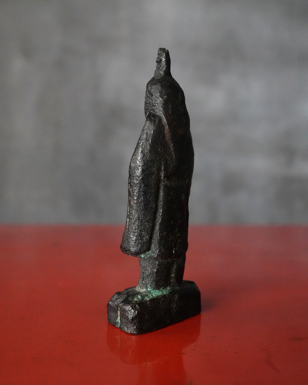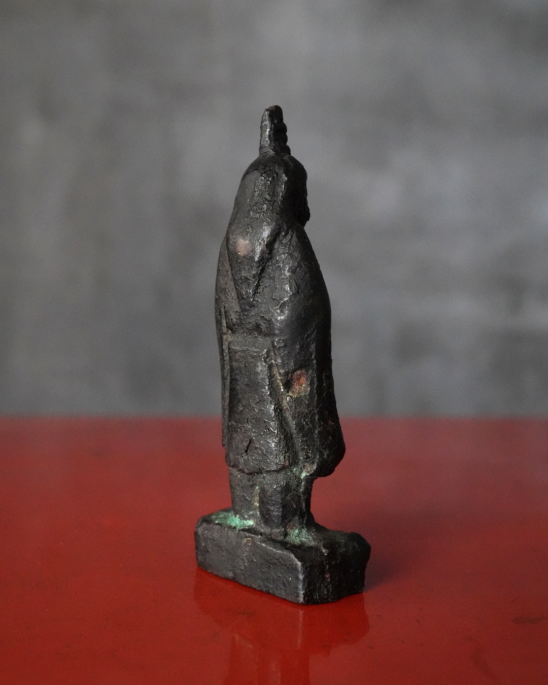 全体に落ち着いた良い金味を呈し、所々に自然な緑青があらわれています。土中や火中を経た可能性を思わせる経年の変化は見られるものの、摩耗は比較的少なく、像容はよく保たれています。状態は概ね良好。