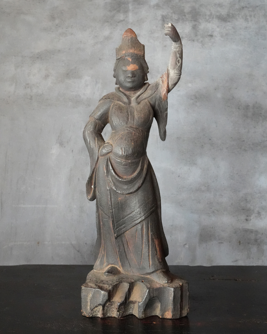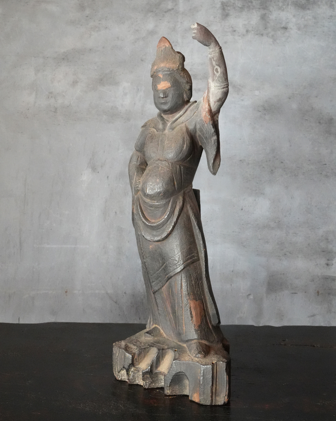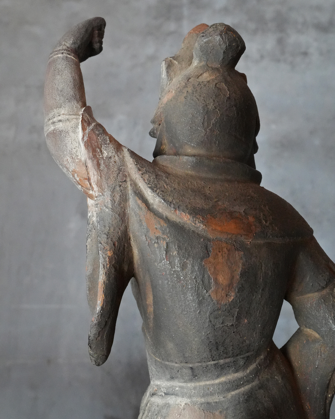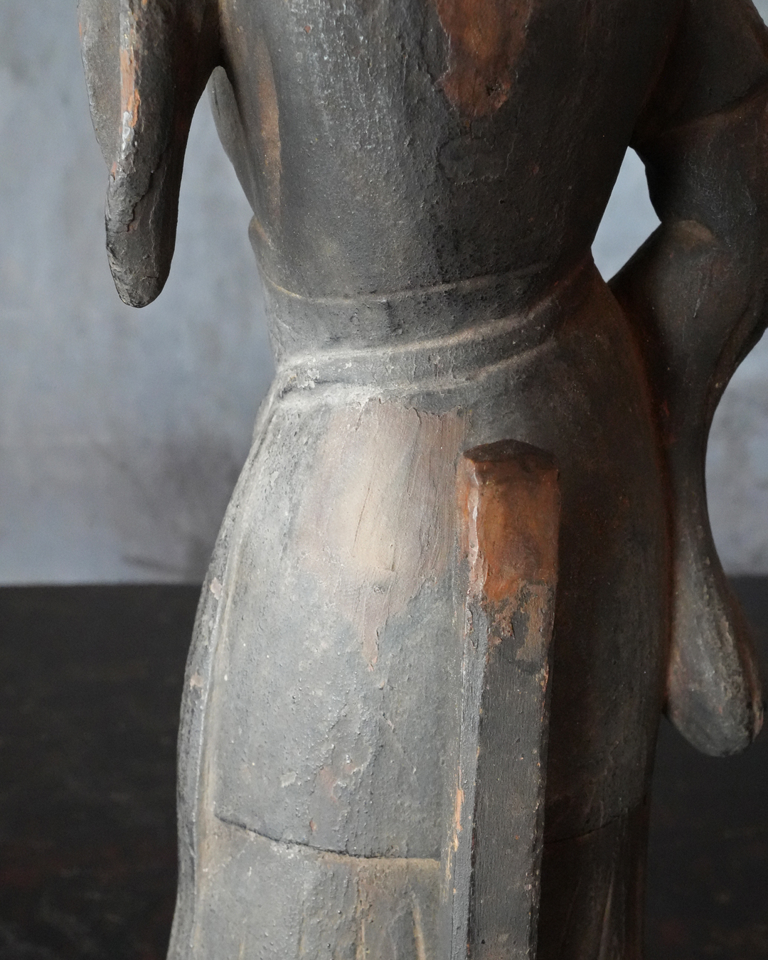 持物は失われており、高く上げた左手は途中から折れてしまったようで新しいものに代わっています。また所々にある薄茶色の白っぽく色の薄い部分は全て後補です。虫喰いにより木質の粉がわずかに落ちる箇所もございます。とはいえ、こうした点を差し引いても、なお像全体から伝わる気配は豊かで、古像としての魅力を十分に備えています。時代は南北朝期頃に遡るものと考えられ、造形からも、さらに時代が上がる可能性を感じさせる一躯です。
