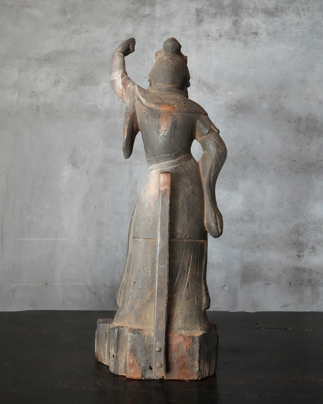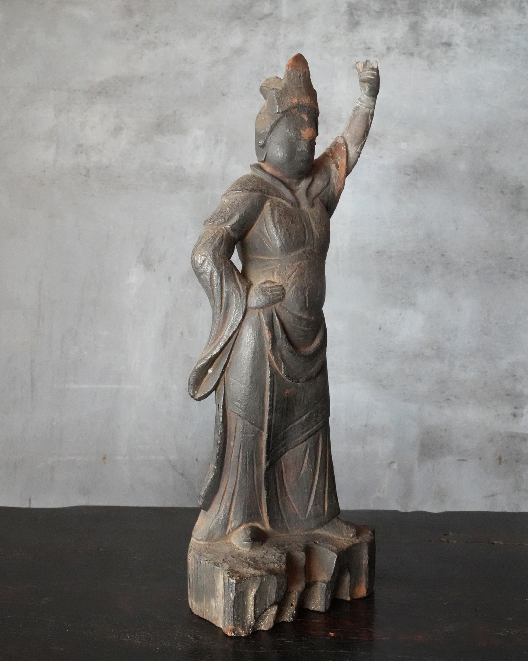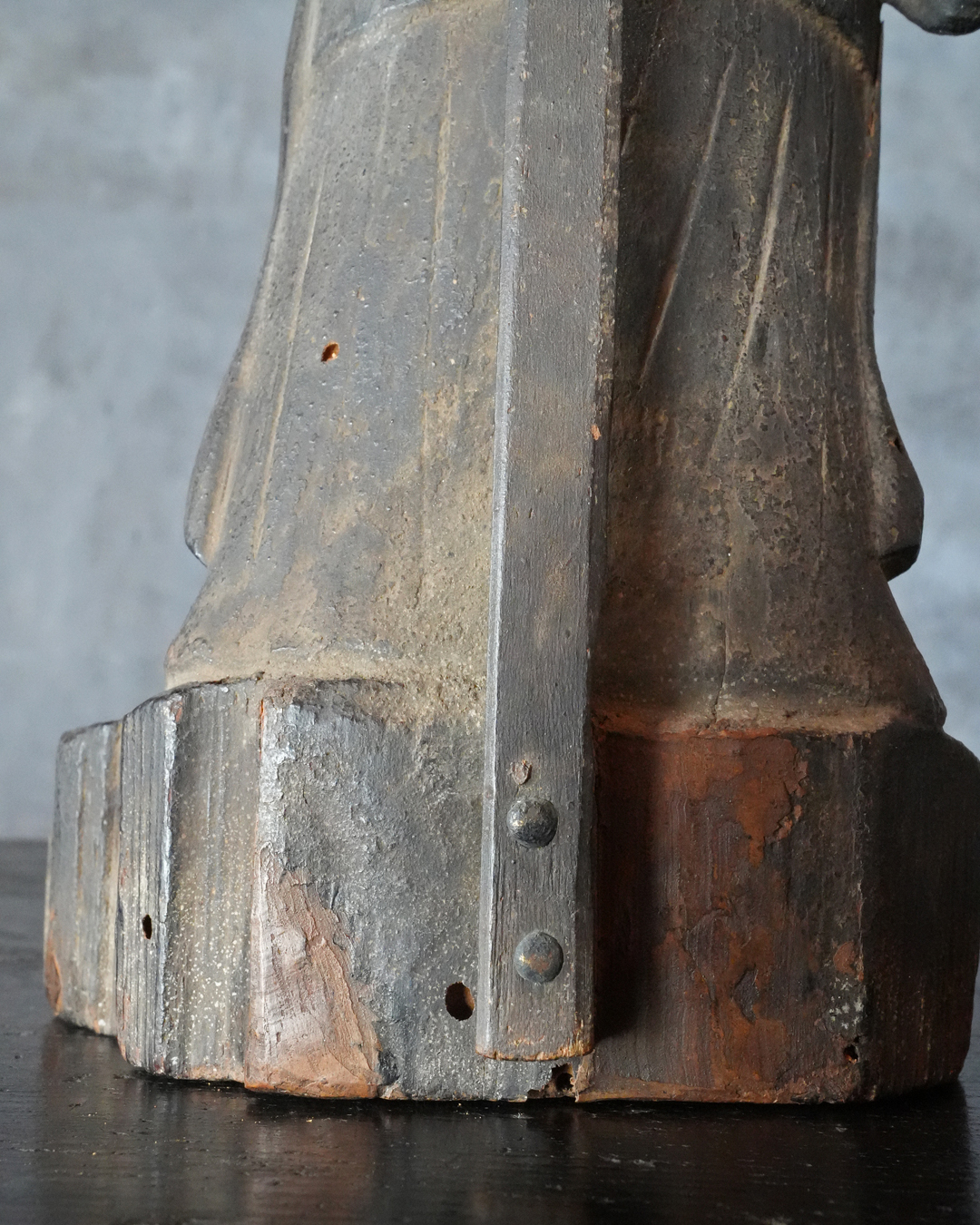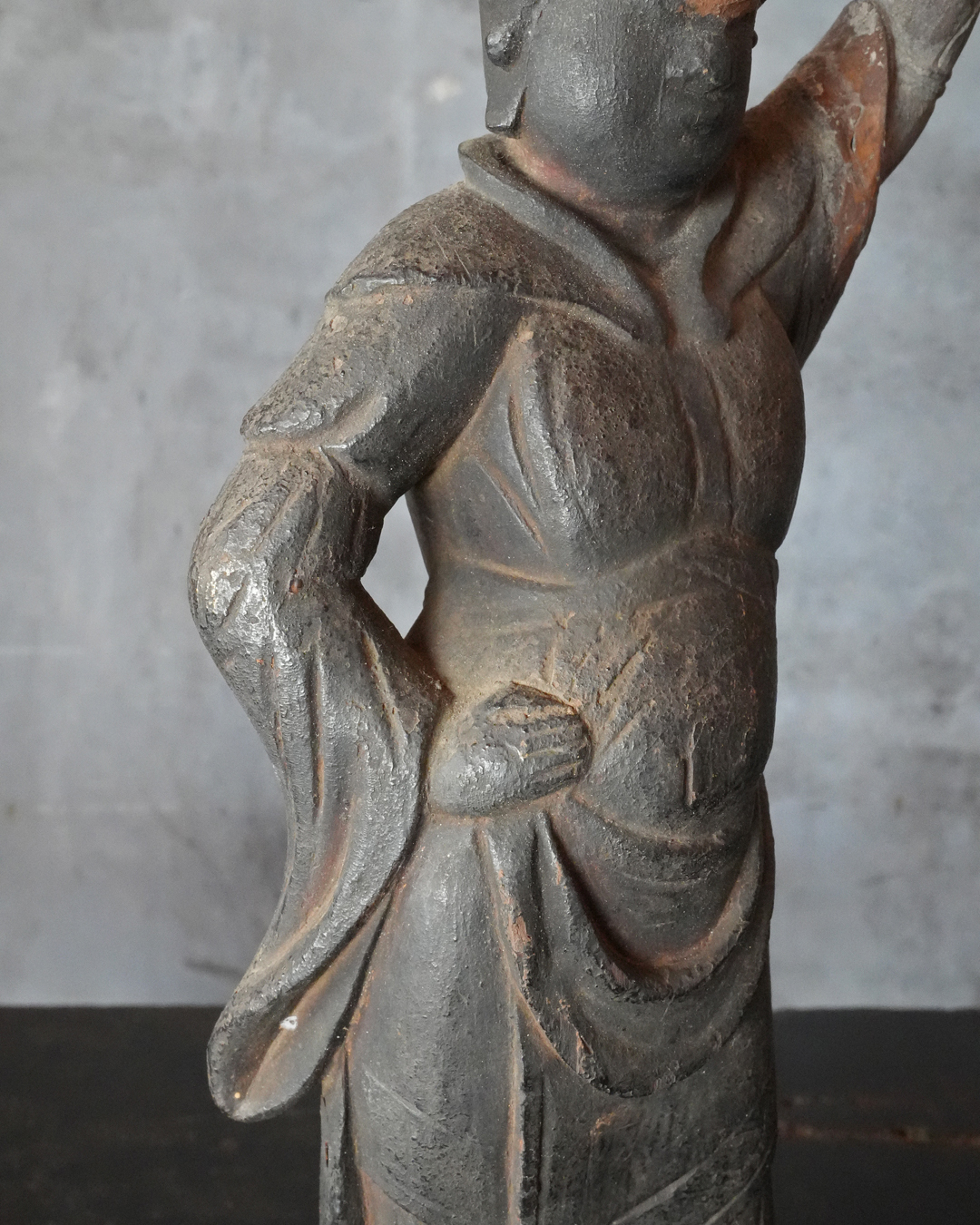 持物は失われており、高く上げた左手は途中から折れてしまったようで新しいものに代わっています。また所々にある薄茶色の白っぽく色の薄い部分は全て後補です。虫喰いにより木質の粉がわずかに落ちる箇所もございます。とはいえ、こうした点を差し引いても、なお像全体から伝わる気配は豊かで、古像としての魅力を十分に備えています。時代は南北朝期頃に遡るものと考えられ、造形からも、さらに時代が上がる可能性を感じさせる一躯です。