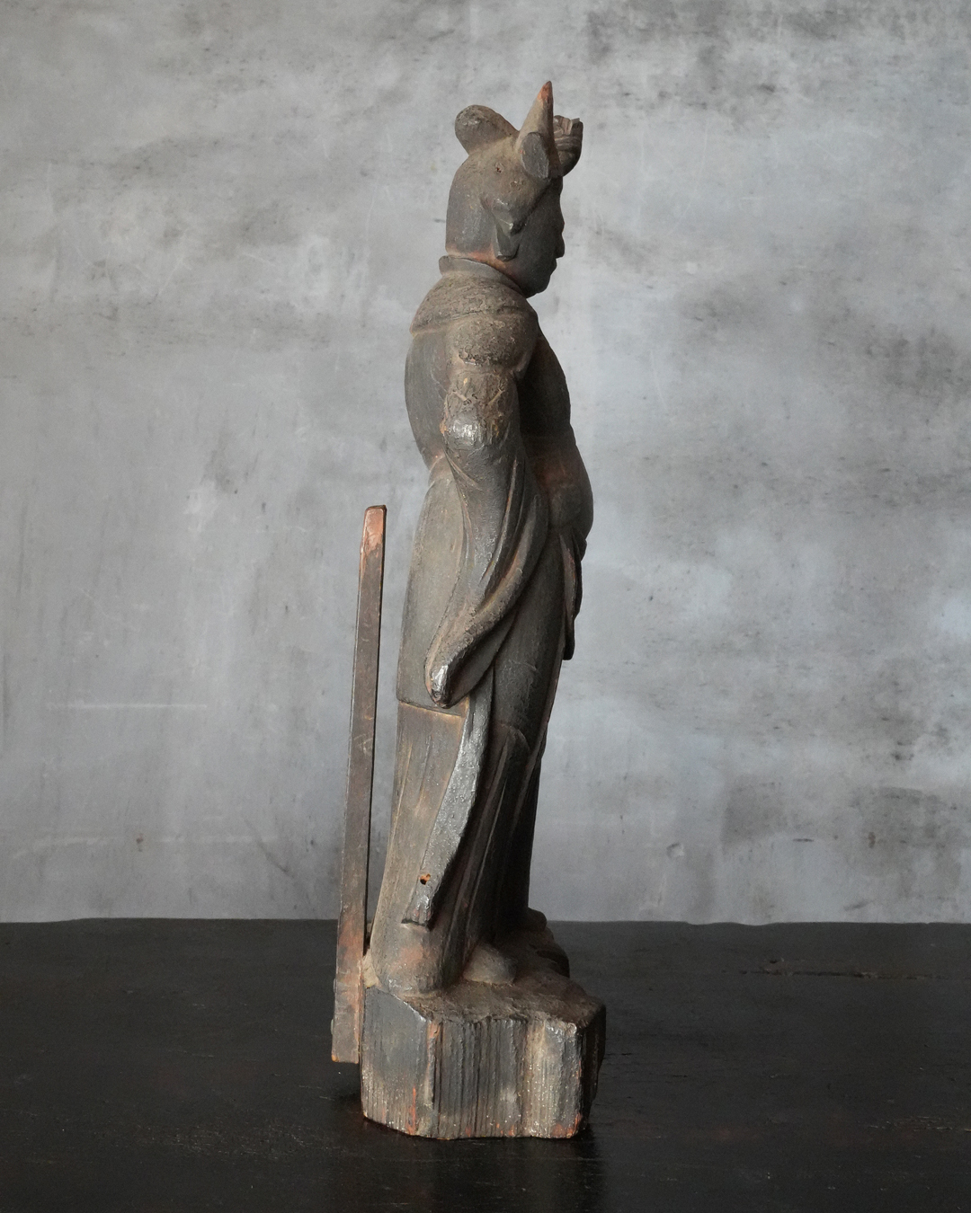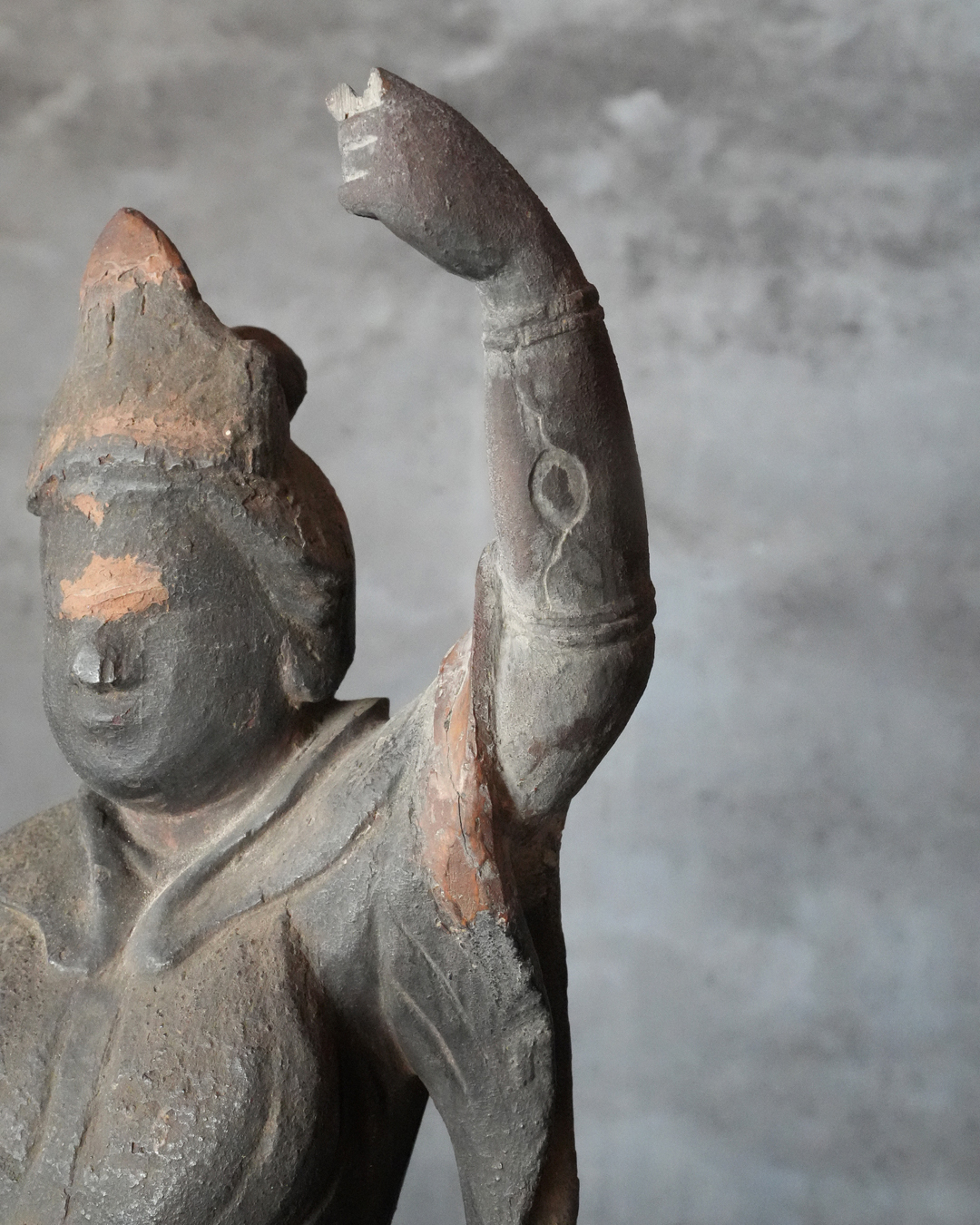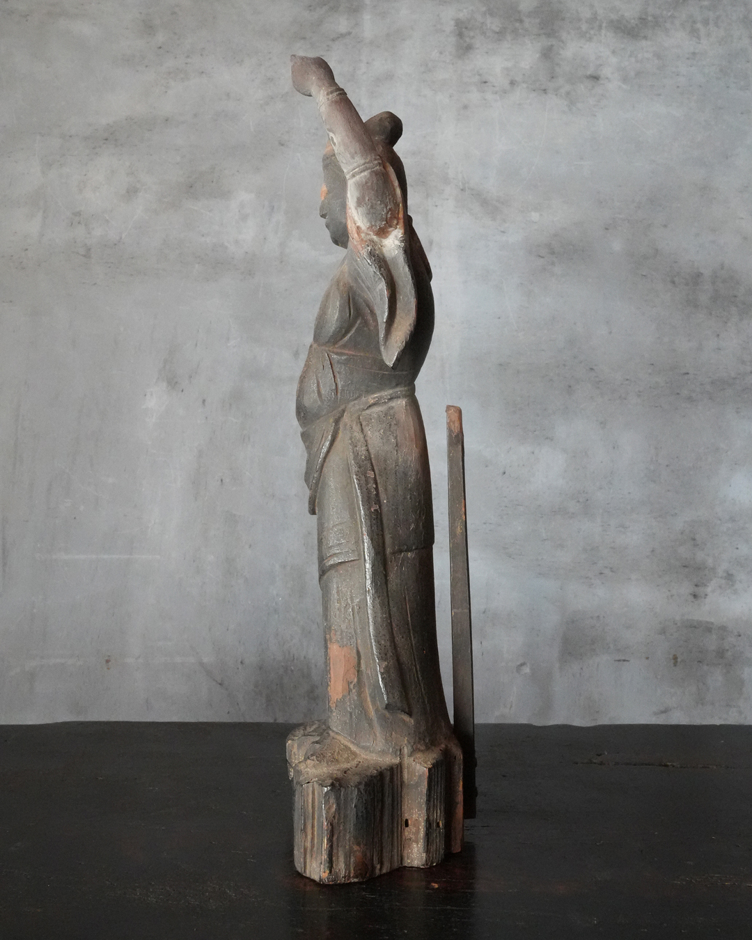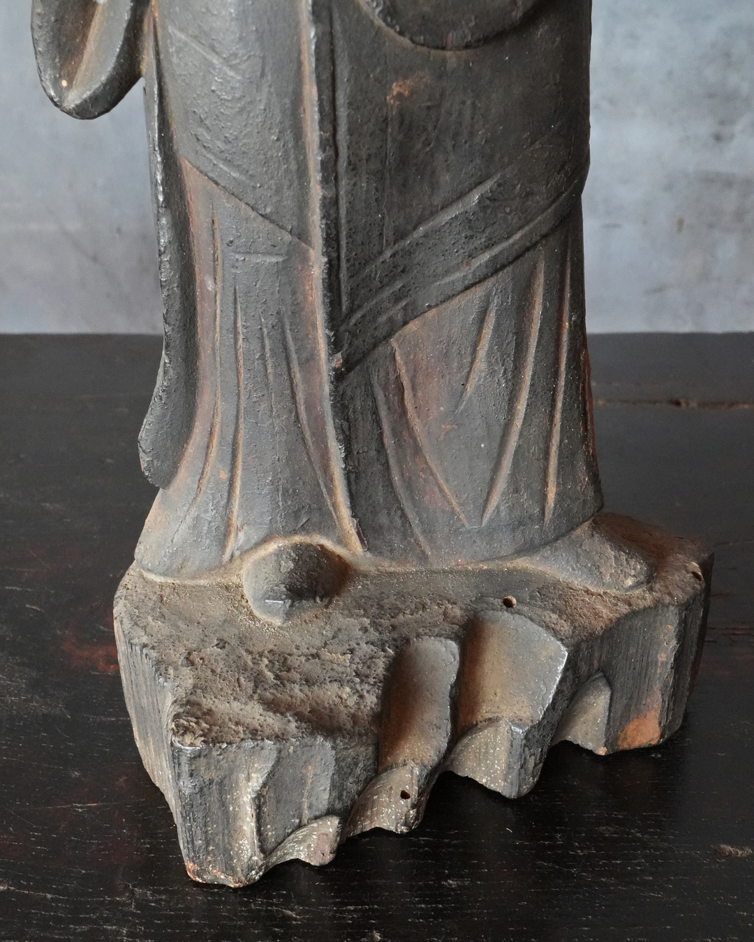 持物は失われており、高く上げた左手は途中から折れてしまったようで新しいものに代わっています。また所々にある薄茶色の白っぽく色の薄い部分は全て後補です。虫喰いにより木質の粉がわずかに落ちる箇所もございます。とはいえ、こうした点を差し引いても、なお像全体から伝わる気配は豊かで、古像としての魅力を十分に備えています。時代は南北朝期頃に遡るものと考えられ、造形からも、さらに時代が上がる可能性を感じさせる一躯です。