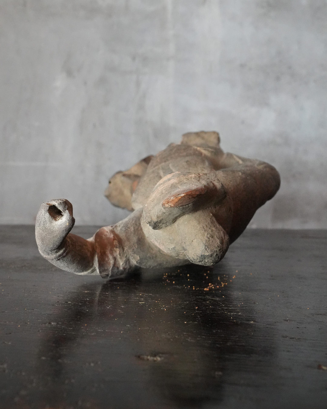 後補や欠損があり、決して状態良好とは申せませんが、腰を捻った立ち姿に、この像ならではの魅力が感じられる毘沙門天像。量感のあるフォルムは自然で、造形そのものの力によって見る者を惹きつけます。形の良さだけでこれほど印象に残る作例は、そう多くはありません。