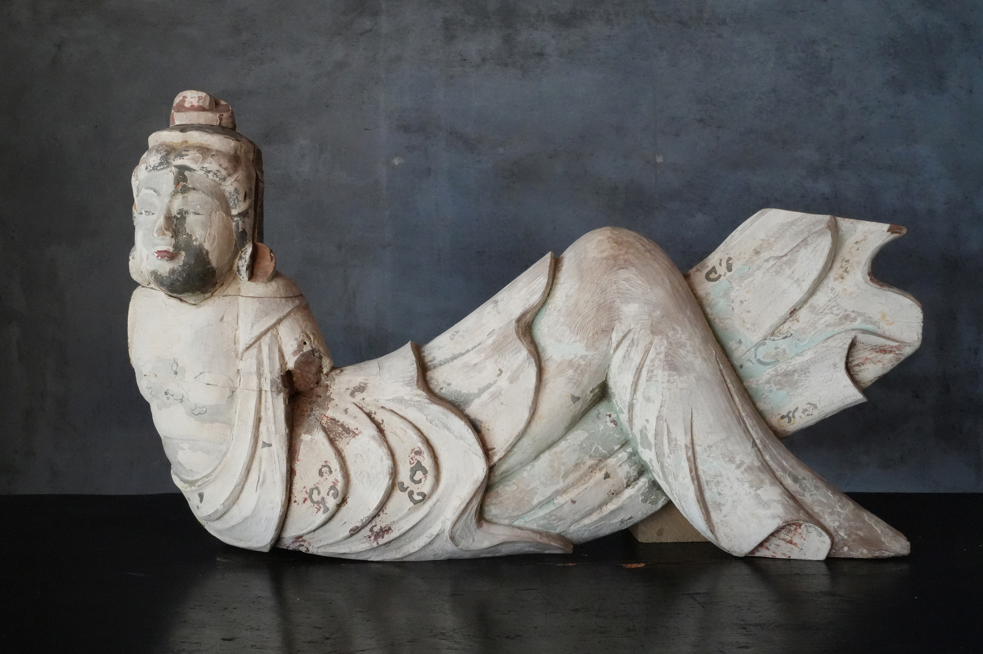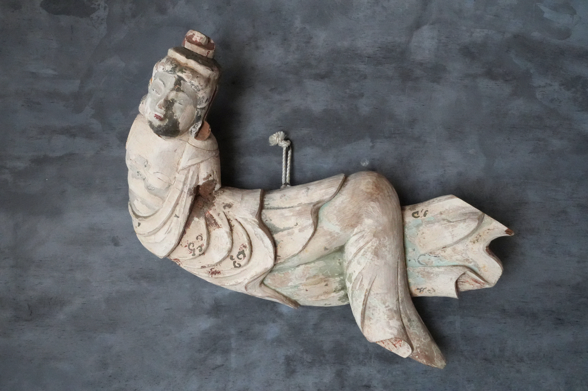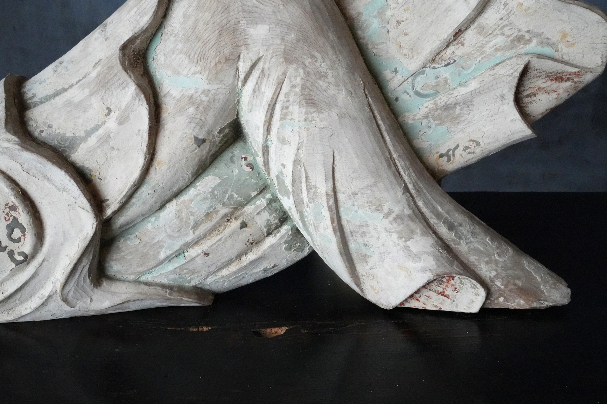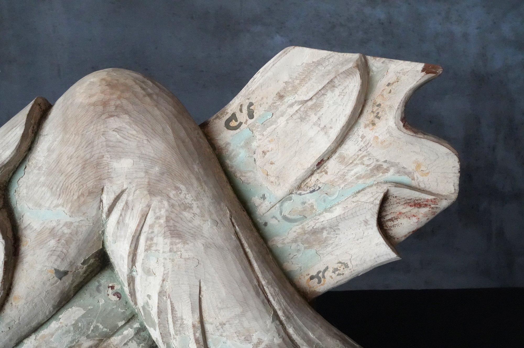 寺院内陣の飛天像装飾の一部と考えられるでしょう。寸法から見ても、相応の規模と格式を備えた寺院に用いられていたものであったことが想像されます。全体には胡粉による下地が施されており、制作当初は極彩色による華やかな彩色彫刻であったことがうかがえます。胡粉は、手に取ると付着する状態ですので、掃除や濡れた布などでの手入れは一切行っておりません。