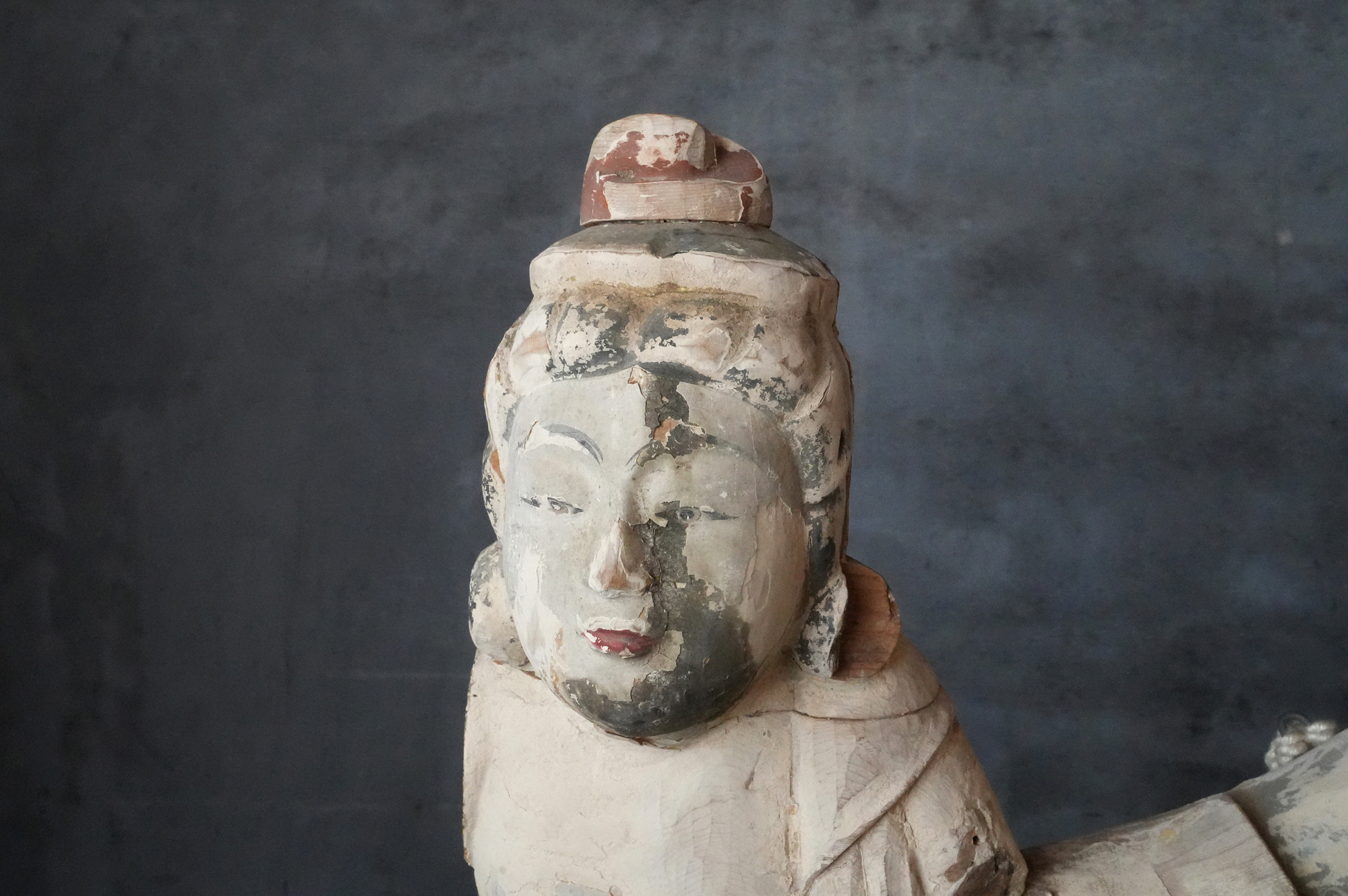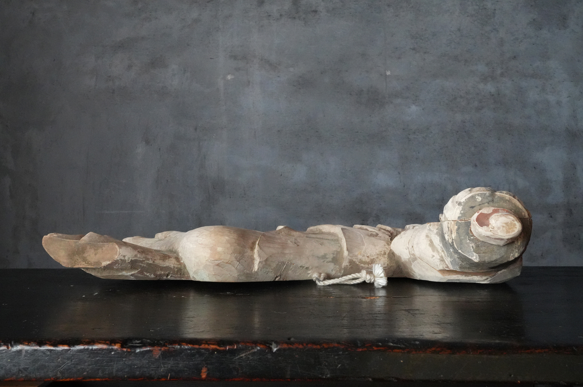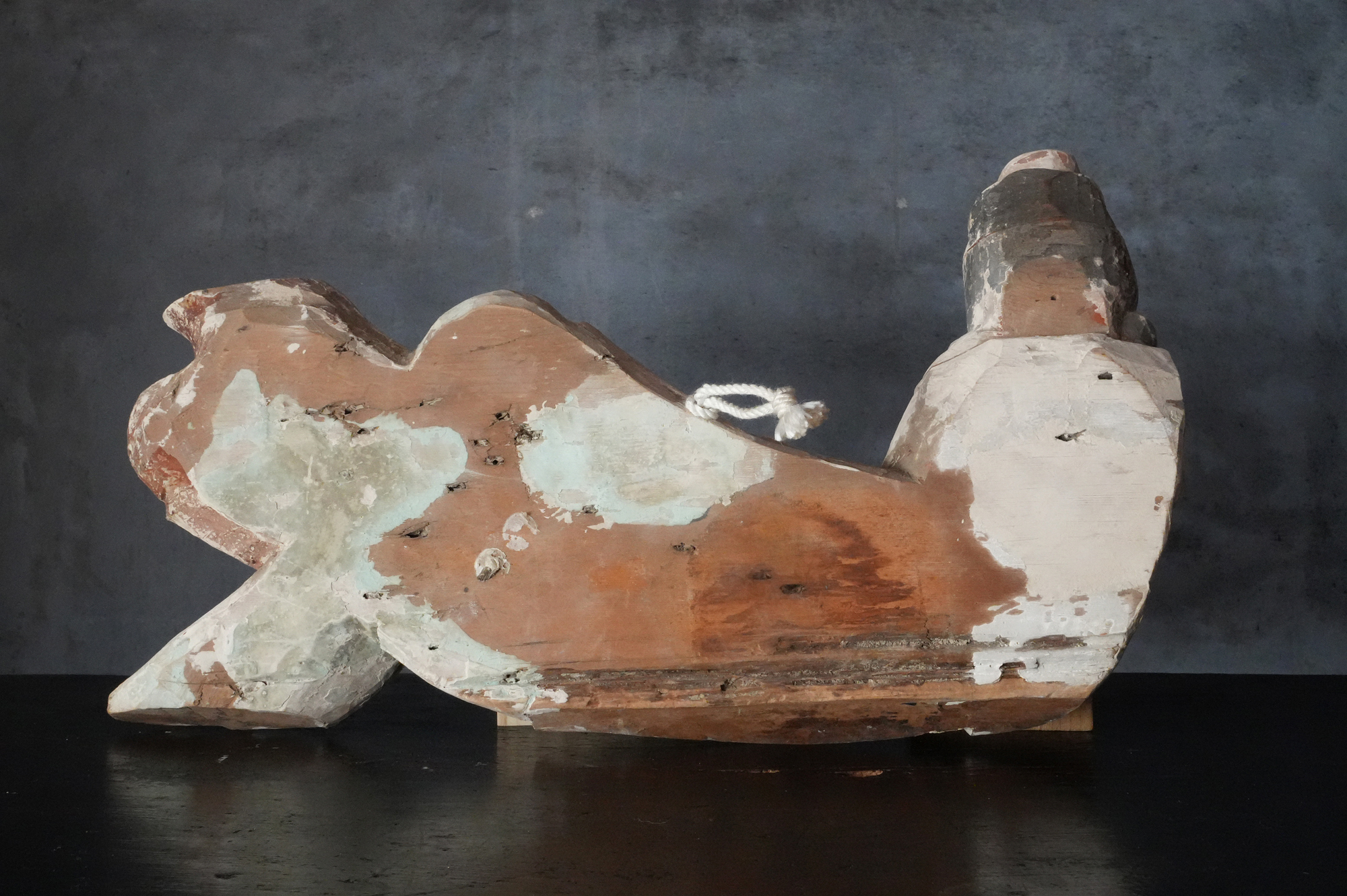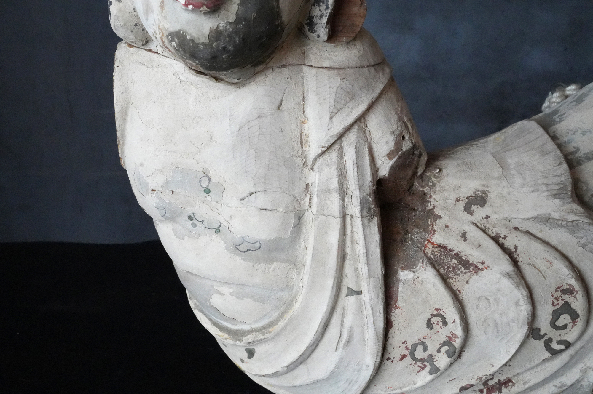 寺院内陣の飛天像装飾の一部と考えられるでしょう。寸法から見ても、相応の規模と格式を備えた寺院に用いられていたものであったことが想像されます。全体には胡粉による下地が施されており、制作当初は極彩色による華やかな彩色彫刻であったことがうかがえます。胡粉は、手に取ると付着する状態ですので、掃除や濡れた布などでの手入れは一切行っておりません。