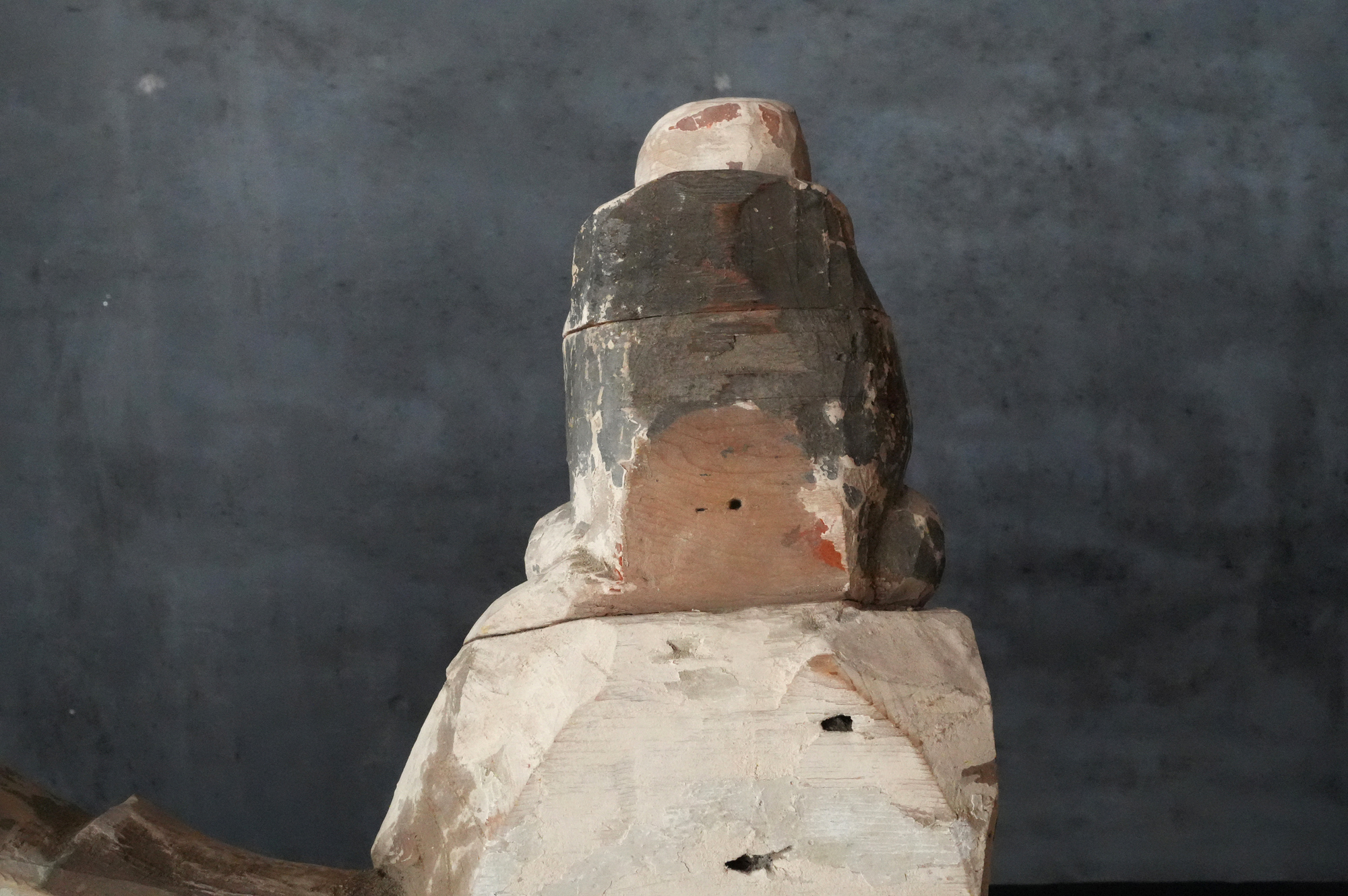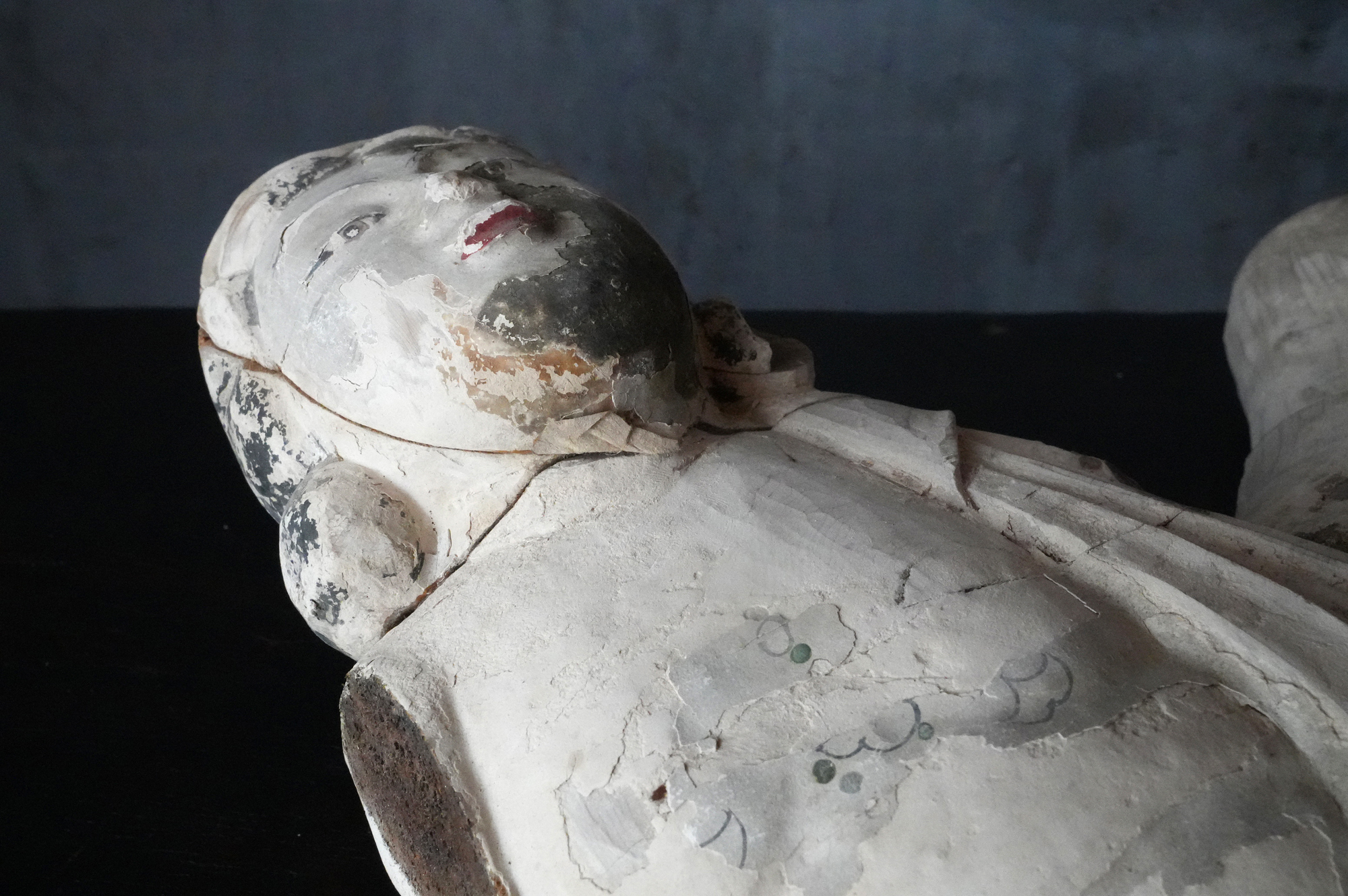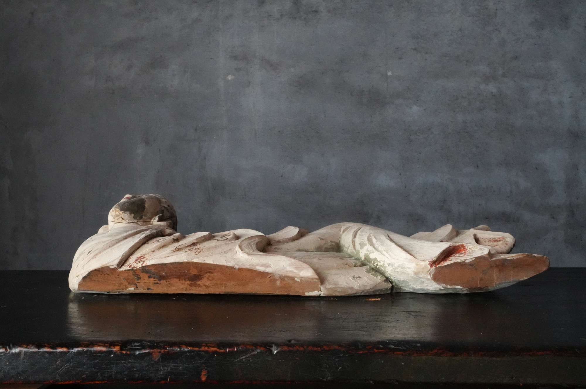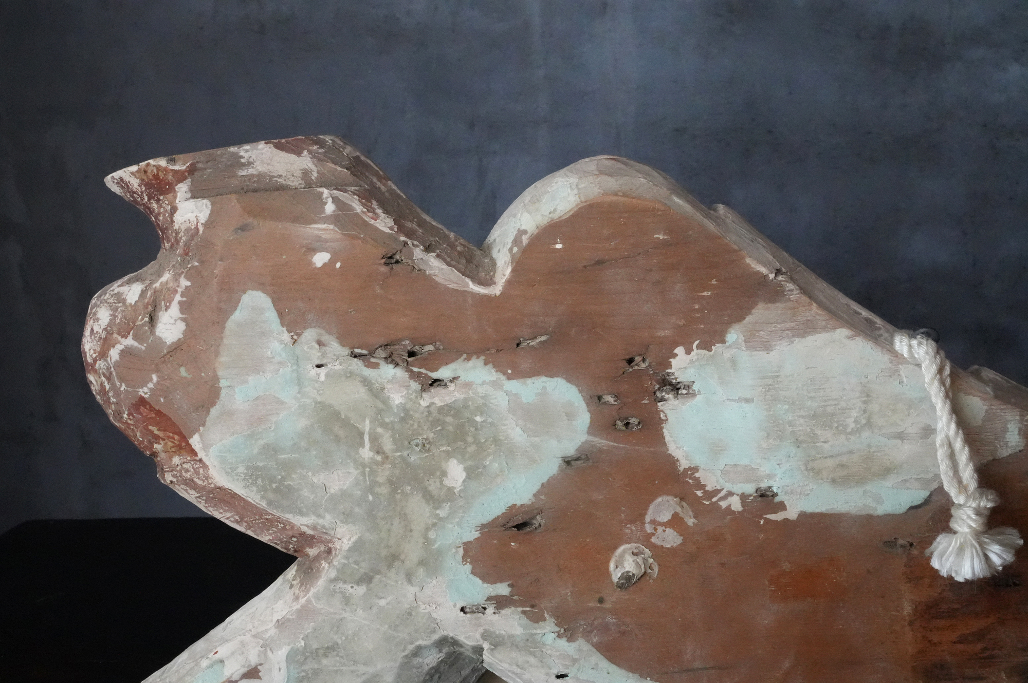 寺院内陣の飛天像装飾の一部と考えられるでしょう。寸法から見ても、相応の規模と格式を備えた寺院に用いられていたものであったことが想像されます。全体には胡粉による下地が施されており、制作当初は極彩色による華やかな彩色彫刻であったことがうかがえます。胡粉は、手に取ると付着する状態ですので、掃除や濡れた布などでの手入れは一切行っておりません。