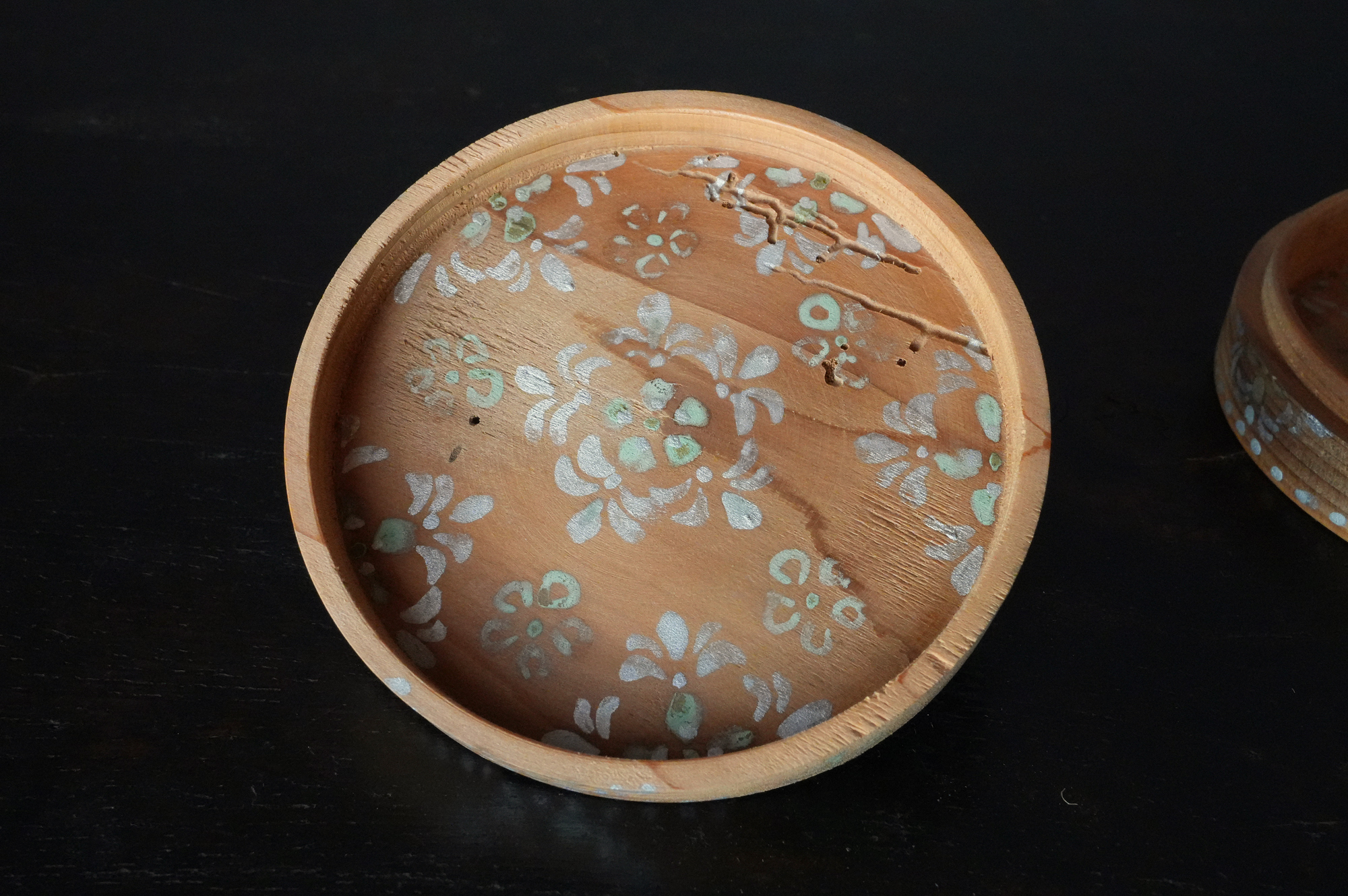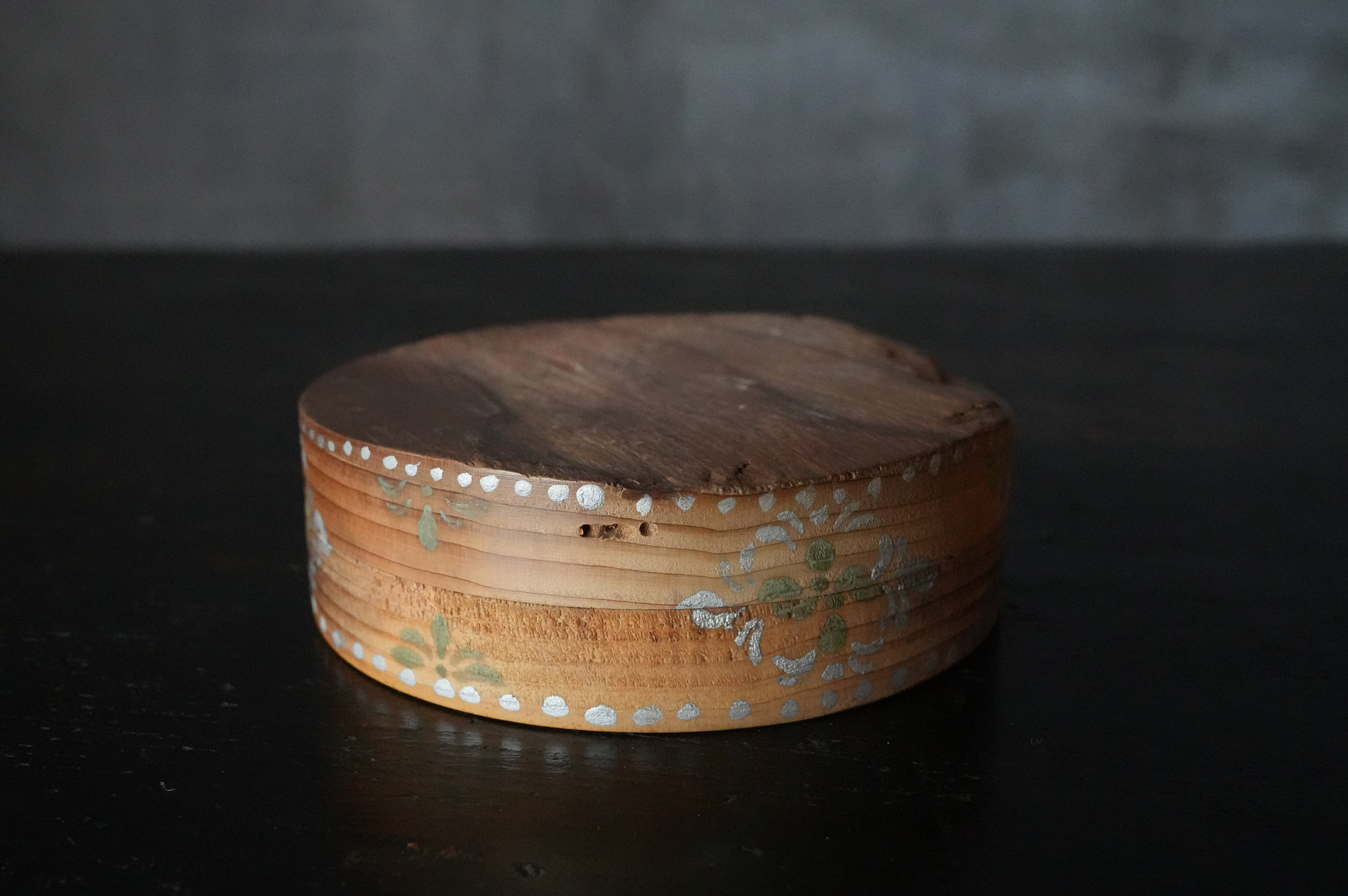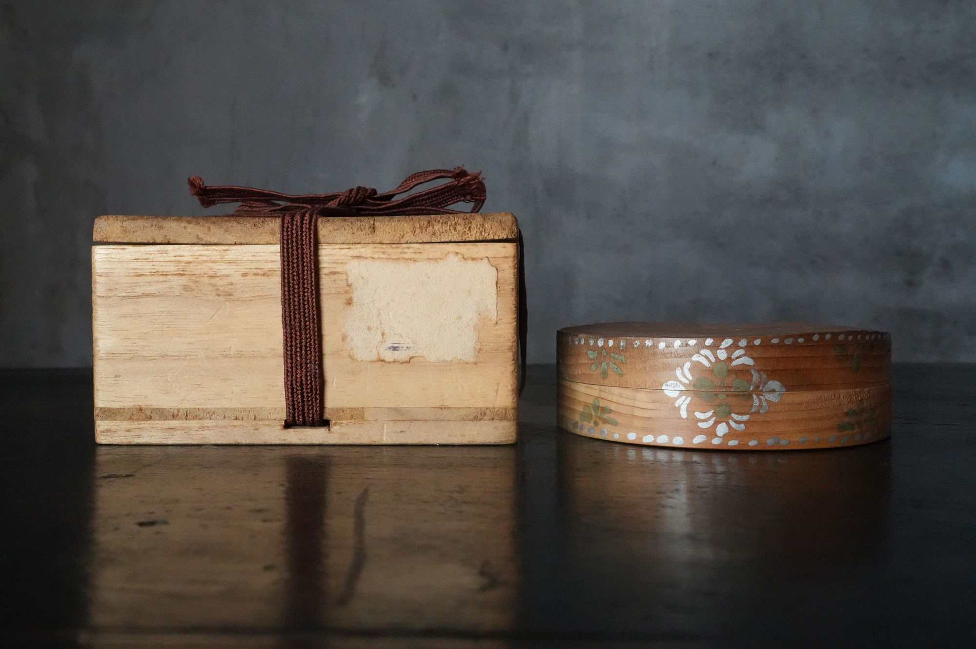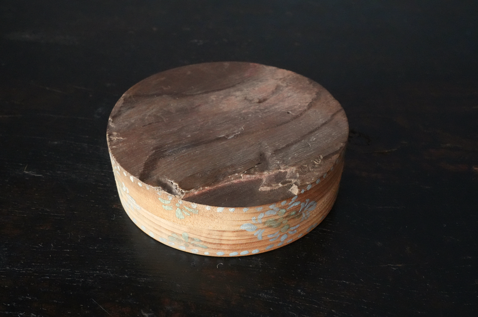 法隆寺古材で造られた香合は明治時代に活躍した奈良の漆芸家 大西勇斎作品法隆寺の古材を用いて作られた香合で、明治期に活躍した奈良の漆芸家・大西勇斎の作。古材製の香合は少なからず見られますが、本品は上面に古材そのものの枯れた風合いを生かしつつ、切断部の小口部分には天平時代を思わせる端正な文様を施しており、いかにも奈良物らしい気品と趣を備えています。香合としての使用はもちろん、小振りな金工品や金銅仏を据える台としても映え、取り合わせの楽しみを広げてくれるでしょう。状態は概ね良好で、明治工芸ならではの確かな仕事が感じられます。明治時代。供箱。