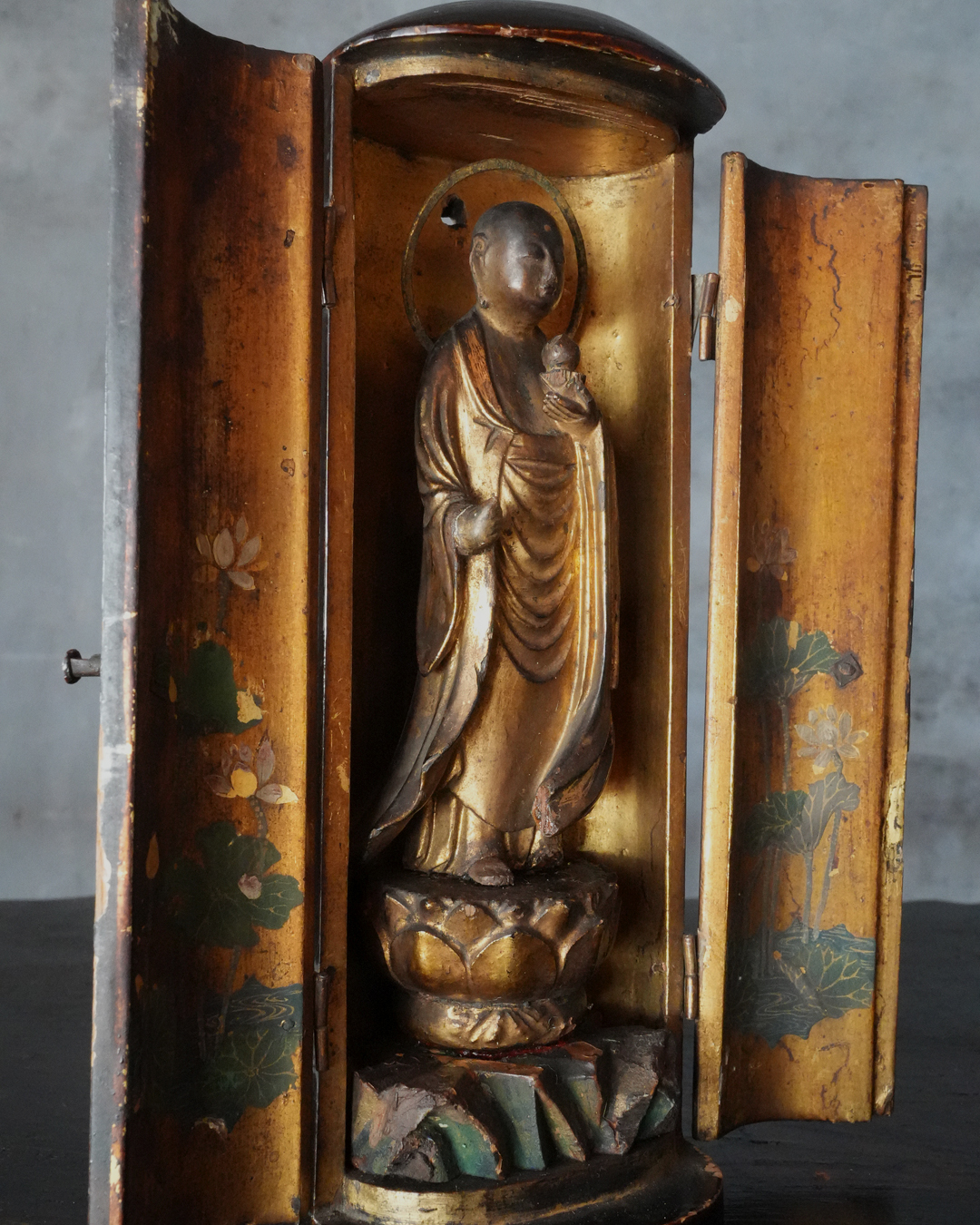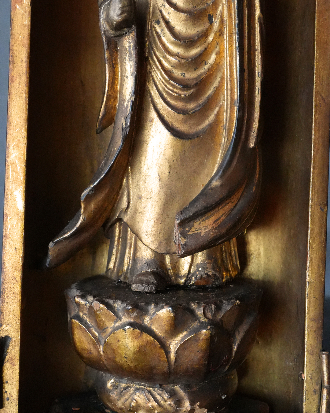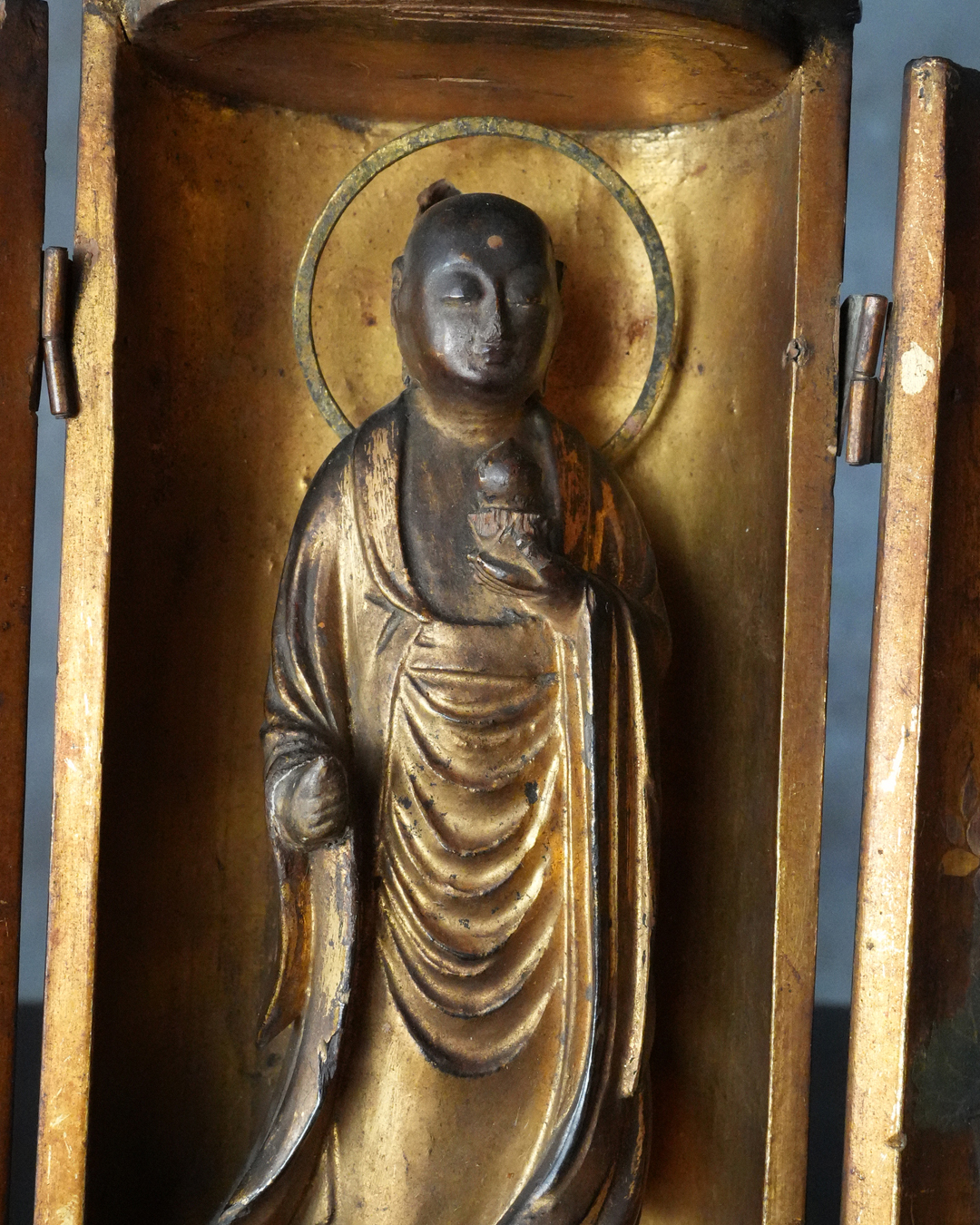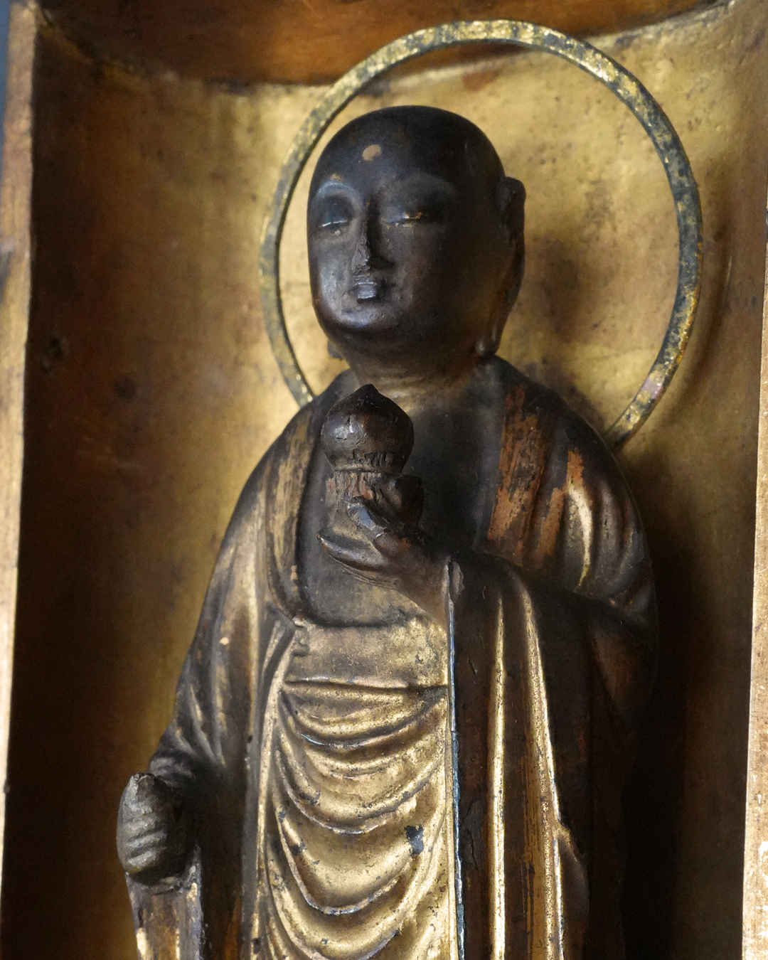 現状、全体的に経年による変化、錫杖、右足先、袖端部、額の白毫相に欠損が見られます。また、本来の袖先の広がりを想定すると、現在の厨子はやや小さく、厨子および台座ともに後世の補作である可能性が高いものと思われ、像と台座が一度分離した痕跡や、接着剤の使用が見受けられる点も、その状況を裏付けるものでしょう。彩色の塗り直しも施されたかもしれません。加えて、厨子の蝶番には緩みがございますので、あらかじめご承知おきください。