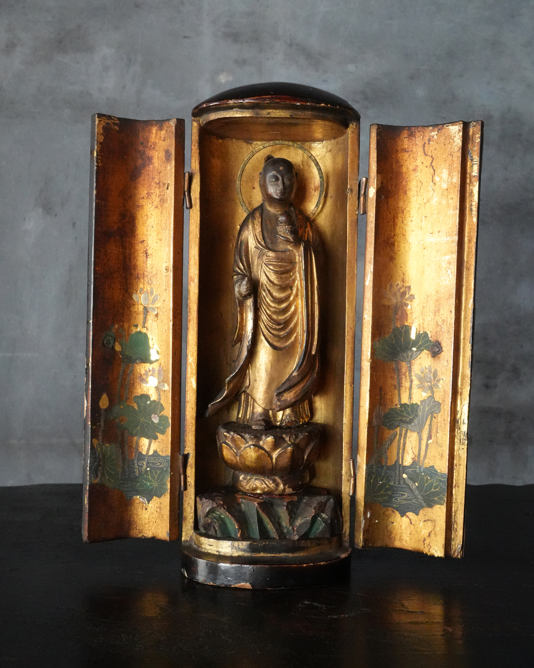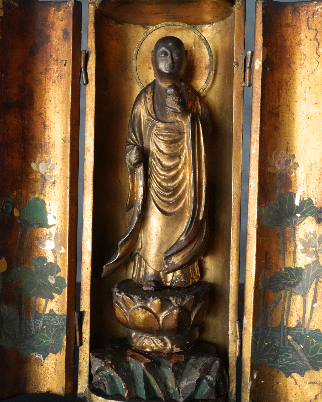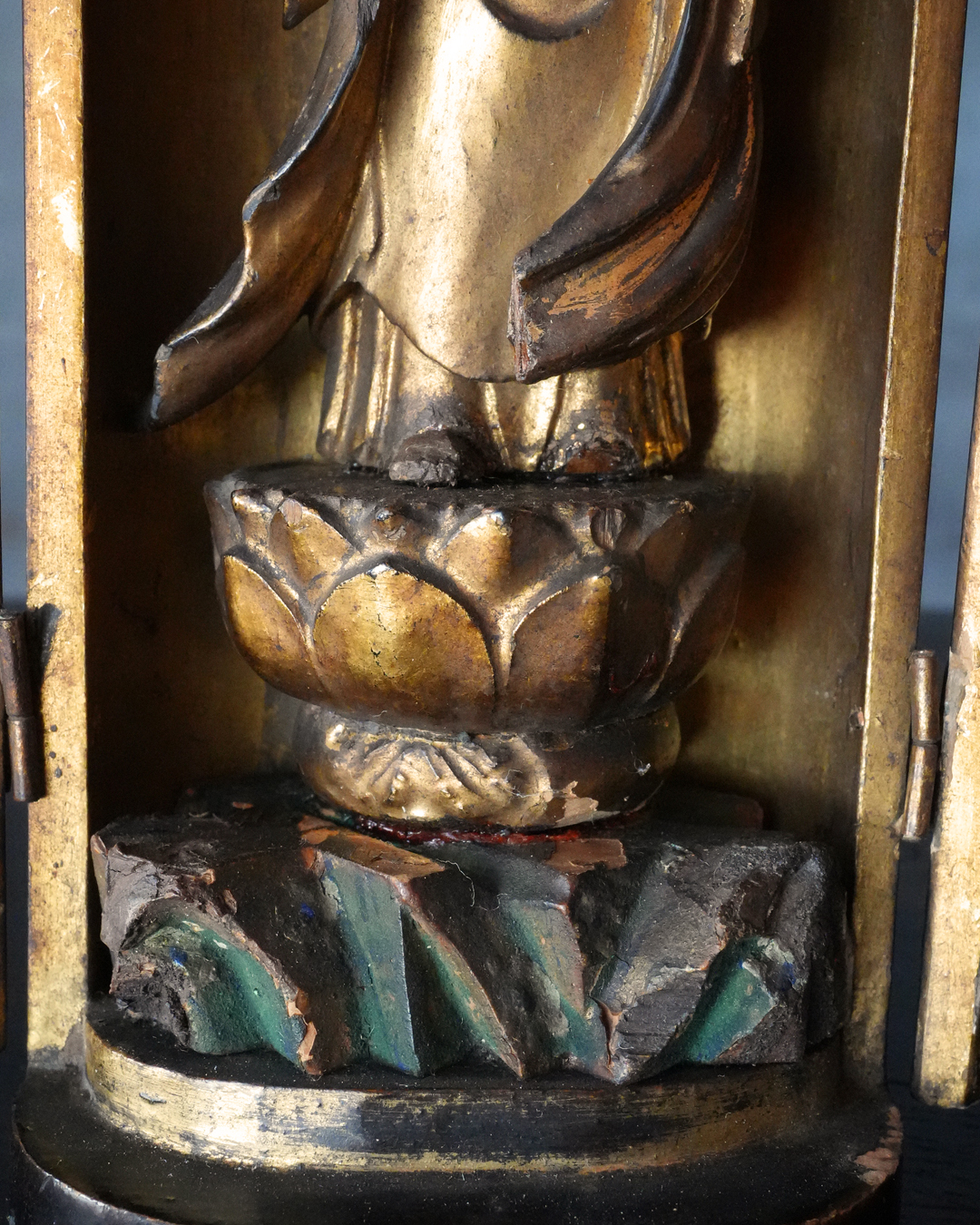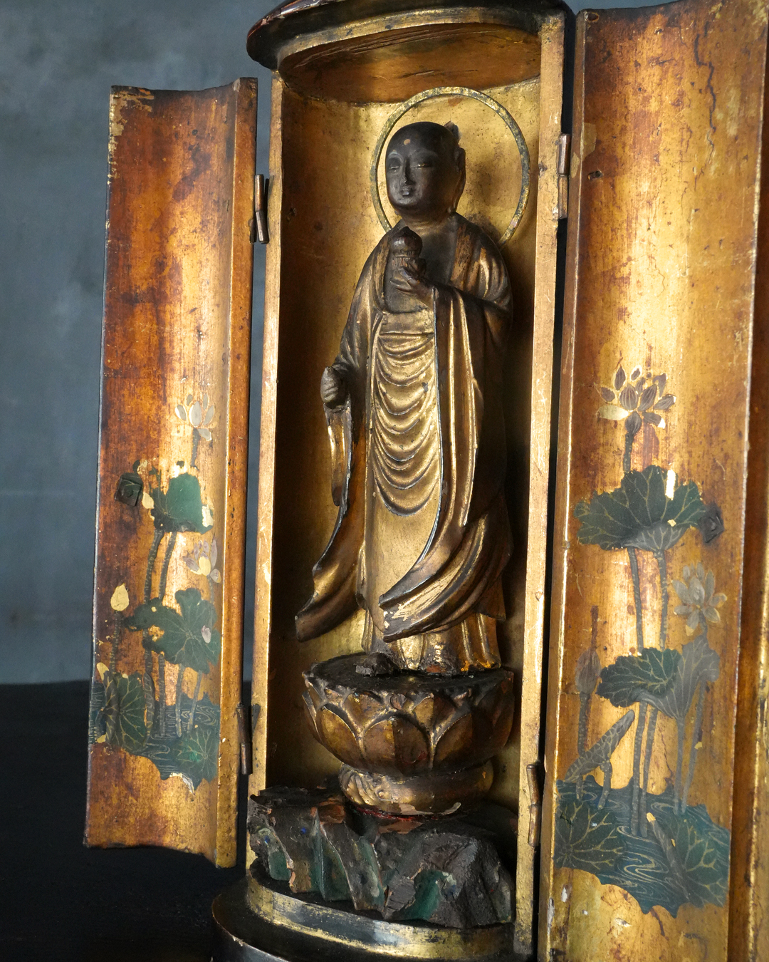 現状、全体的に経年による変化、錫杖、右足先、袖端部、額の白毫相に欠損が見られます。また、本来の袖先の広がりを想定すると、現在の厨子はやや小さく、厨子および台座ともに後世の補作である可能性が高いものと思われ、像と台座が一度分離した痕跡や、接着剤の使用が見受けられる点も、その状況を裏付けるものでしょう。彩色の塗り直しも施されたかもしれません。加えて、厨子の蝶番には緩みがございますので、あらかじめご承知おきください。