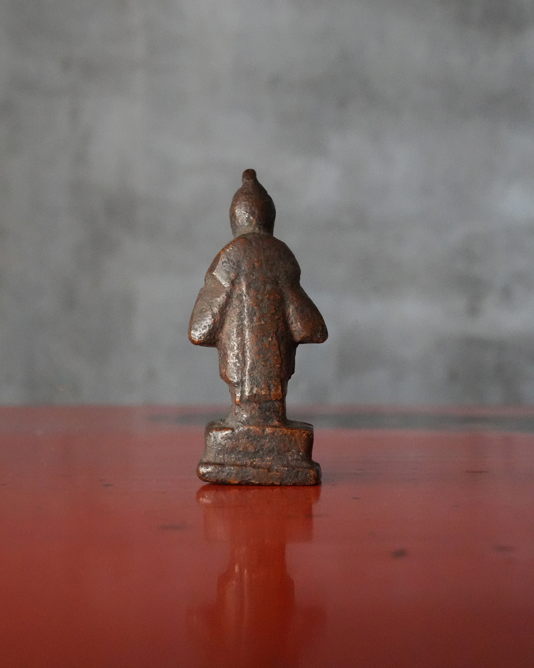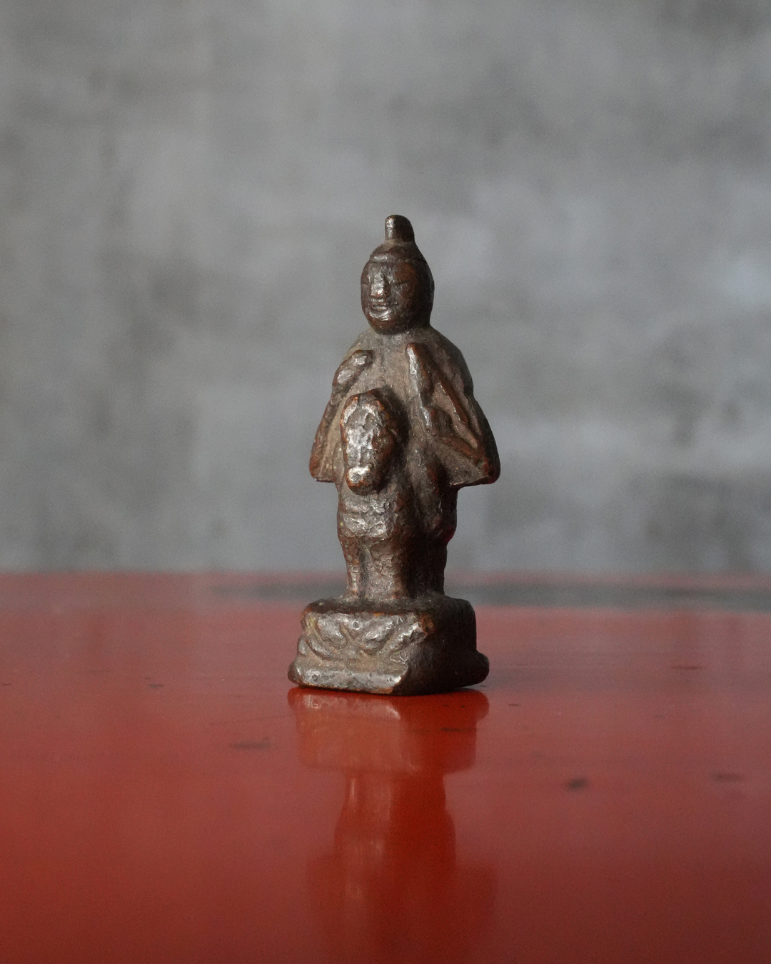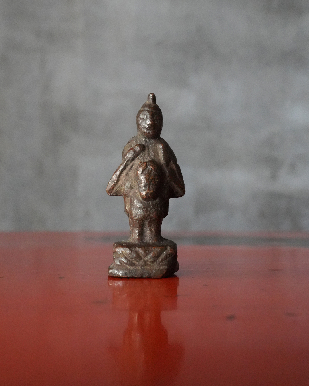 小ぶりな古銅の念持仏で、この種の像は、戦の折に兜の内に納めたとも伝えられ、「鎧仏」とも称されます。常に身近に置き、戦勝と無事を祈ったのでしょう。掌に収まるほどの小像ながら、馬上の姿は的確に表現され、凛とした存在感があります。桃山〜江戸時代。