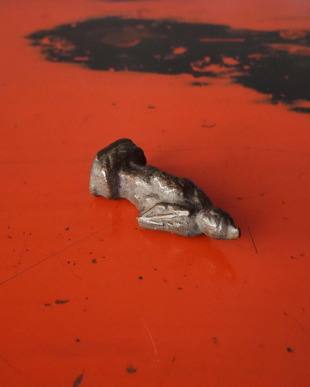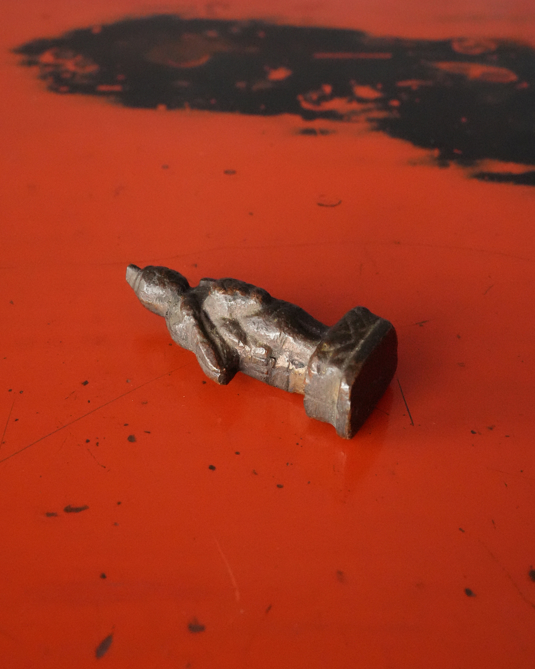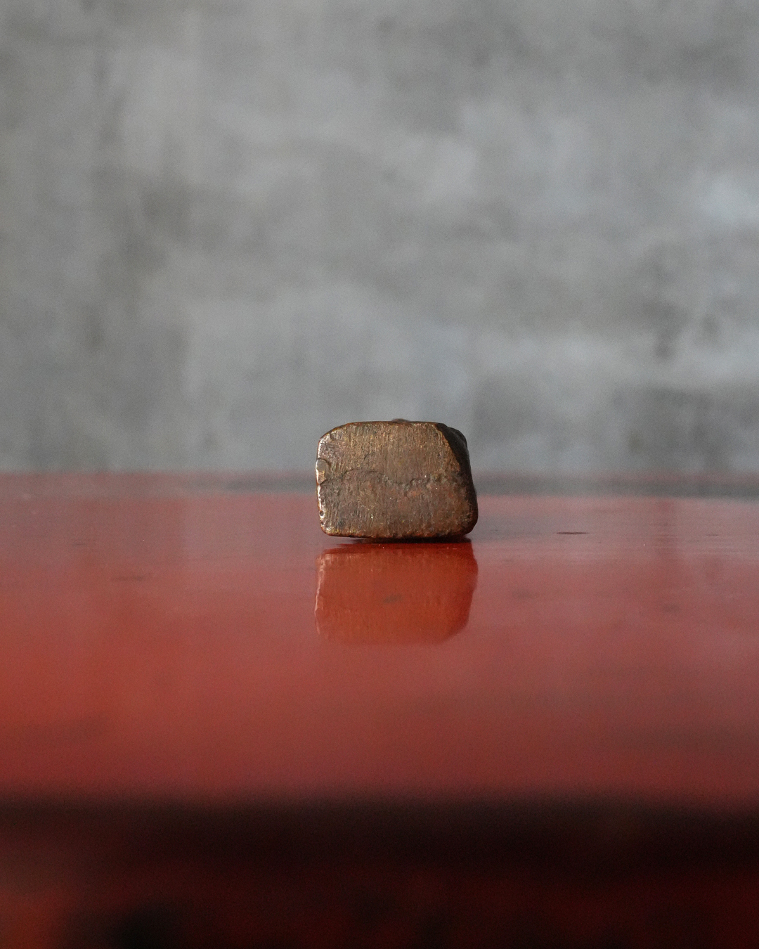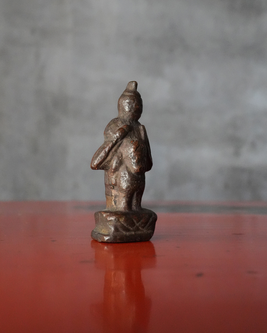 小ぶりな古銅の念持仏で、この種の像は、戦の折に兜の内に納めたとも伝えられ、「鎧仏」とも称されます。常に身近に置き、戦勝と無事を祈ったのでしょう。掌に収まるほどの小像ながら、馬上の姿は的確に表現され、凛とした存在感があります。桃山〜江戸時代。