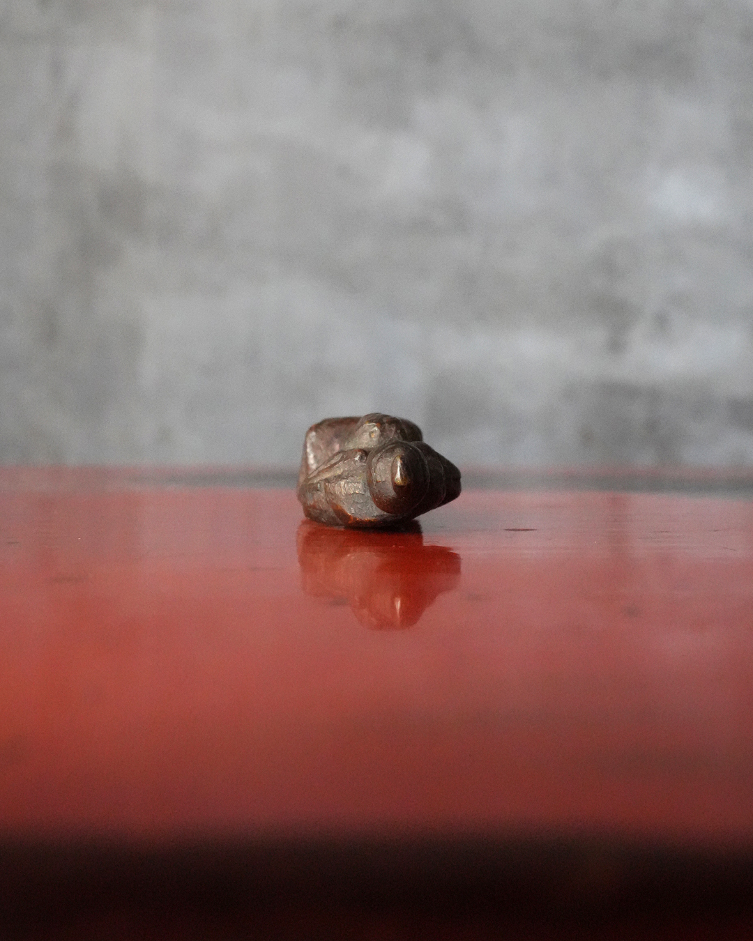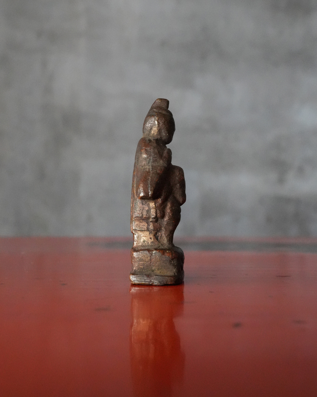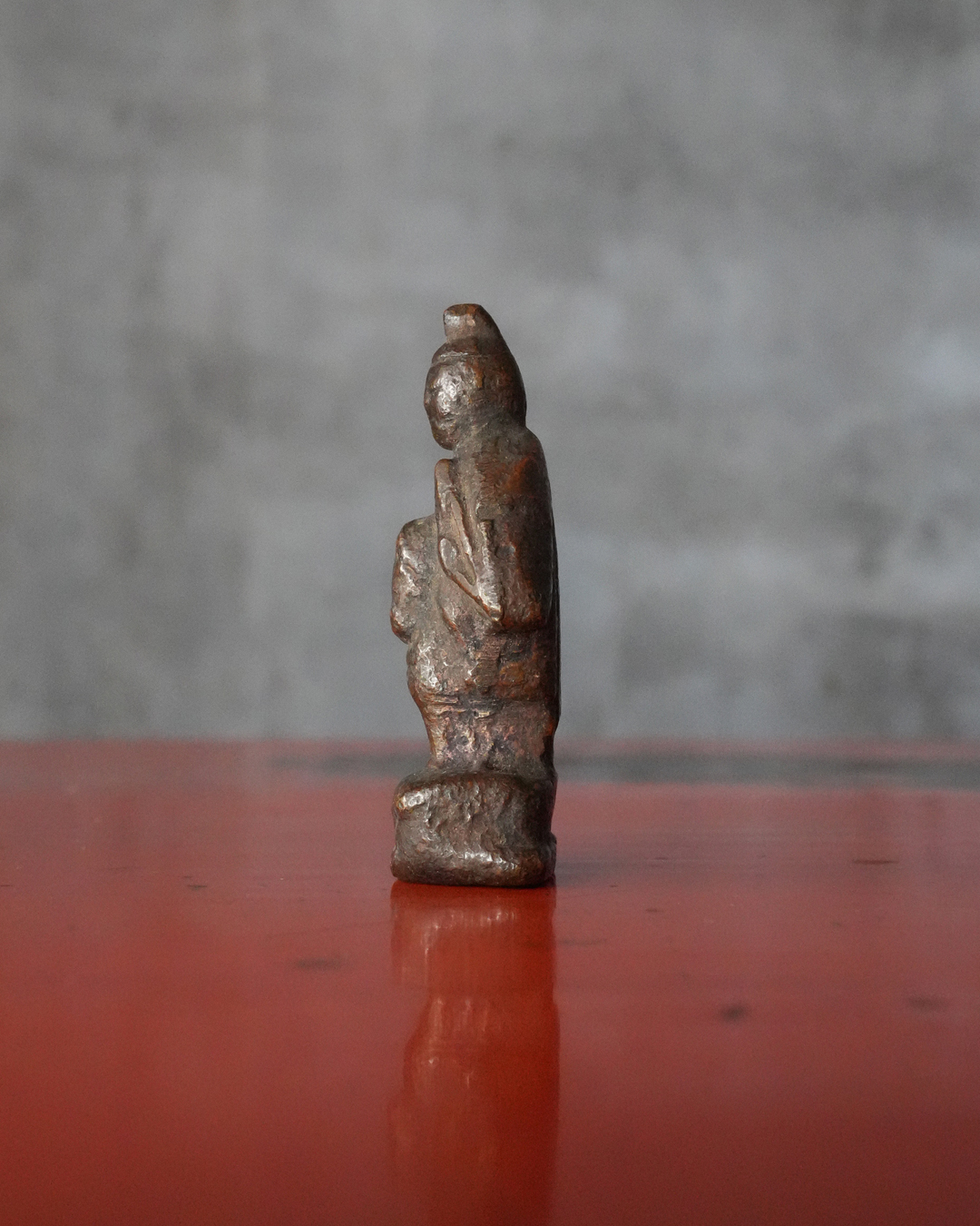 甲冑を纏った姿の勝軍地蔵が一般的ですが、本作は束帯姿で馬に跨る珍しい像容。武装した姿より、どこか神像に近い気配を感じさせる佇まいです。勝軍地蔵は愛宕権現の本地仏とされ、鎧を着て馬に乗る姿から、古くは武将たちの篤い信仰を集めました。本作もその系譜に連なるものでしょう。