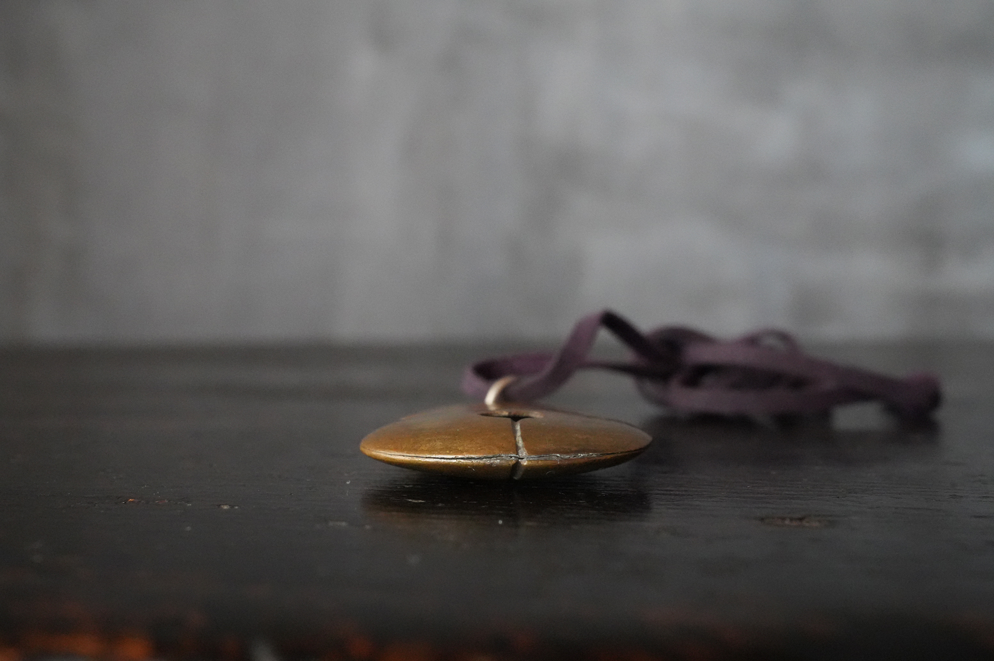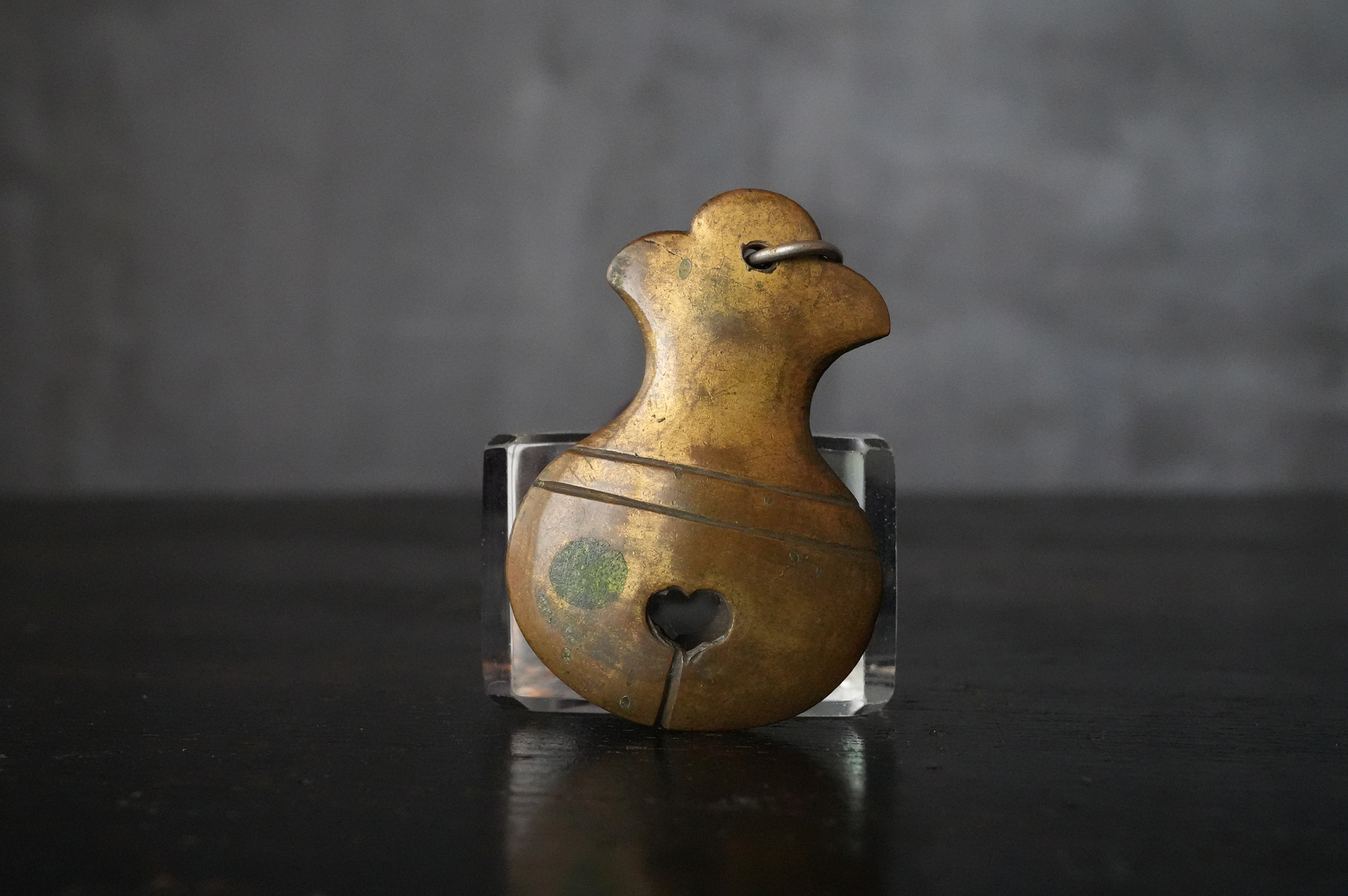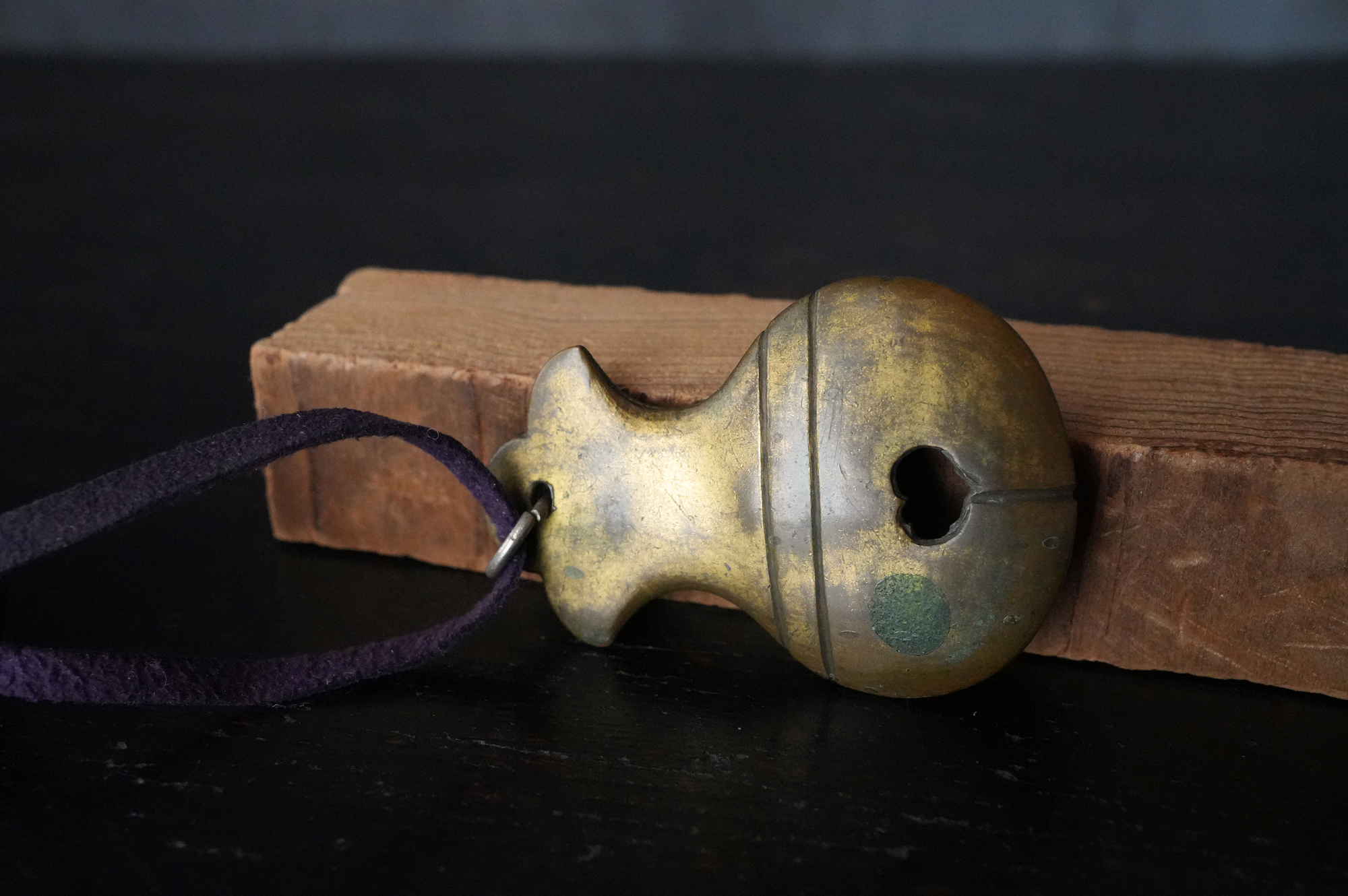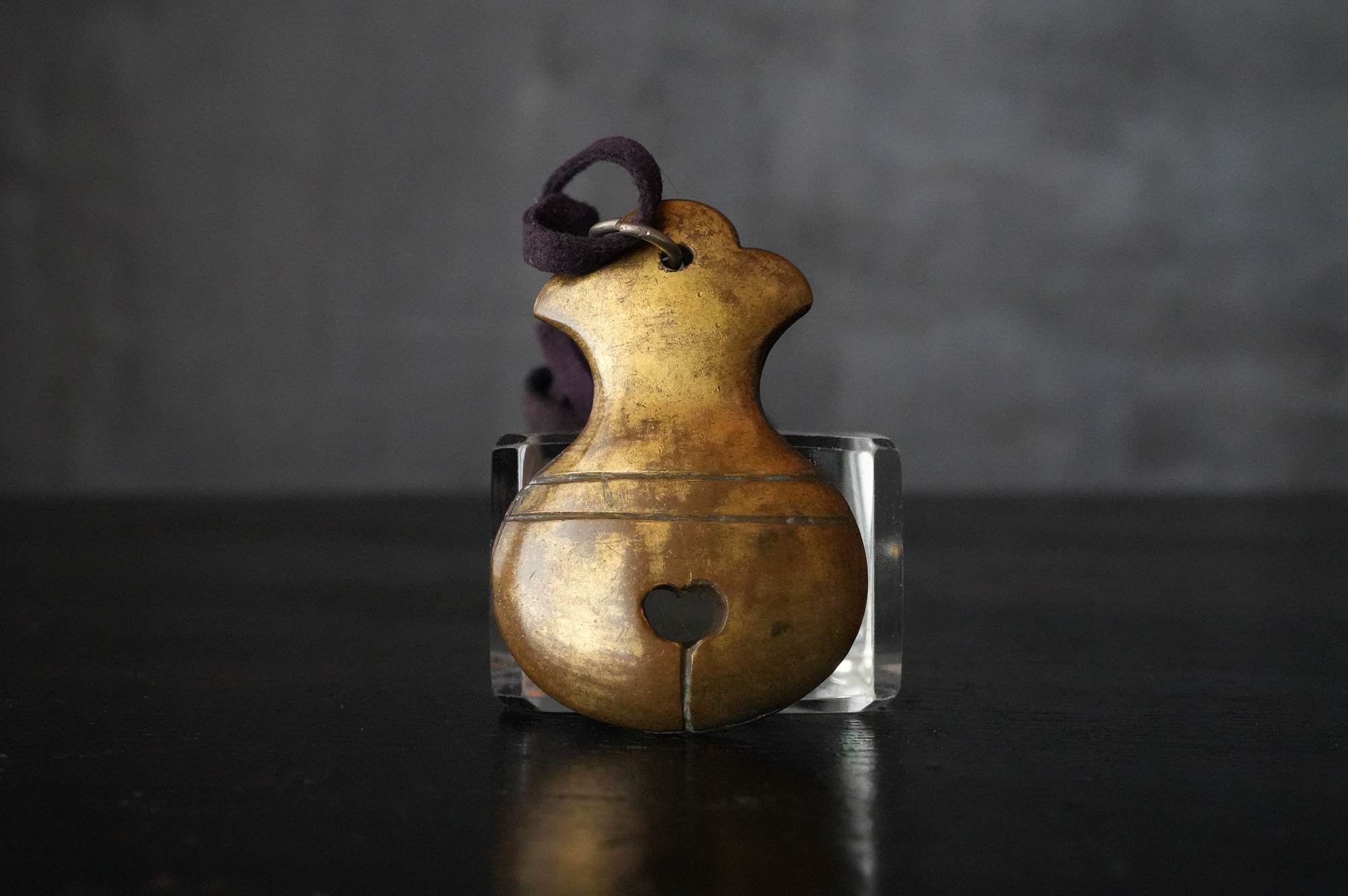 時代は室町頃と推測されます。内部の鈴子は失われており、現在は音を発しません。掌中で愛でるにふさわしい、古雅で愛らしい鈴です。*紐は前所有者がつけたものです。