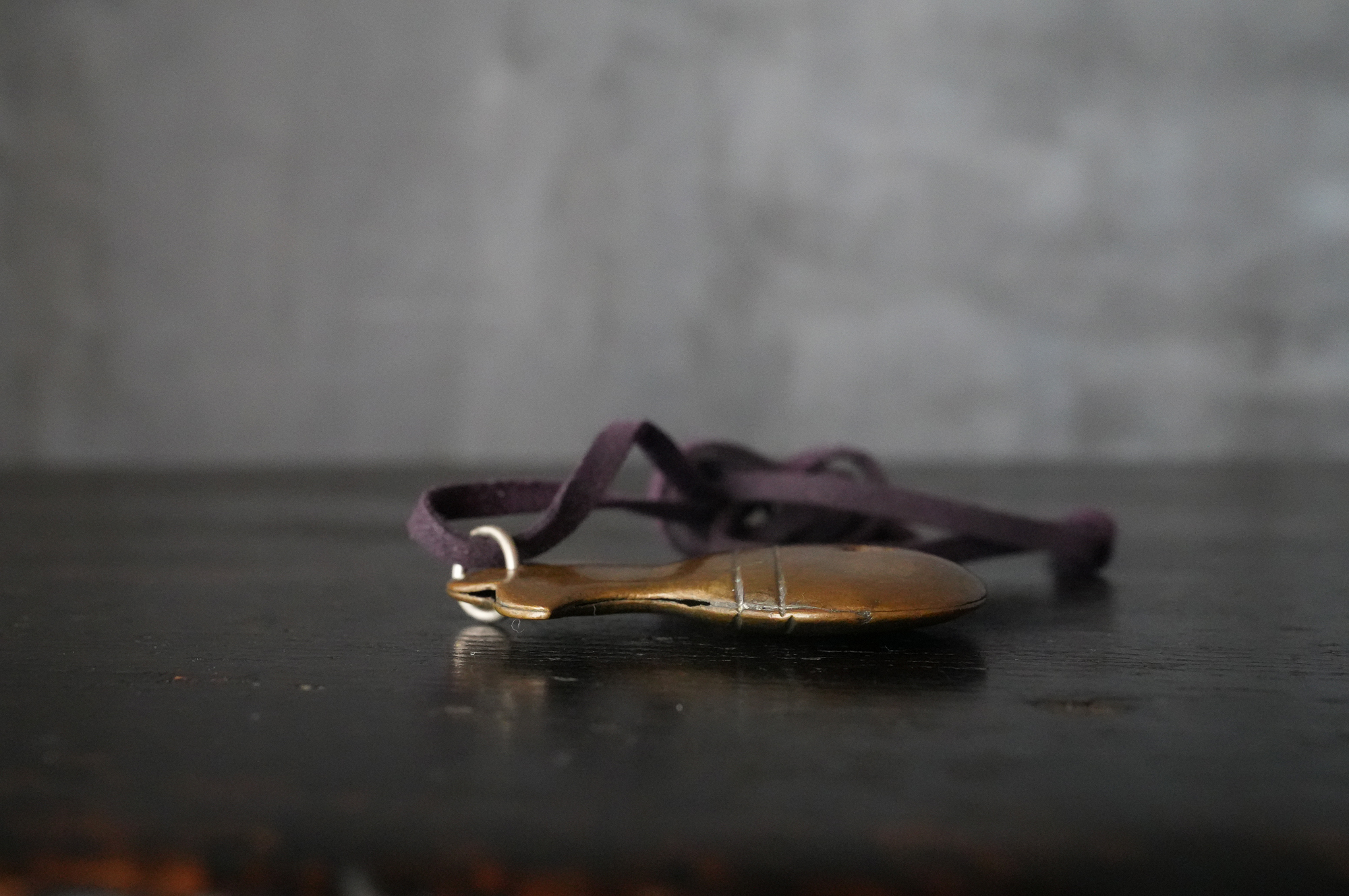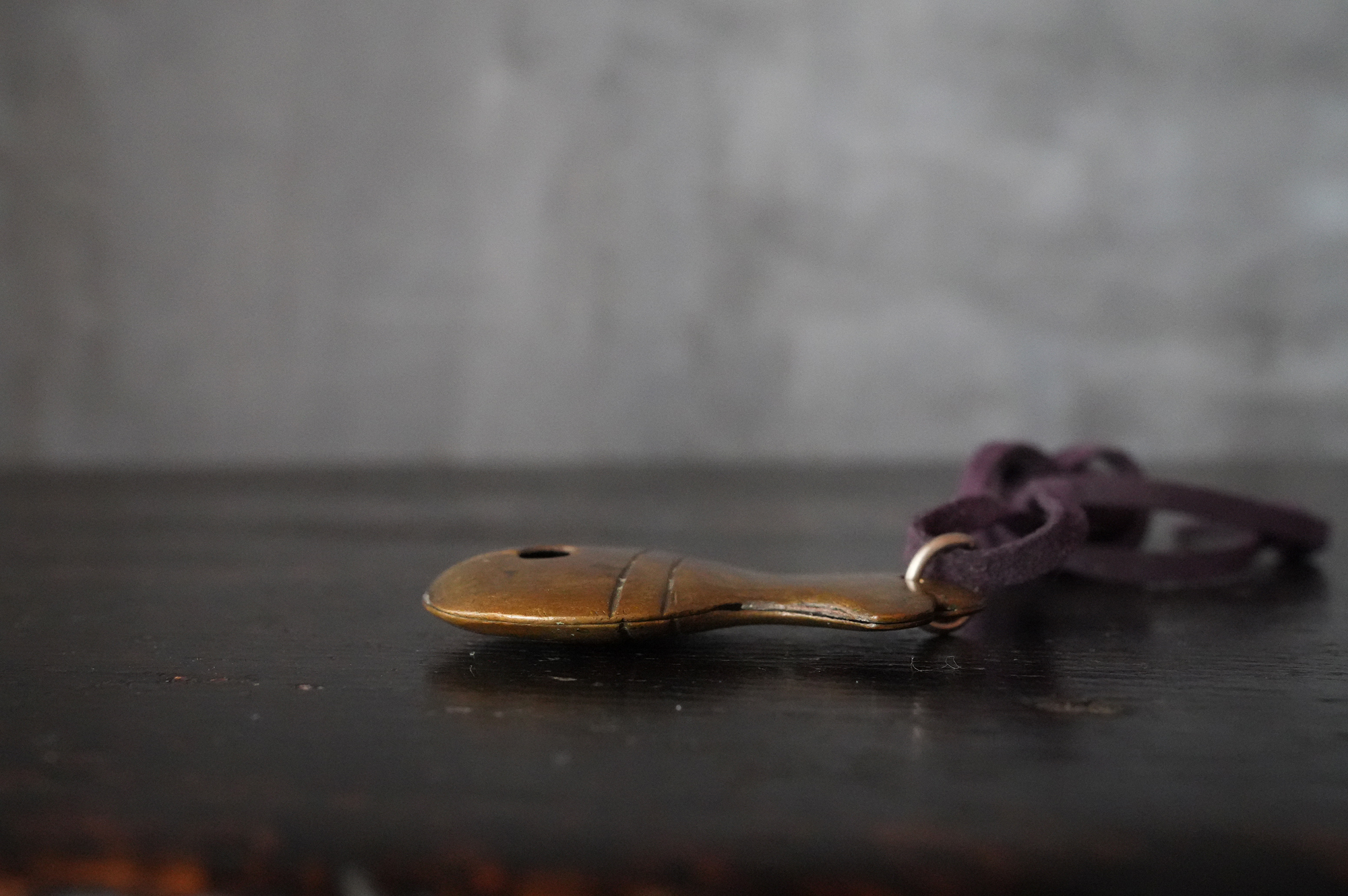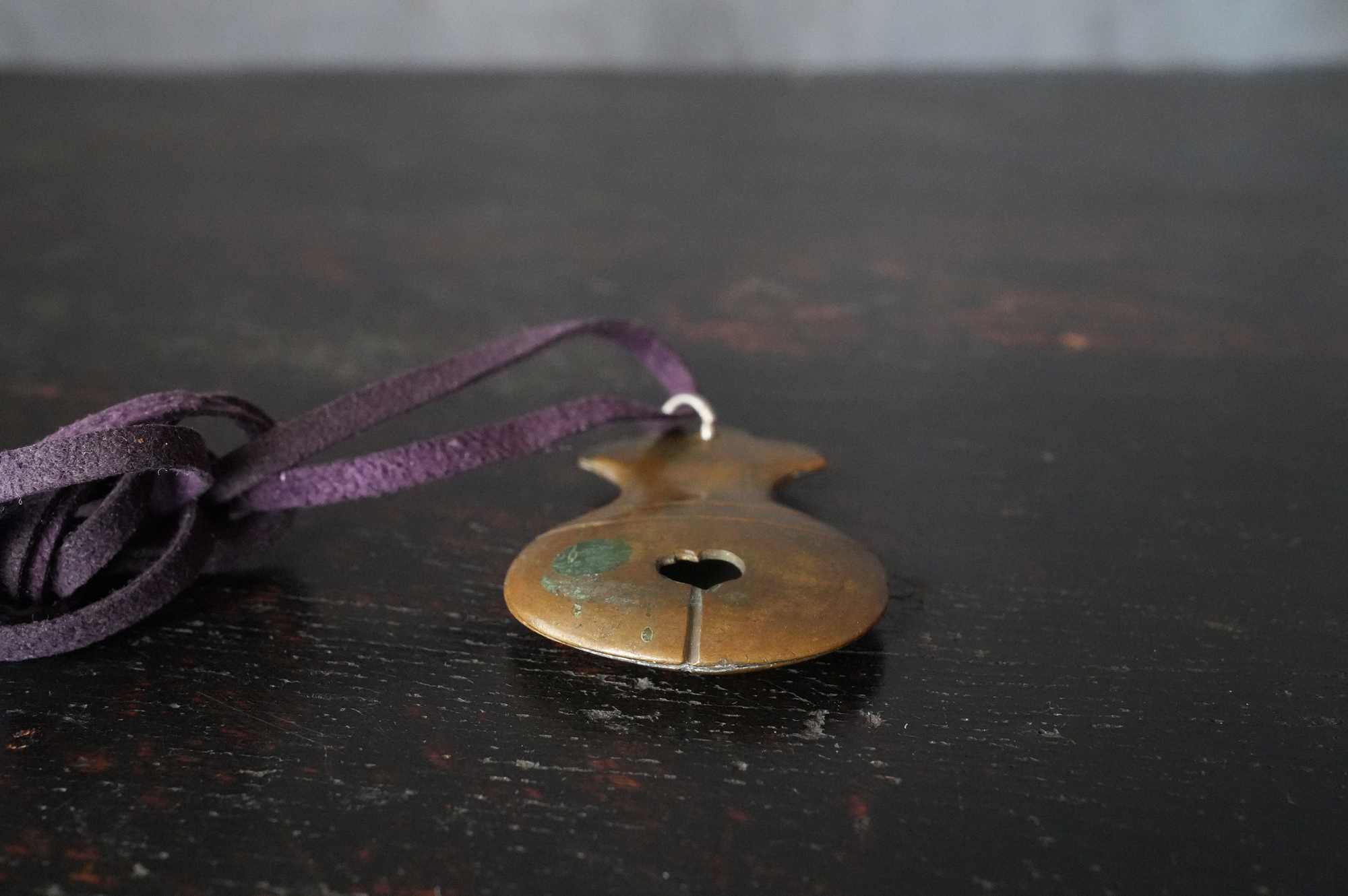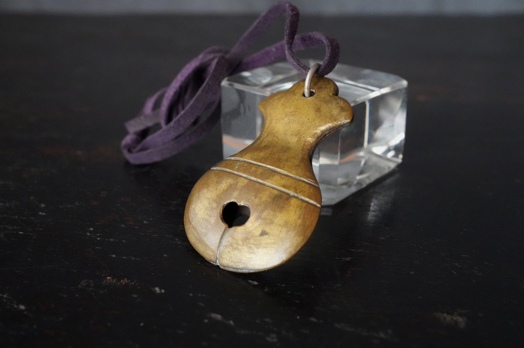 時代は室町頃と推測されます。内部の鈴子は失われており、現在は音を発しません。掌中で愛でるにふさわしい、古雅で愛らしい鈴です。*紐は前所有者がつけたものです。