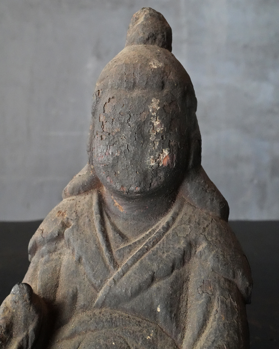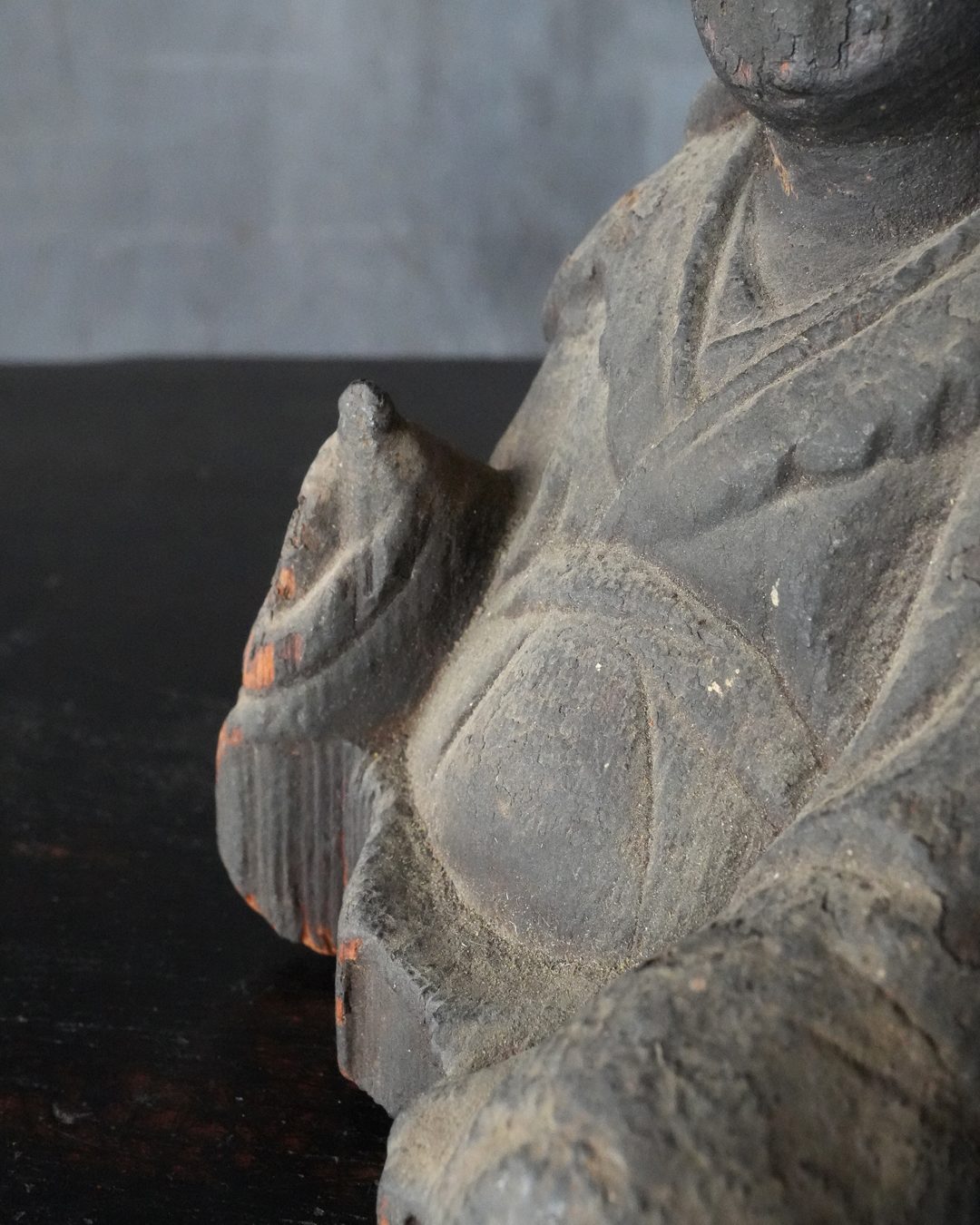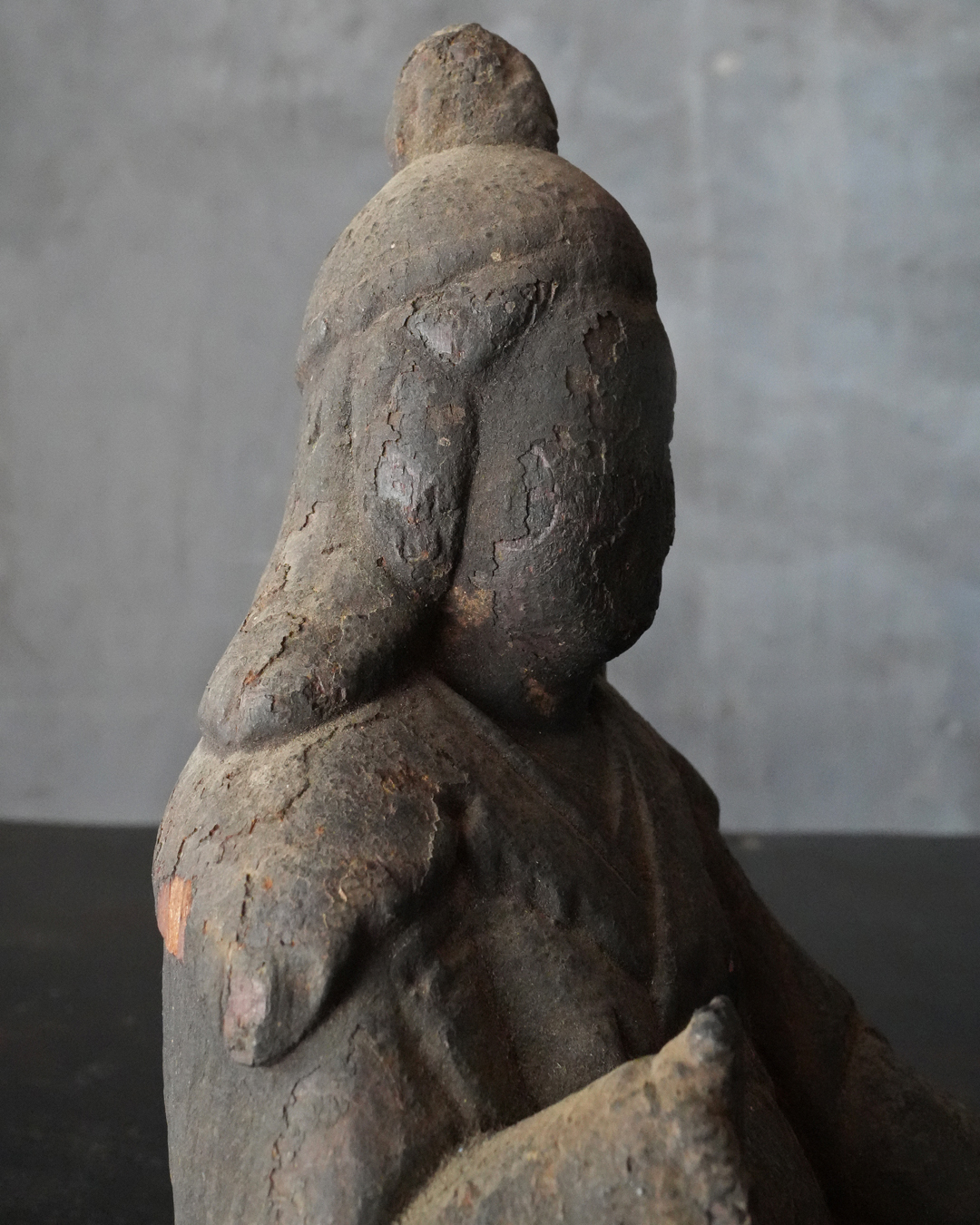 厚い煤に覆われ、一見すると民間信仰の仏のようにも映りますが、量感豊かな体躯、どこか古格を感じさせる佇まいには確かな品位が備わっています。手取りも軽く、木質や彫り口から見ても、時代はさらに遡る印象を受けます。室町時代は下らない作と推察します。底部に虫食い、部分的な破損はございますが、長い歳月を経た自然な景色となっており、作為のない時代の味わいです。
