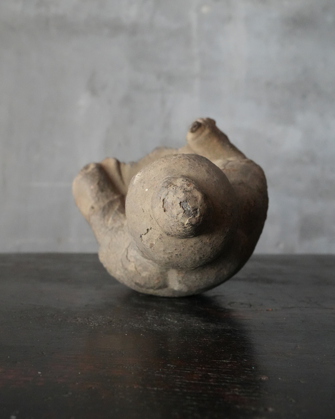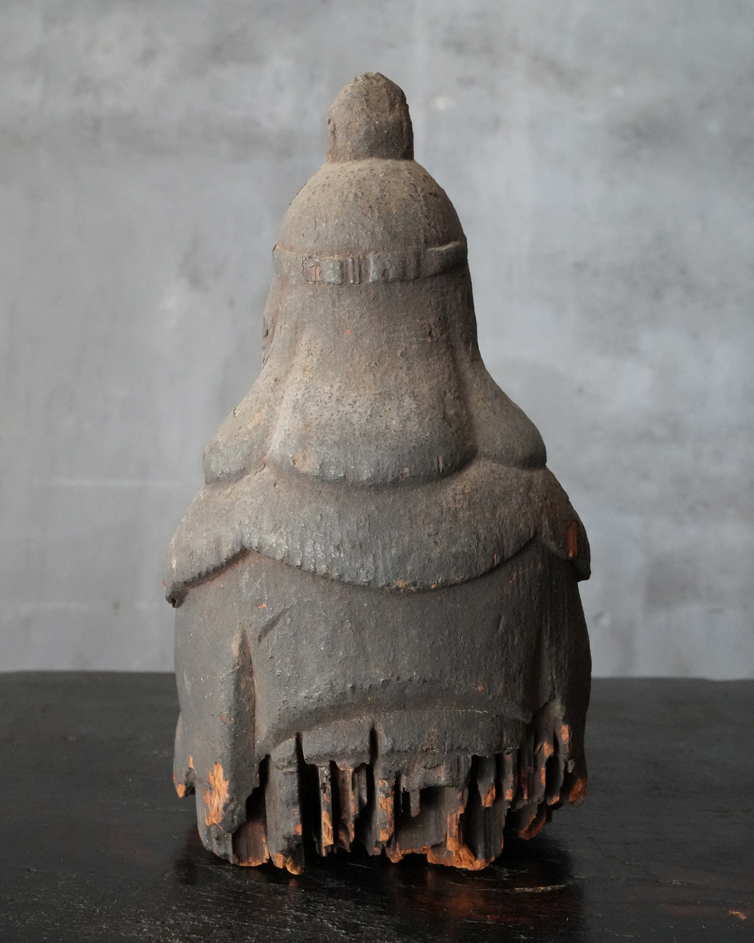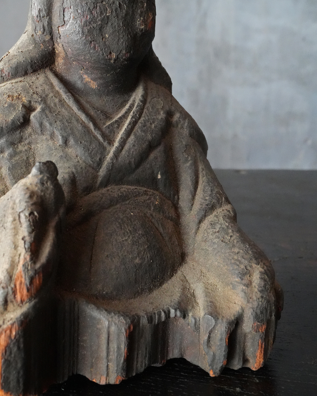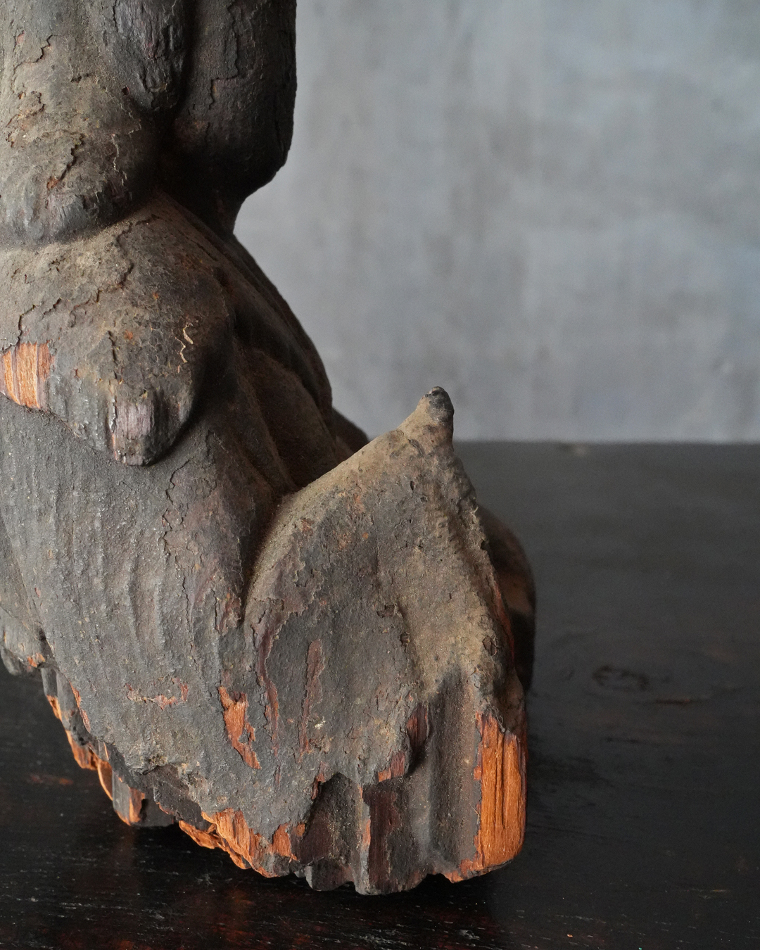 厚い煤に覆われ、一見すると民間信仰の仏のようにも映りますが、量感豊かな体躯、どこか古格を感じさせる佇まいには確かな品位が備わっています。手取りも軽く、木質や彫り口から見ても、時代はさらに遡る印象を受けます。室町時代は下らない作と推察します。底部に虫食い、部分的な破損はございますが、長い歳月を経た自然な景色となっており、作為のない時代の味わいです。