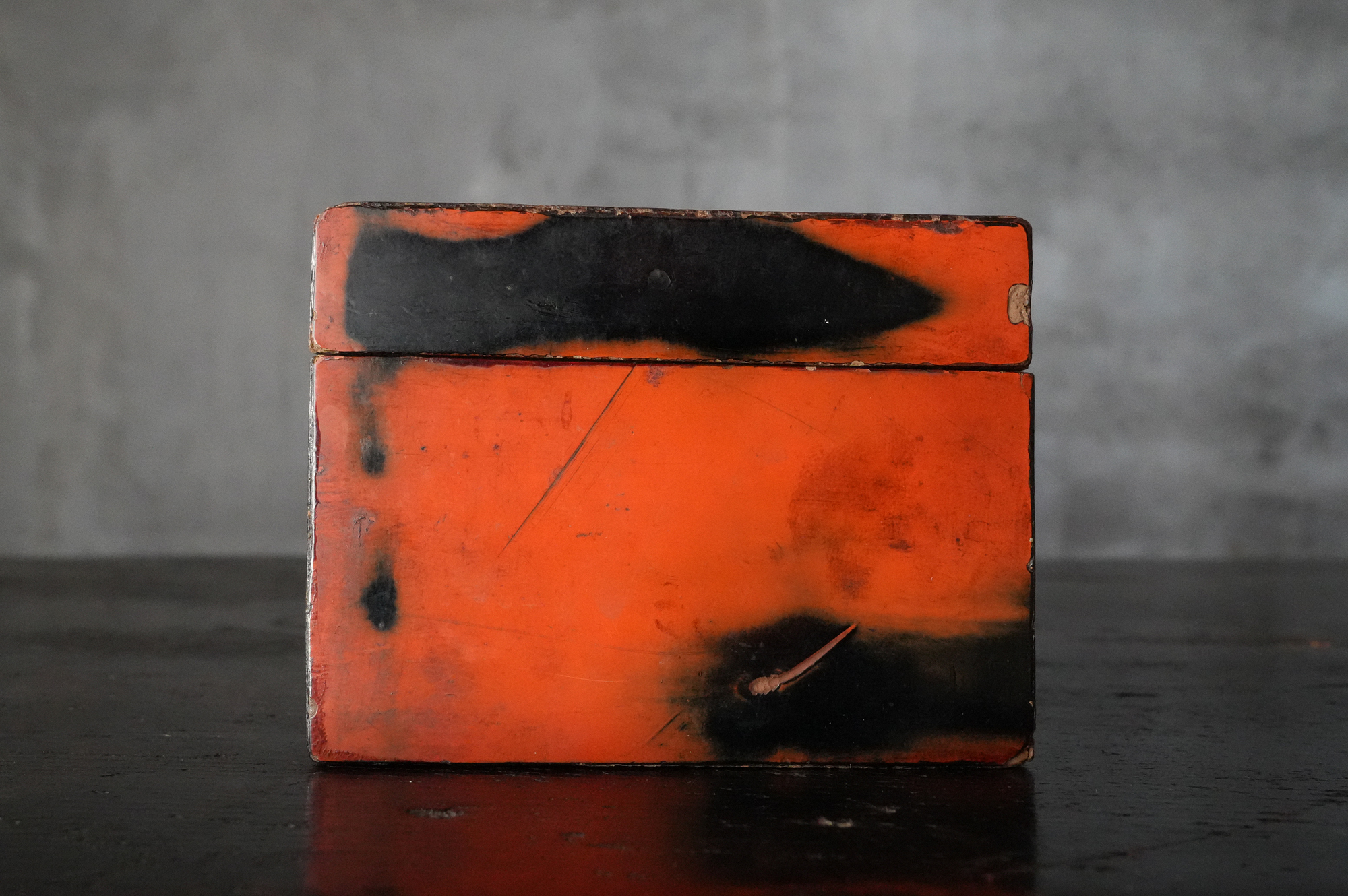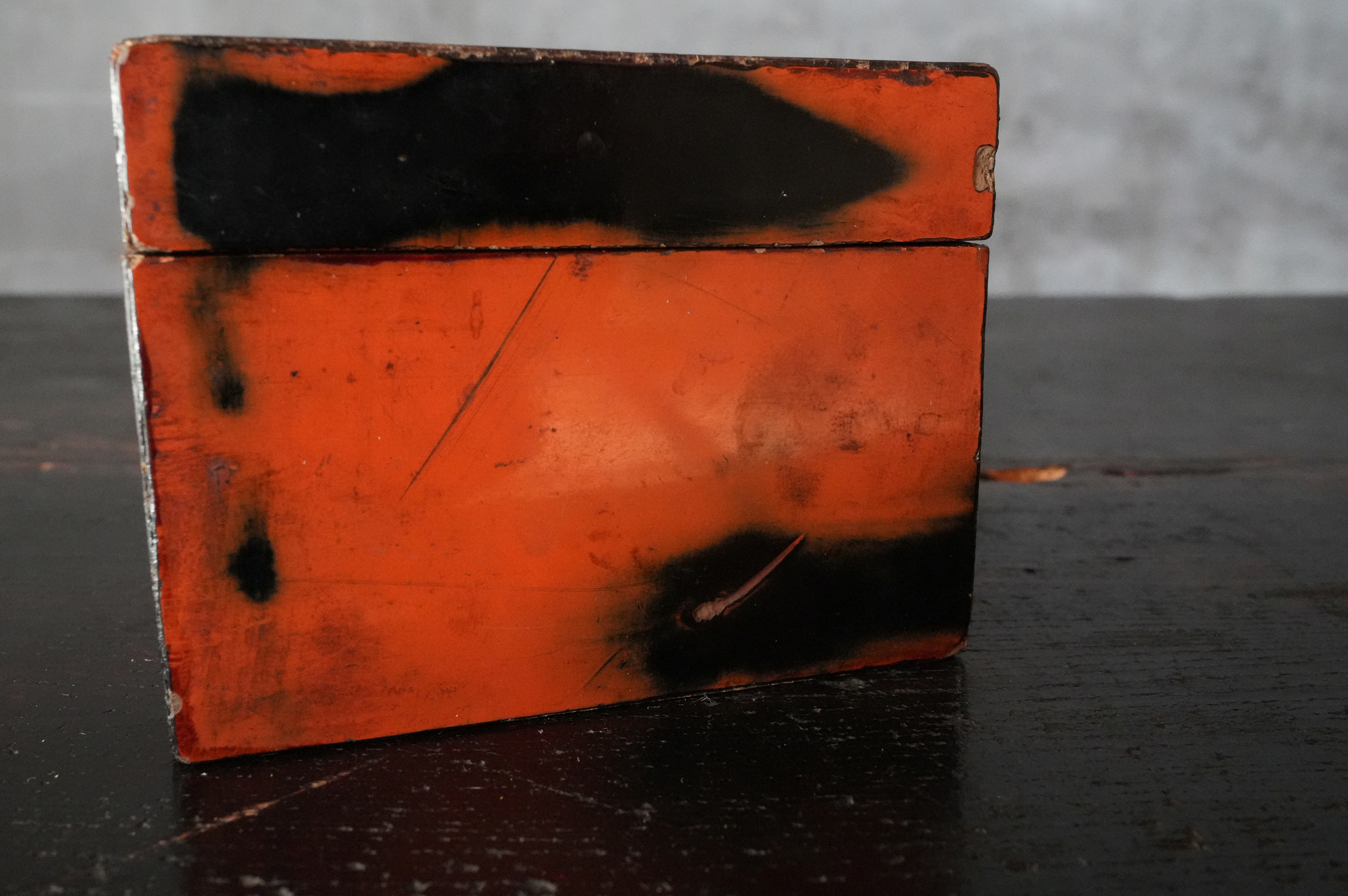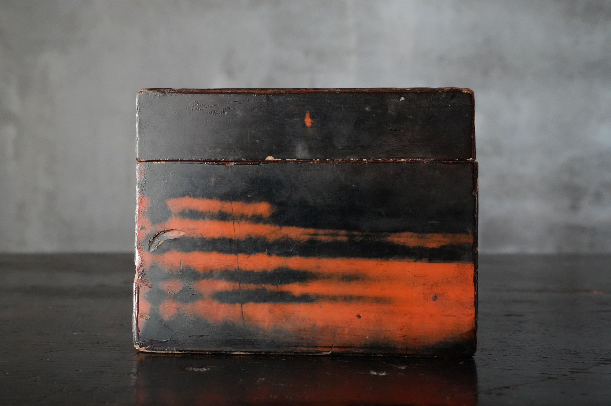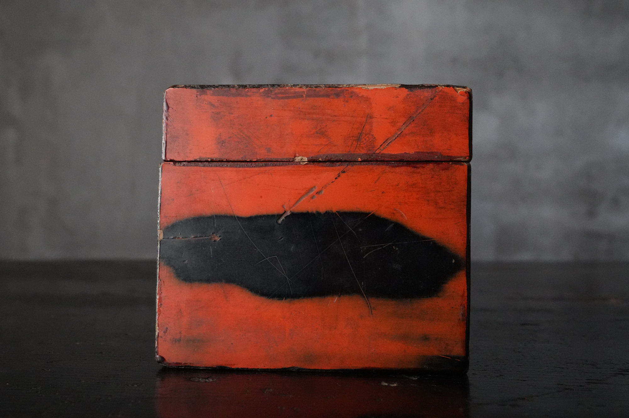 赤と黒のコントラストが印象的な根来の箱。おそらく識者が、根来の折敷などの古材を用い、自身の美意識に沿って新たに誂えたものではないでしょうか。指物の仕事も丁寧で、技術の高い職人の手によるものと思われます。