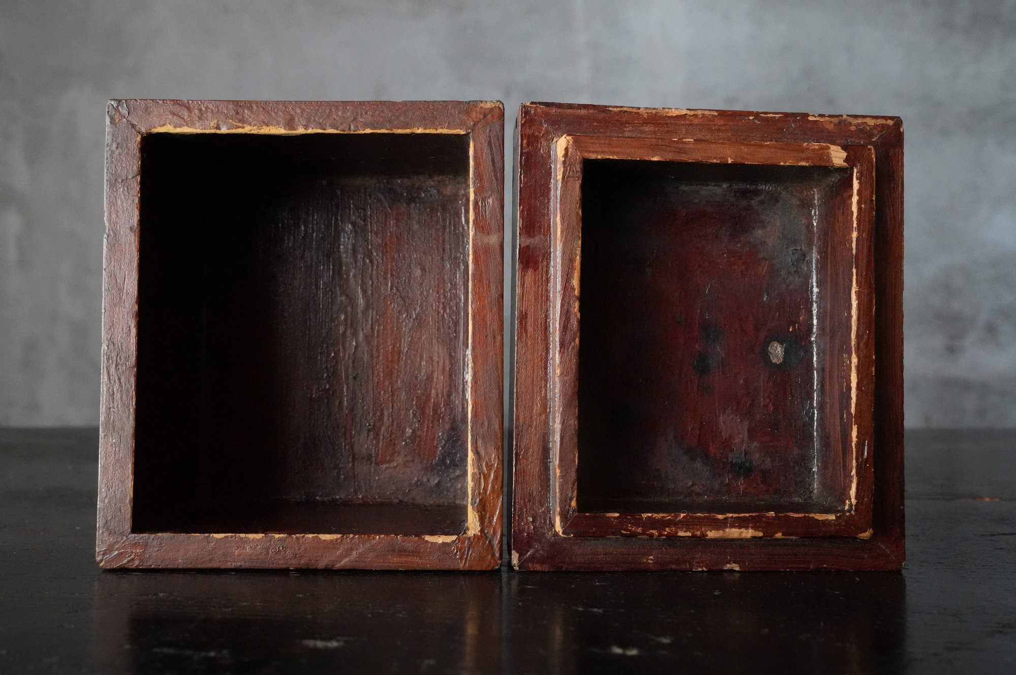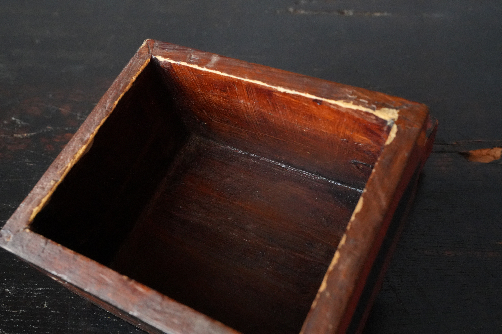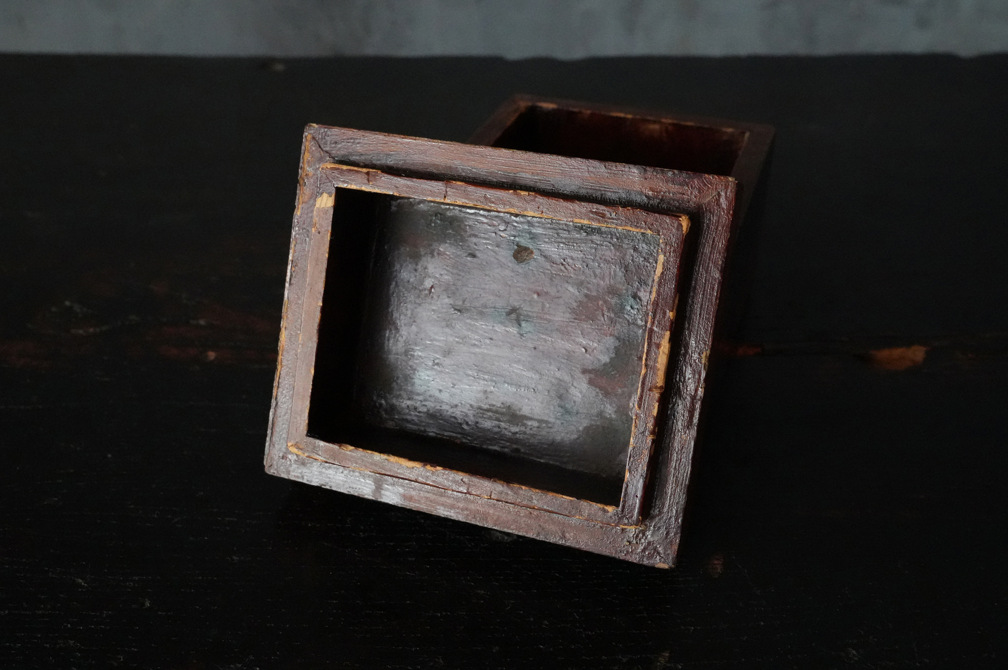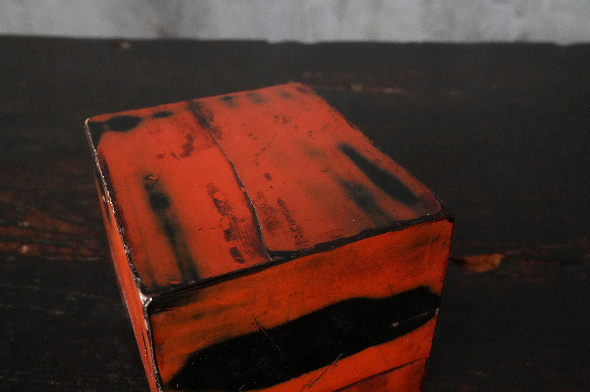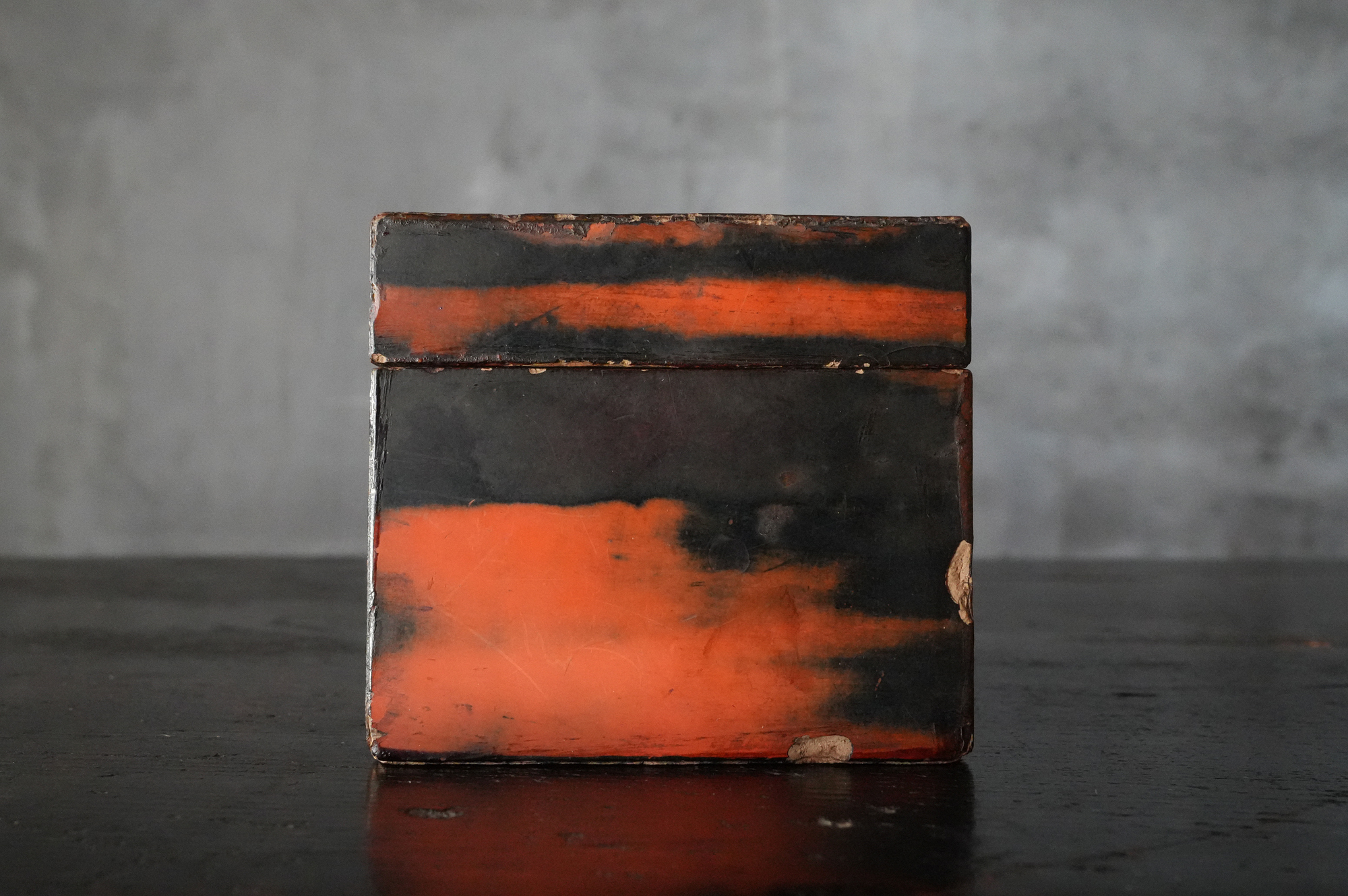 赤と黒のコントラストが印象的な根来の箱。おそらく識者が、根来の折敷などの古材を用い、自身の美意識に沿って新たに誂えたものではないでしょうか。指物の仕事も丁寧で、技術の高い職人の手によるものと思われます。
