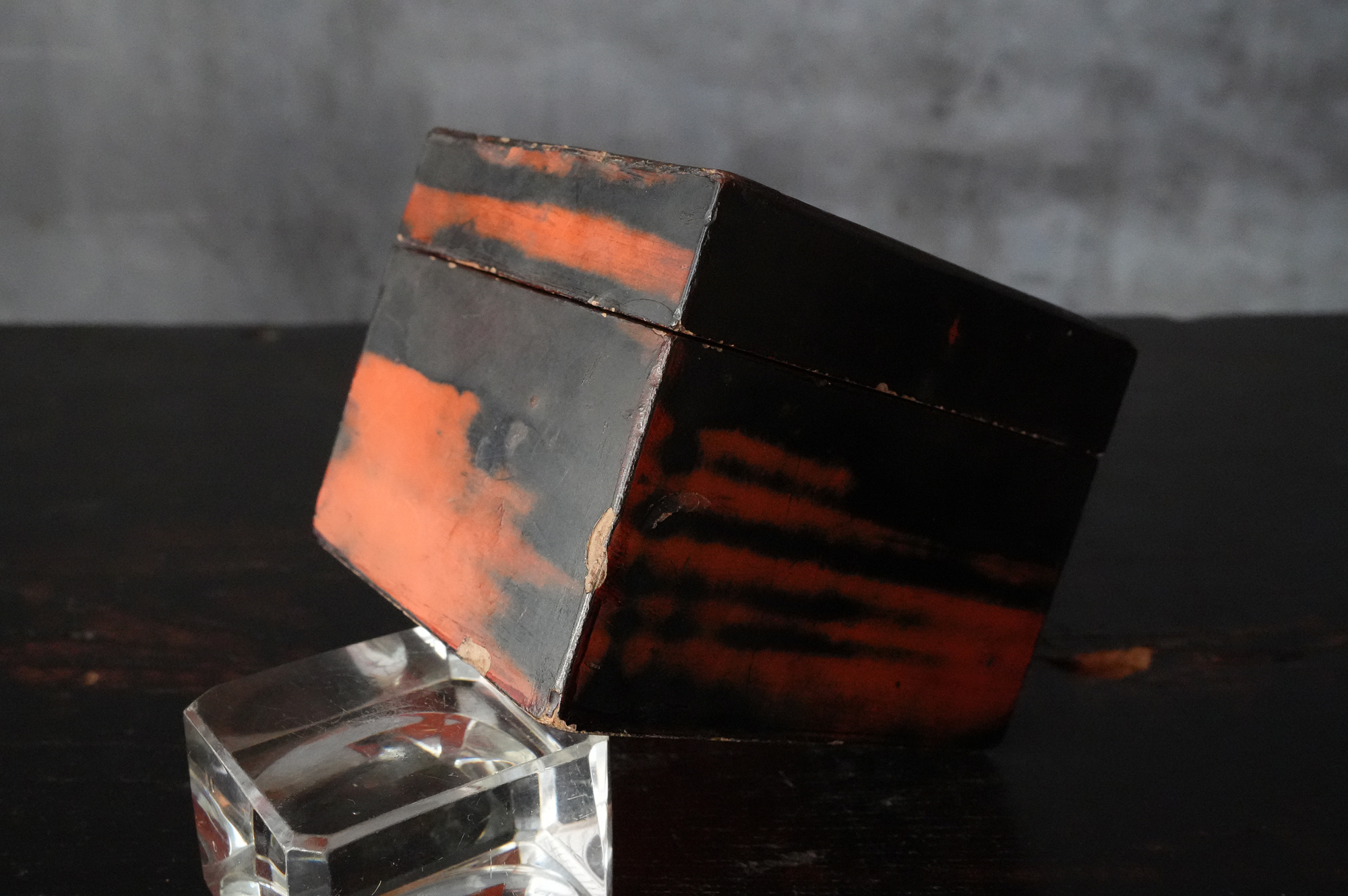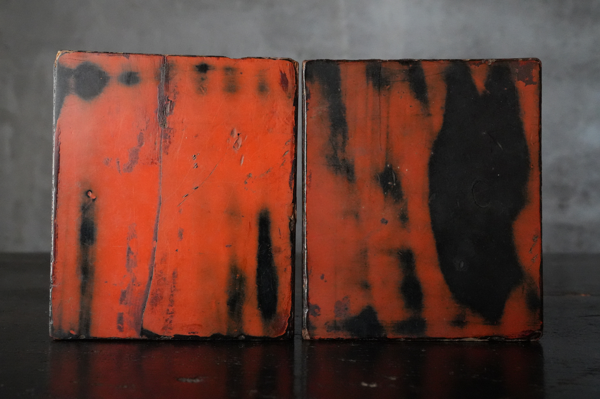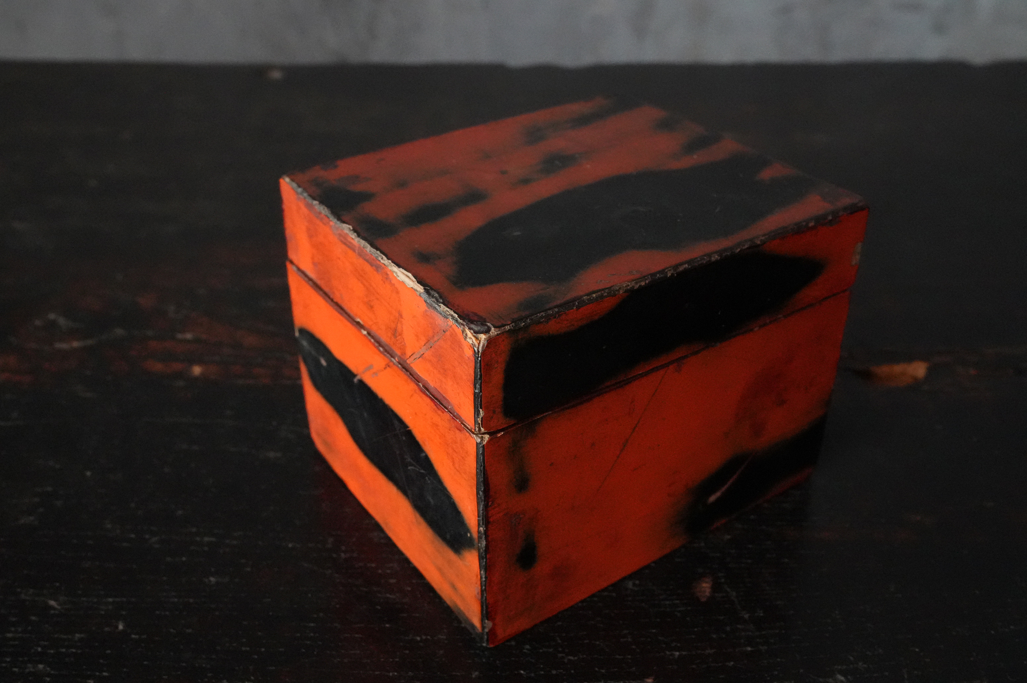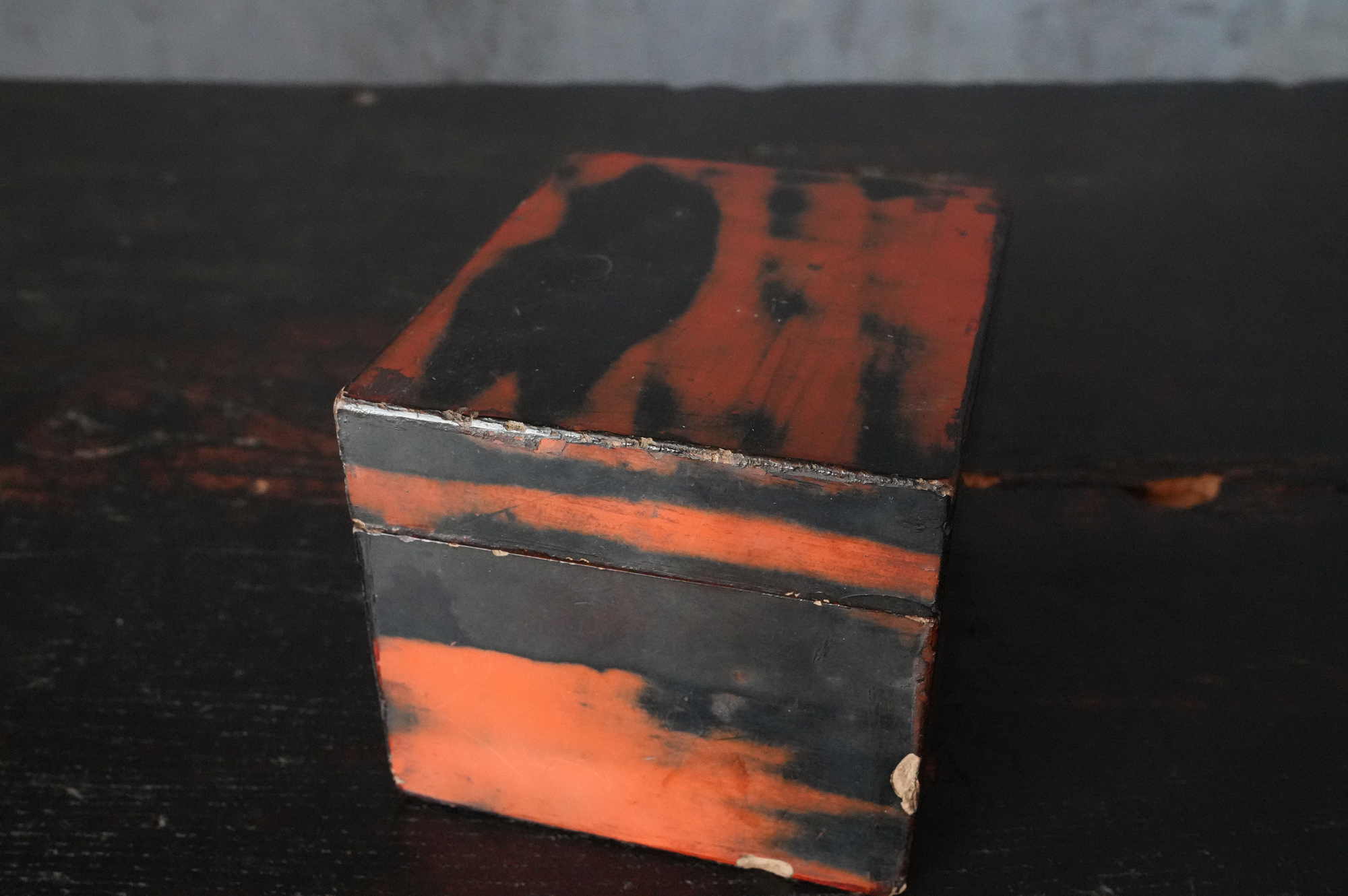 赤と黒のコントラストが印象的な根来の箱。おそらく識者が、根来の折敷などの古材を用い、自身の美意識に沿って新たに誂えたものではないでしょうか。指物の仕事も丁寧で、技術の高い職人の手によるものと思われます。