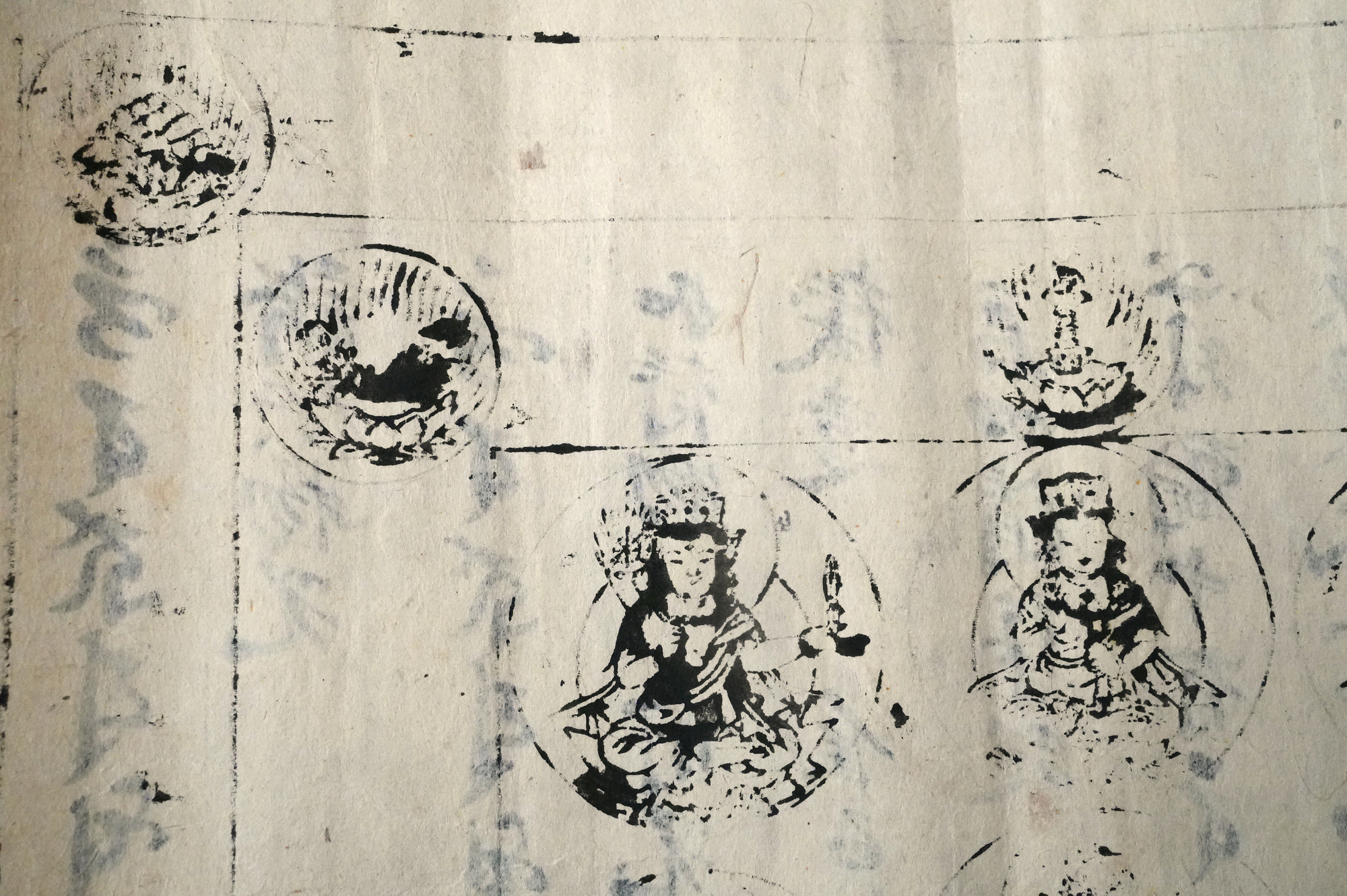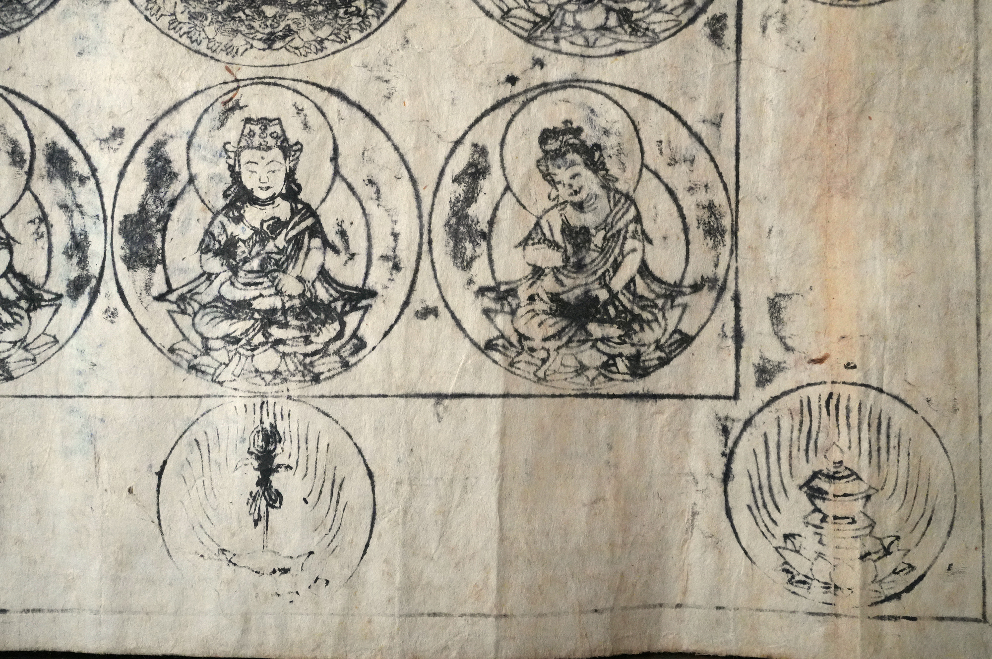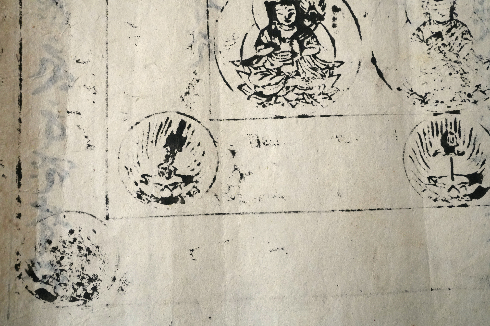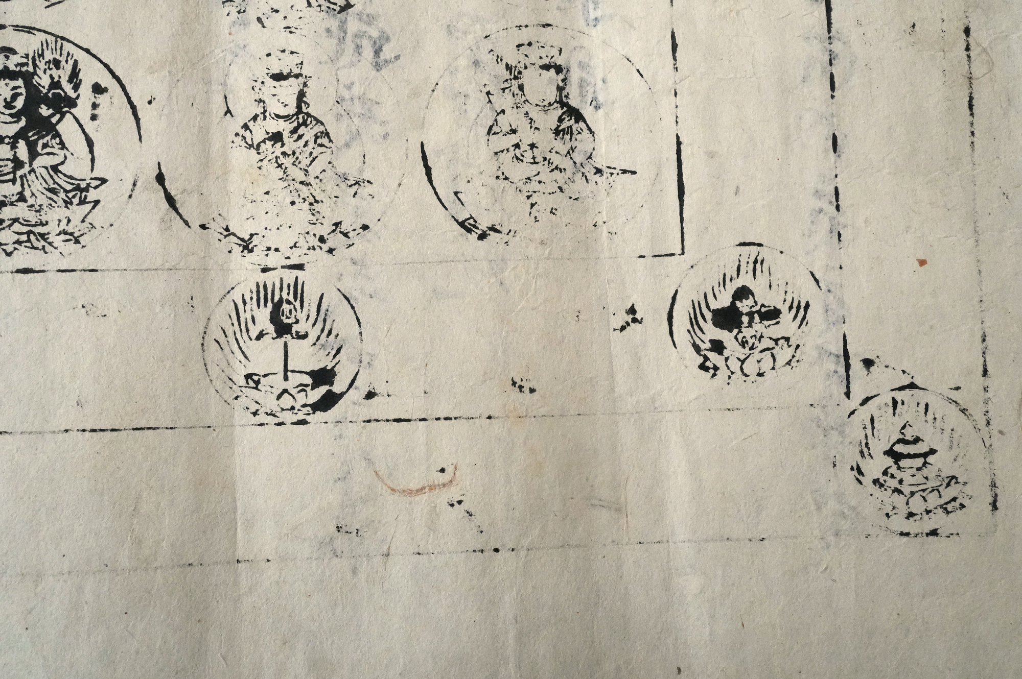 おそらく、もとは室町時代頃の文書で、役目を終えたのち、江戸時代に試し刷りとして曼荼羅が摺られたものではないかと考えられます。紙という素材が、時代をまたいで用いられた痕跡もまた、この品の魅力のひとつかもしれません。料紙そのものの趣、筆跡の気配、そして摺りの表情。それぞれが控えめで静かながらも魅力があります。額装すれば、空間の中でいっそう映えることでしょう。時代を経た紙の表情をご理解いただきつつ、お楽しみいただければ幸いです。
