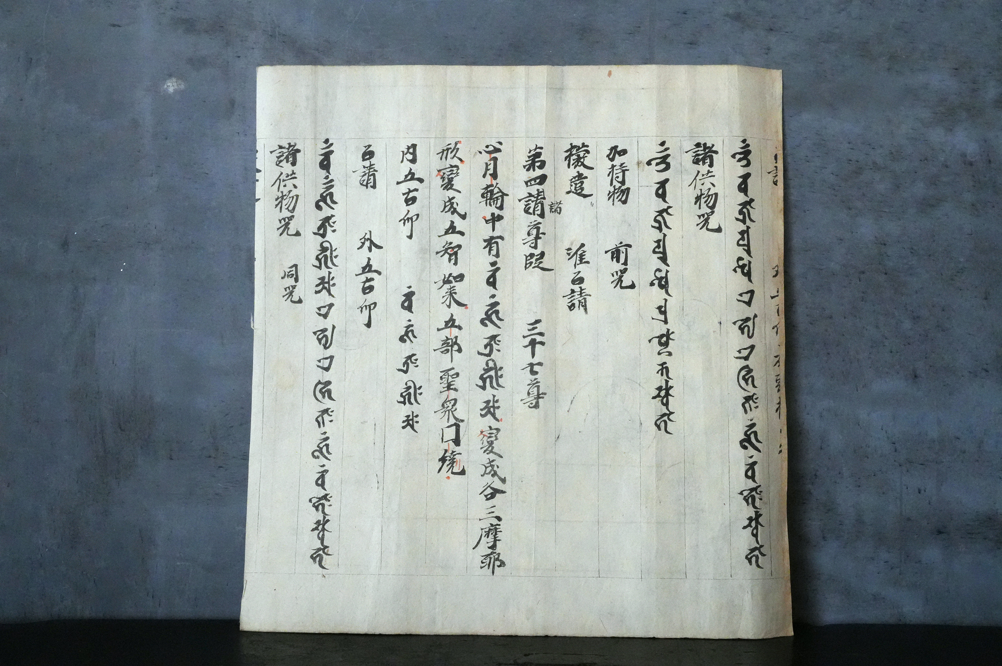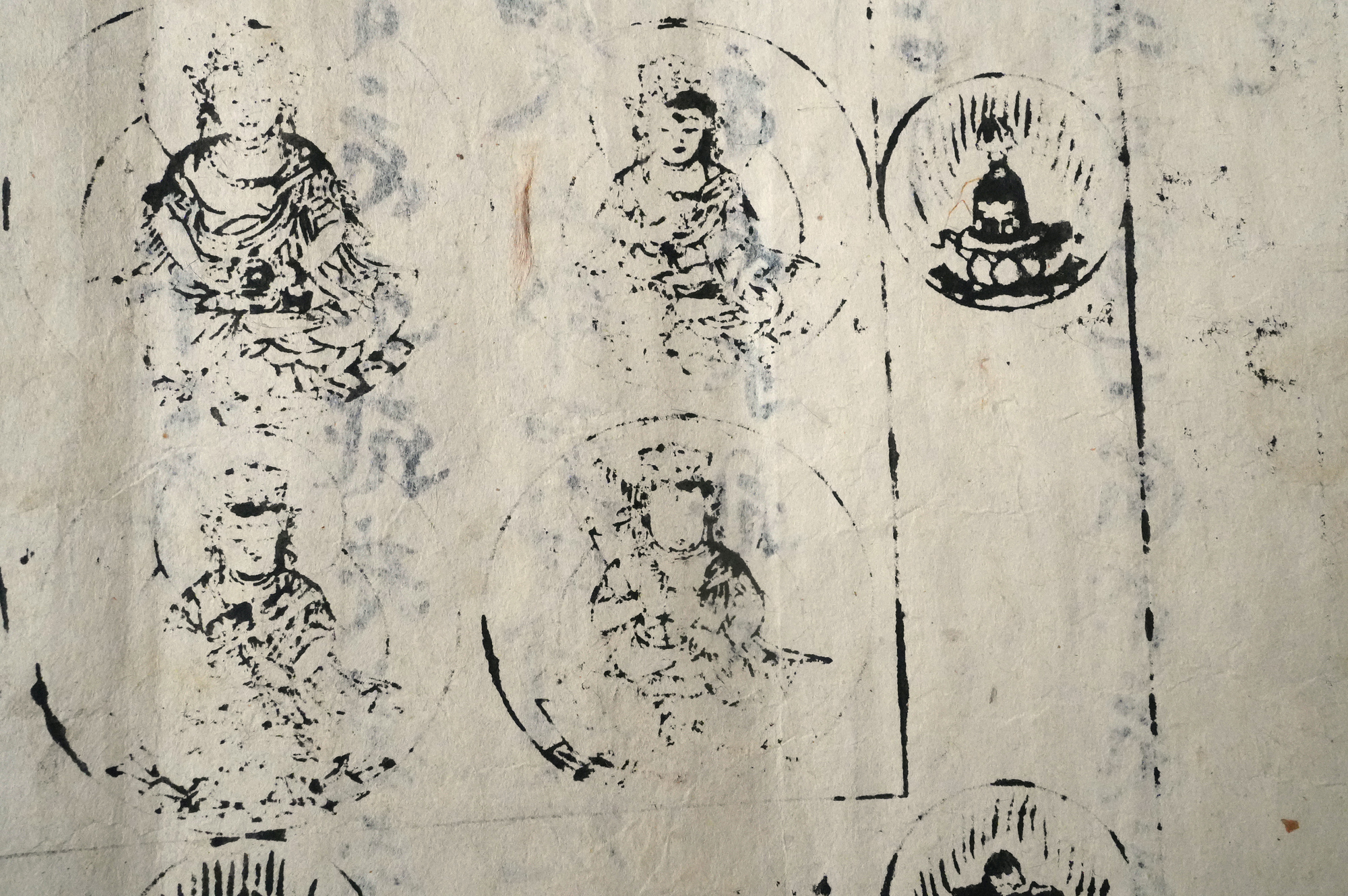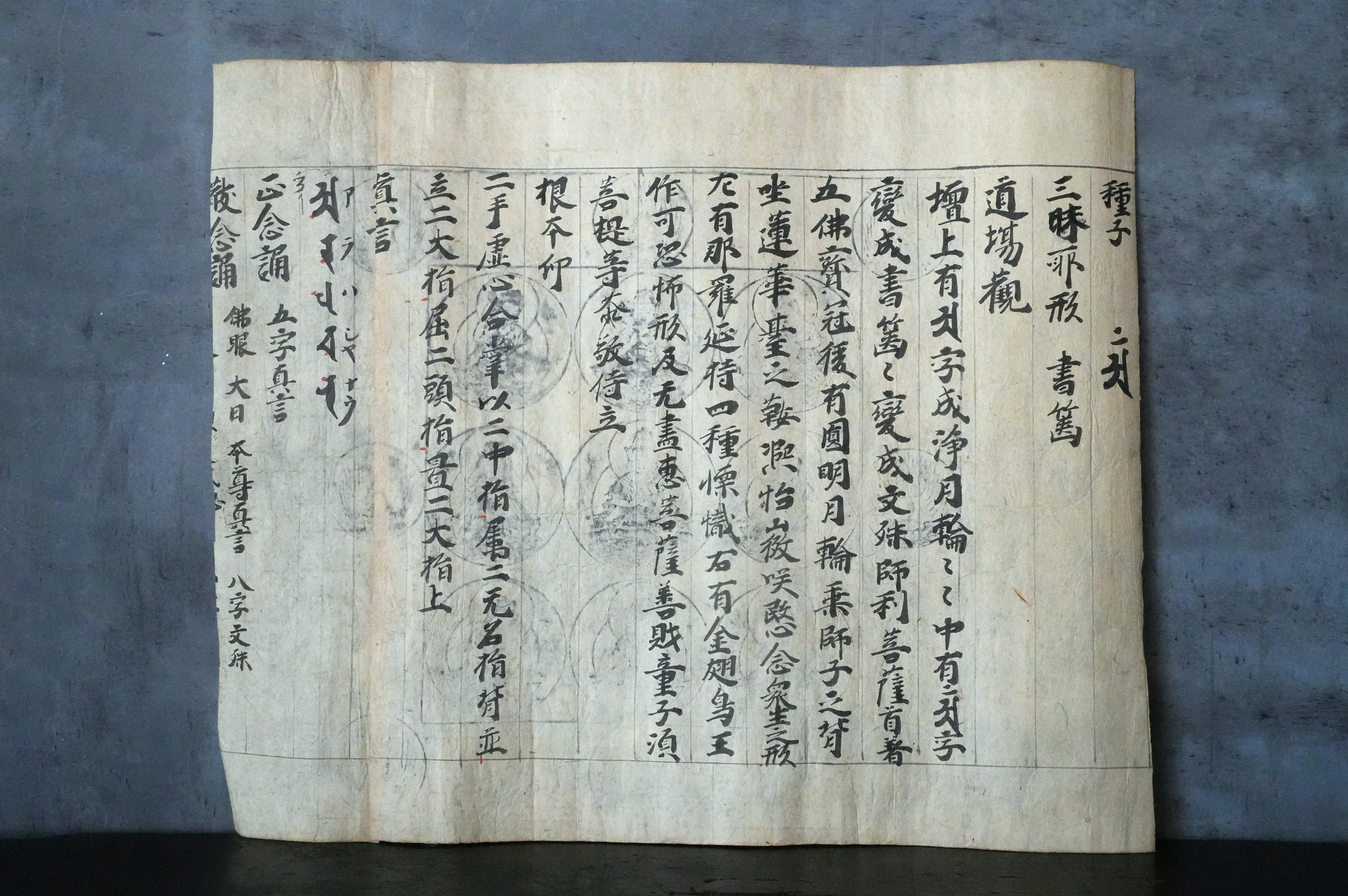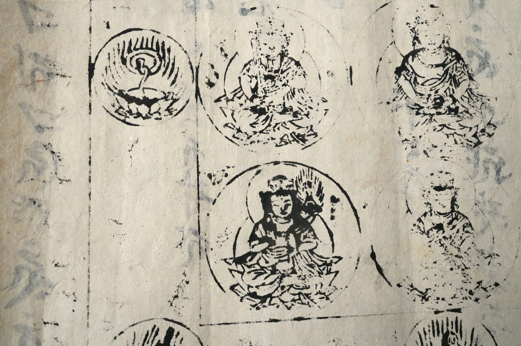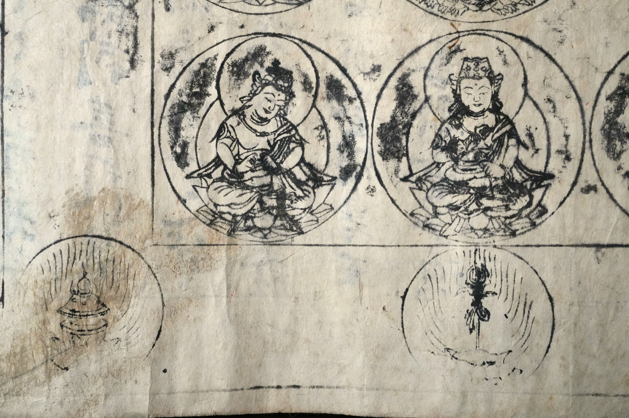 おそらく、もとは室町時代頃の文書で、役目を終えたのち、江戸時代に試し刷りとして曼荼羅が摺られたものではないかと考えられます。紙という素材が、時代をまたいで用いられた痕跡もまた、この品の魅力のひとつかもしれません。料紙そのものの趣、筆跡の気配、そして摺りの表情。それぞれが控えめで静かながらも魅力があります。額装すれば、空間の中でいっそう映えることでしょう。時代を経た紙の表情をご理解いただきつつ、お楽しみいただければ幸いです。