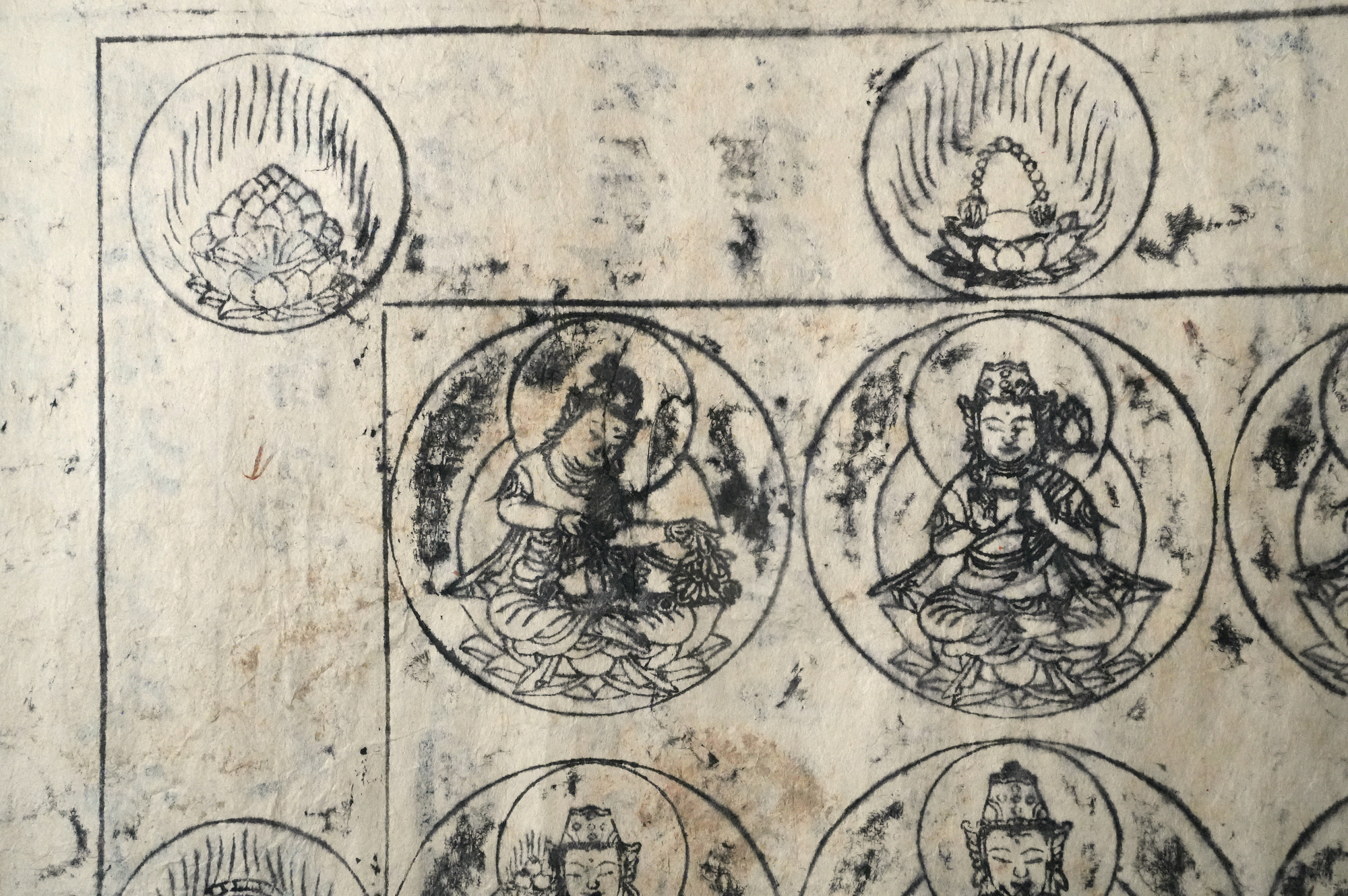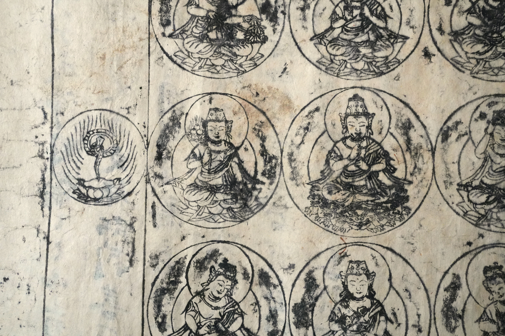 どちらに心が引かれるかは悩ましいところですが、ひと目の印象としては、やはり曼荼羅の図様が強く記憶に残るのではないでしょうか。墨のかすれや紙の風合いが重なり、静かな迫力を湛えています。