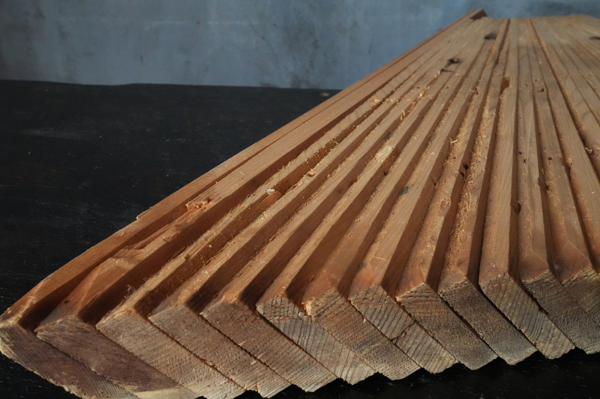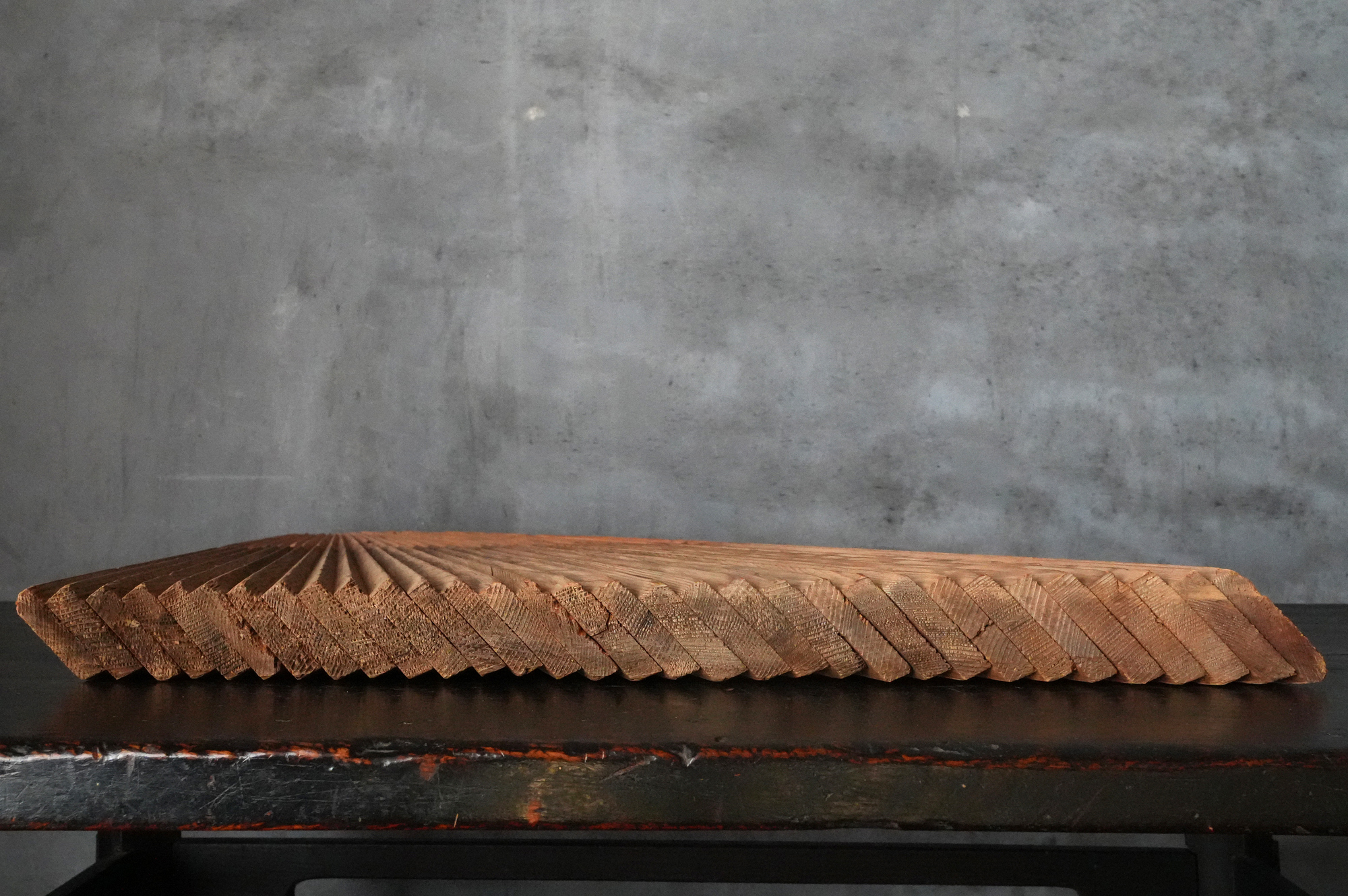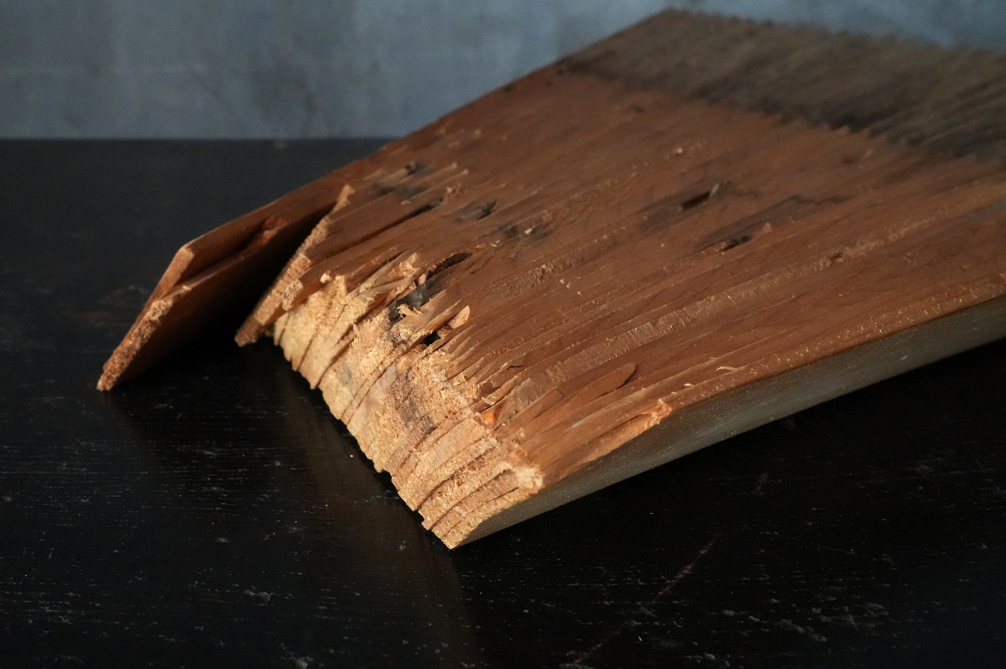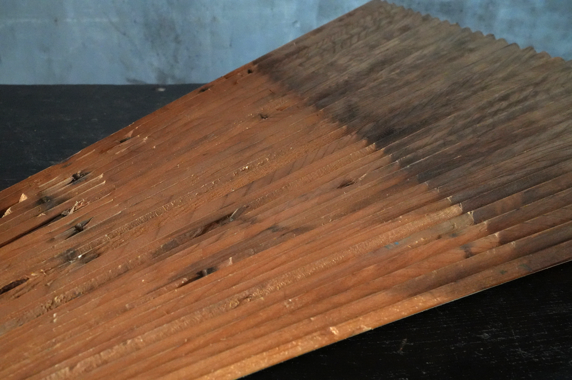 本品の箱には「薬師瑠璃光殿軒先管関古材」との記載が見られ、本堂に関わる部材と見て良いでしょう。現本堂は明治二十三年(1890)の建立ではありますが、本材は細かな板を幾重にも継ぎ合わせて構成されており、あまり見かけない興味深い造りをしております。