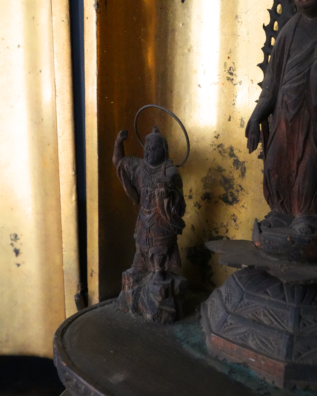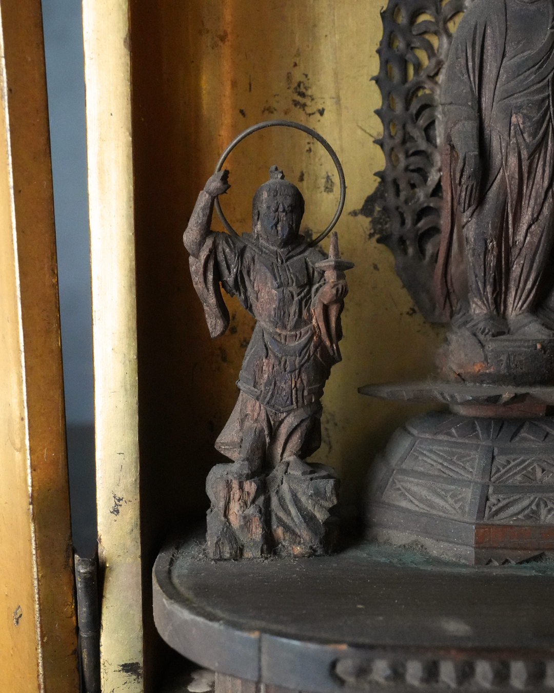 表面にはスレや小さな傷み、持物の欠損など経年による変化が見られますが古像らしい姿をよく留めています。三像の作風には共通する特徴があり、同一の作者、あるいは同系統の手によるものと考えて良いかと思います。