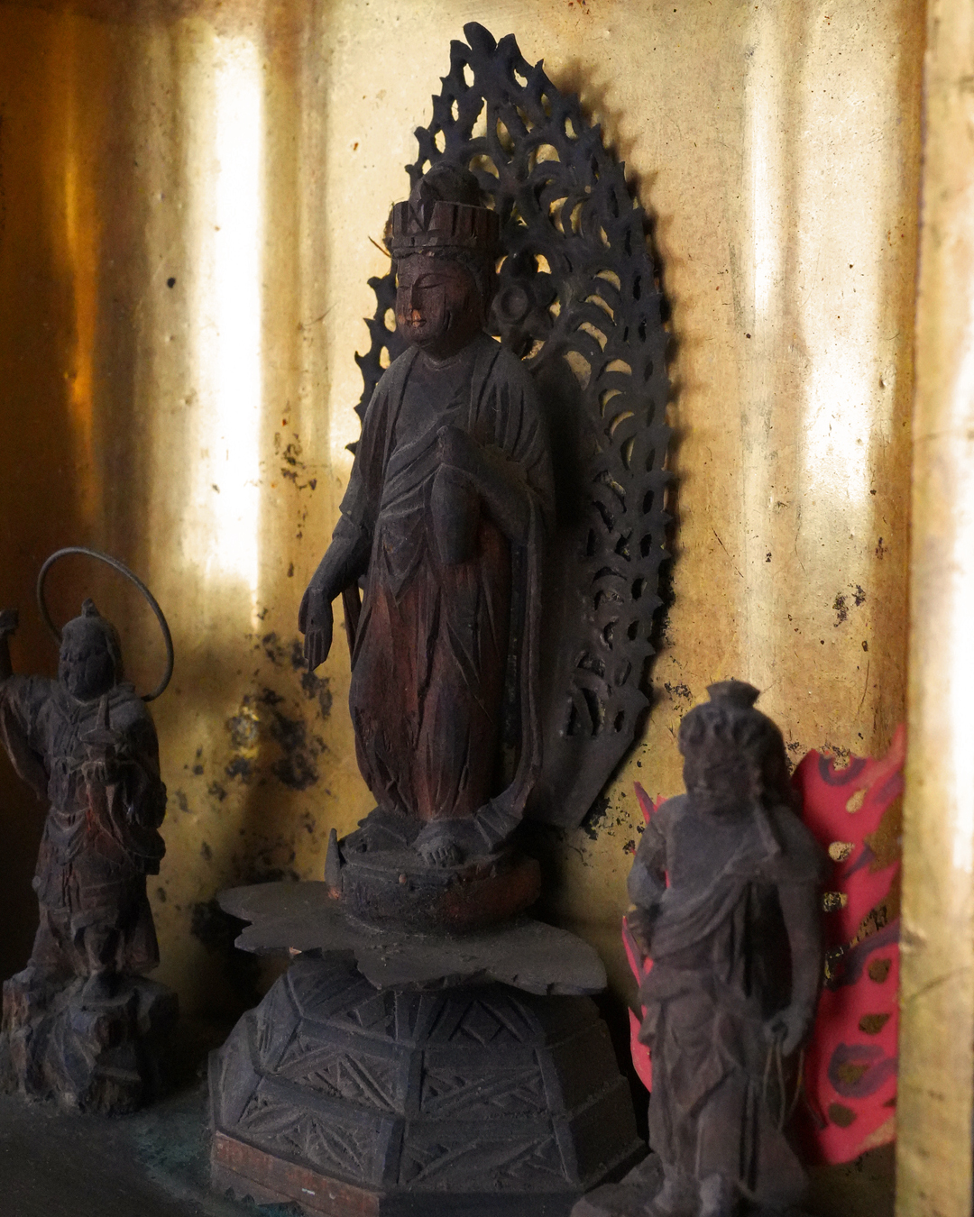 三像はいずれも小像ながら彫り口は丁寧で、表情や衣文にも落ち着いた趣があり、格調を感じさせます。念持仏として大切に伝えられてきたものでしょう。