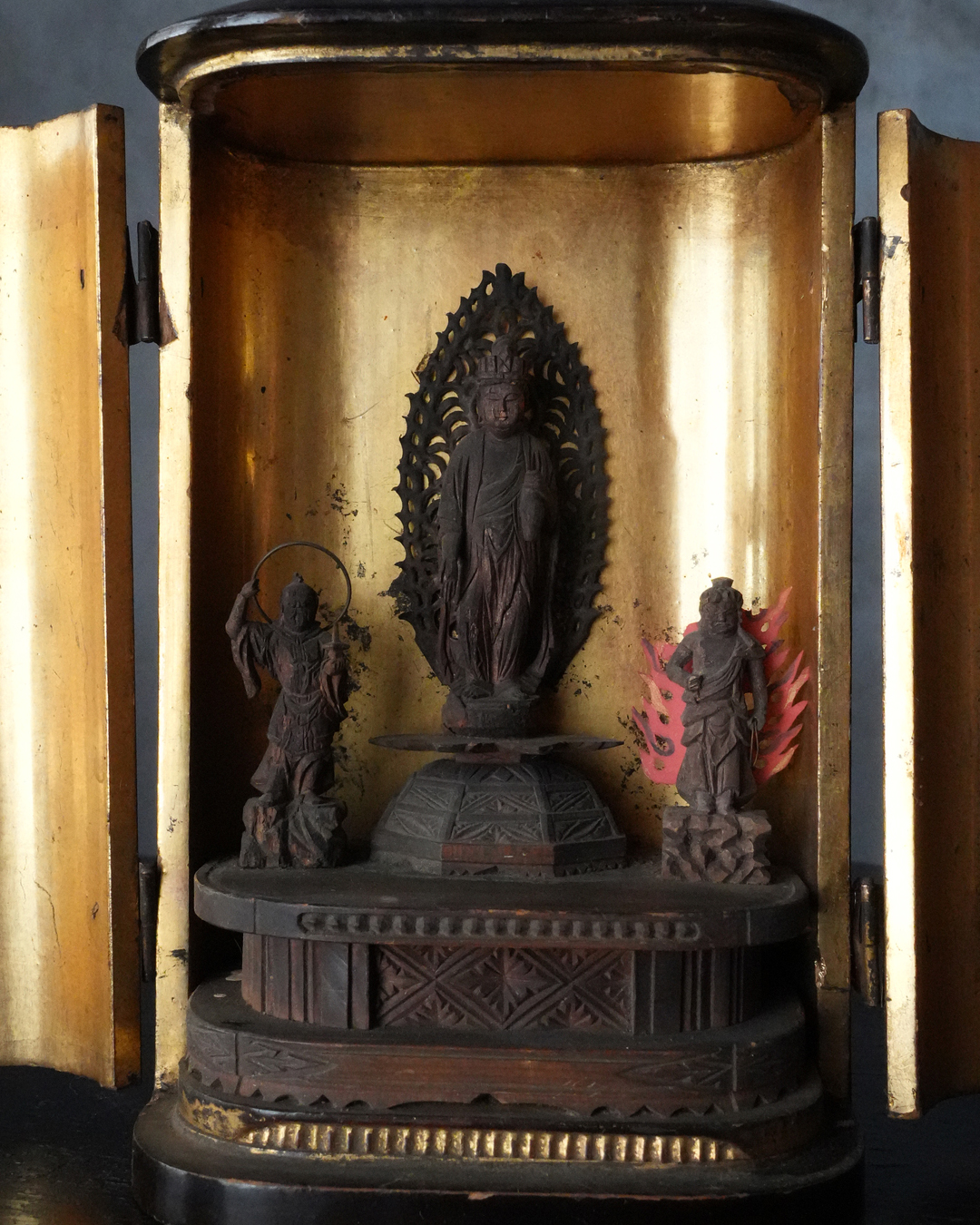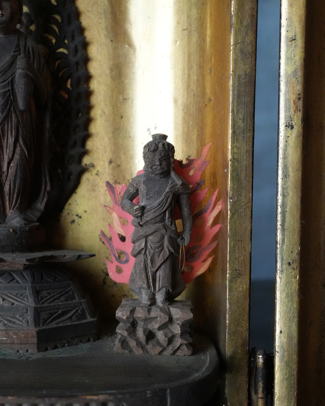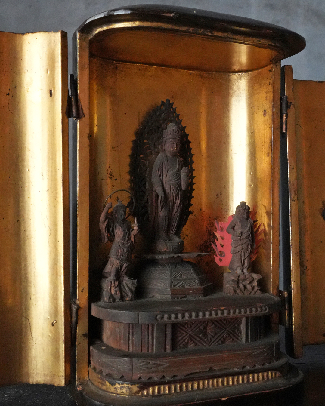収められている厨子は後の時代に整えられたもののようですが、小ぶりながら三尊を収める姿はよく調和しています。また、不動明王の欠損のある火炎光背は赤い紙で近年の後補と考えられます。しかしながら、像自体の様式や経年の様子から見て、少なくとも桃山から江戸初期頃に遡る作と考えられます。