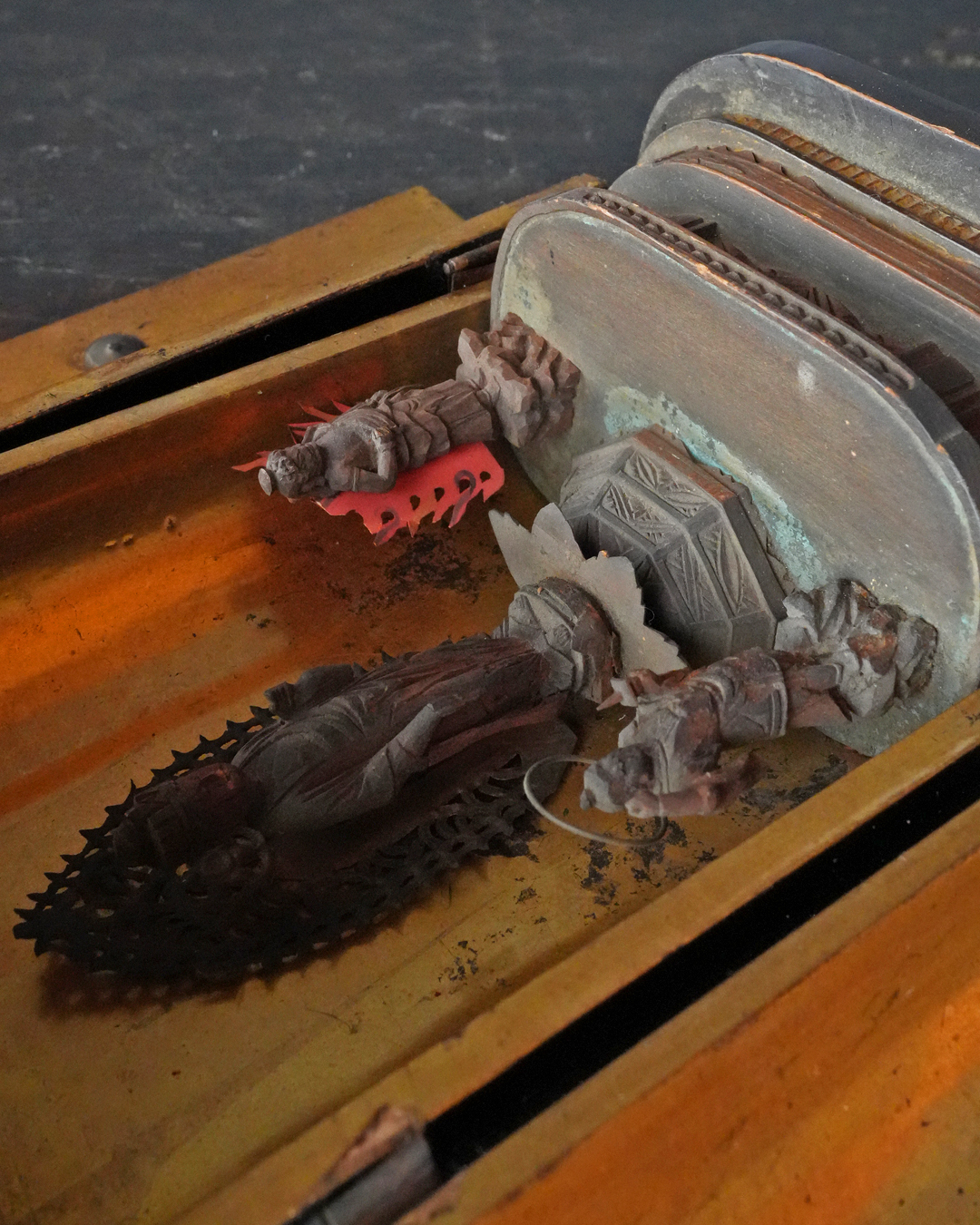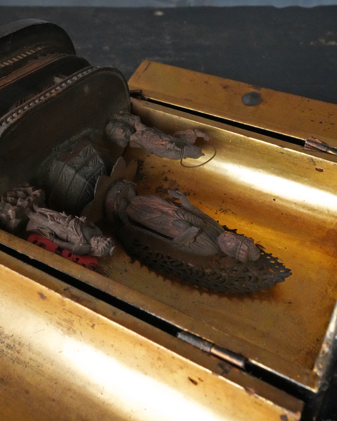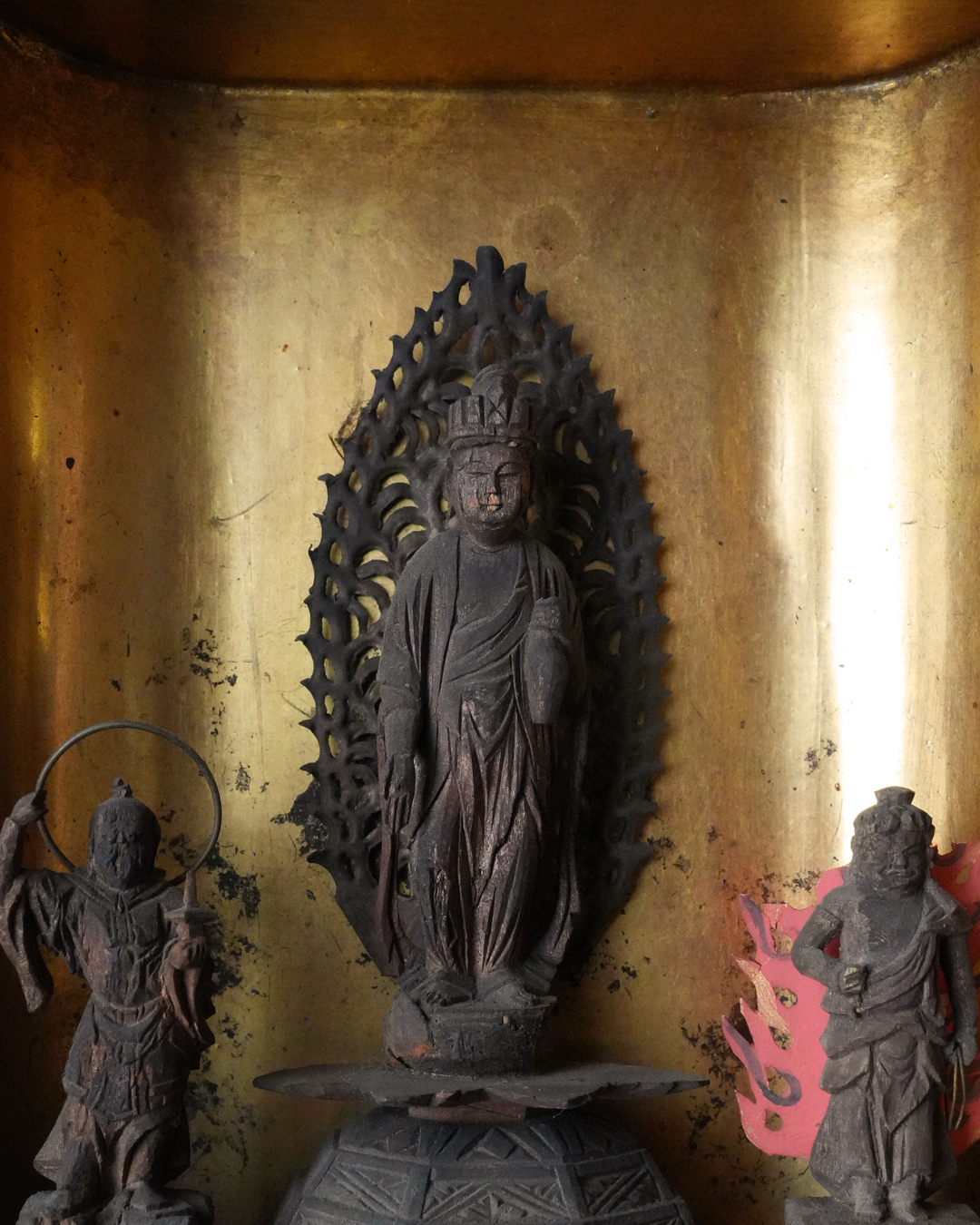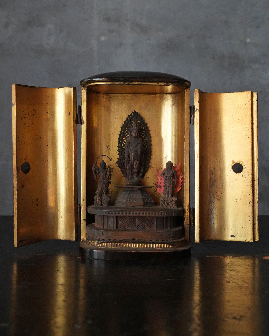 収められている厨子は後の時代に整えられたもののようですが、小ぶりながら三尊を収める姿はよく調和しています。また、不動明王の欠損のある火炎光背は赤い紙で近年の後補と考えられます。しかしながら、像自体の様式や経年の様子から見て、少なくとも桃山から江戸初期頃に遡る作と考えられます。