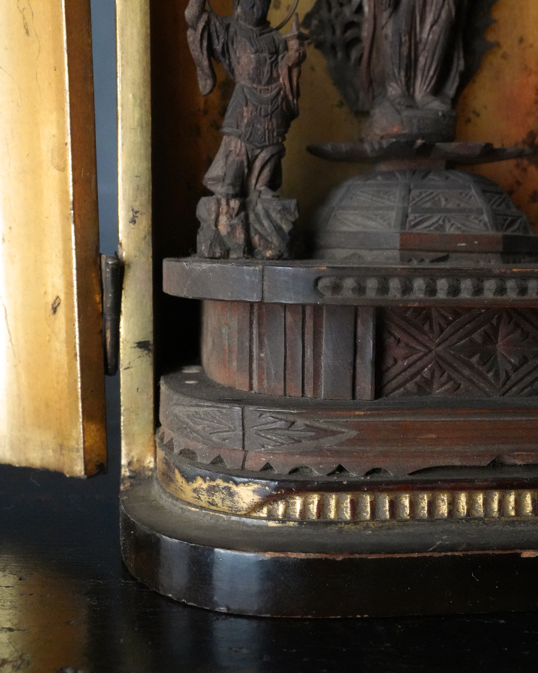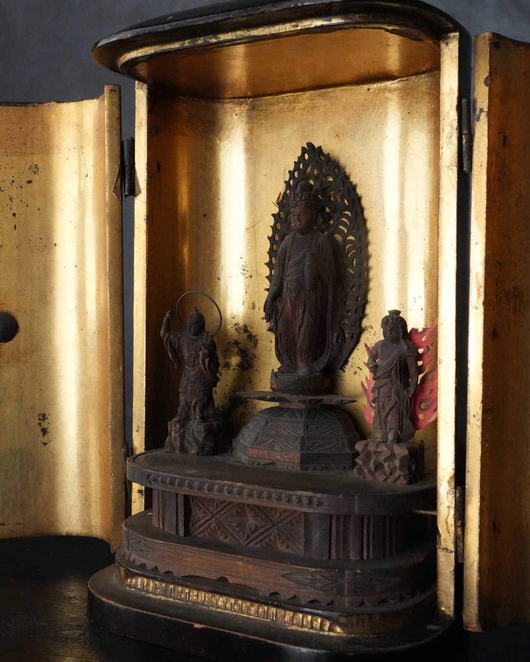 小型の厨子に収まる天台形式の三尊像は意外に目にする機会が少なく、静かな存在感を備えた一組です。状態につきましては、スレや小傷、持物の欠損などございますので、詳細は画像にてご確認ください。